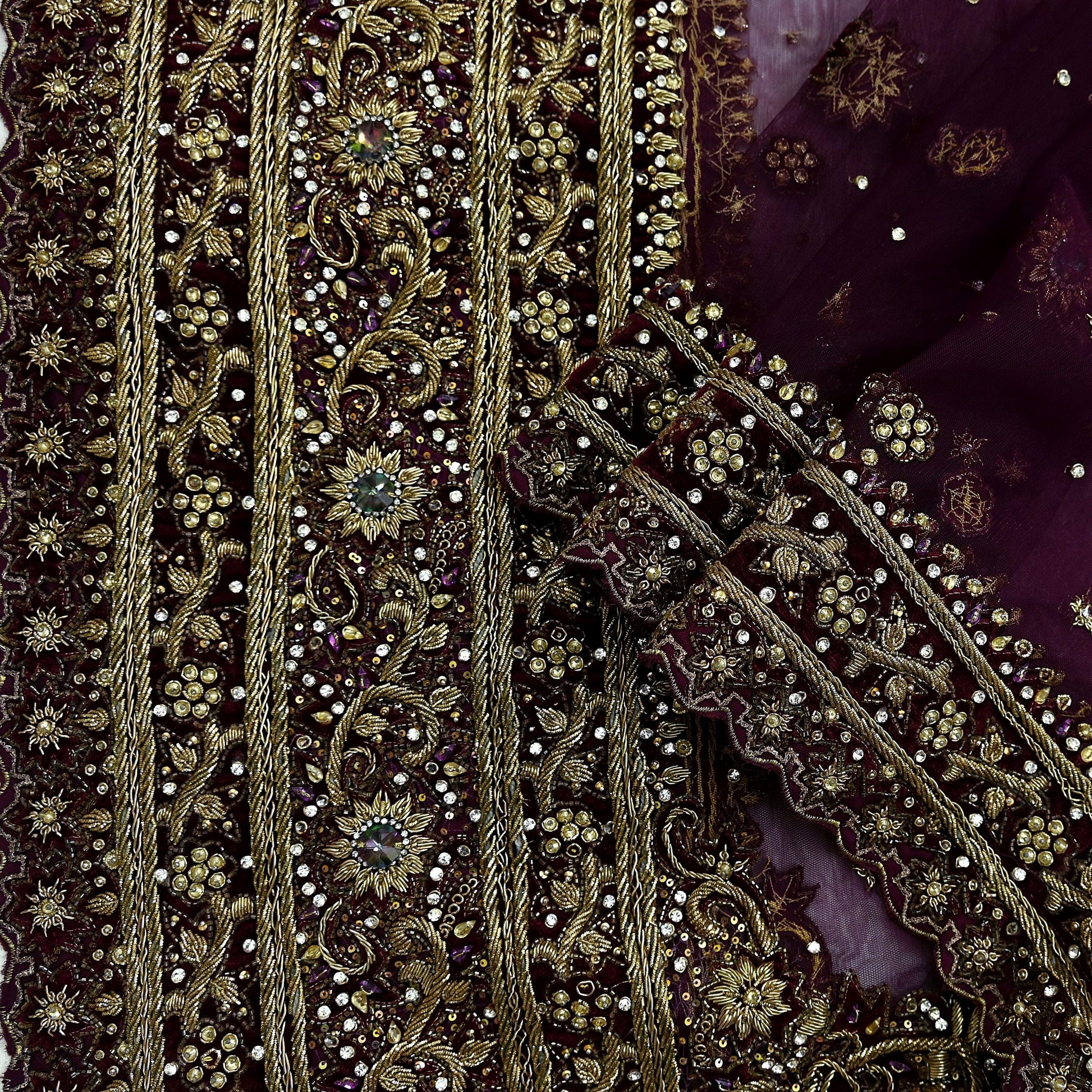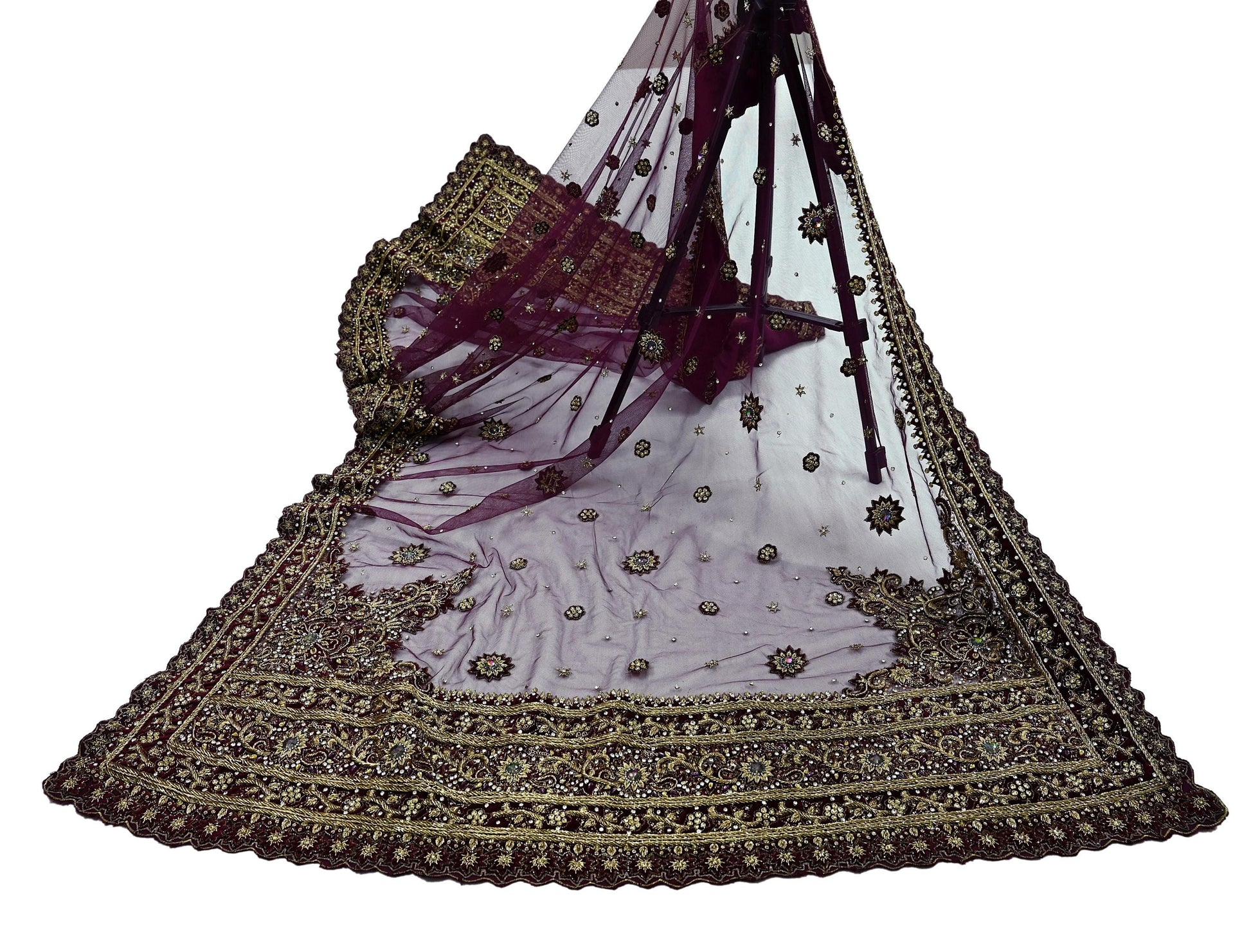 Stunning Beautiful Heavy Dupatta Hand Embroidered Net Dupatta/Stole In Purple Color Fabric. This one of a kind item is difficult to express in words. Border feature is floral & Paisley design embroidered pure metallic Golden zardozi/ Dabka, Zari, White & Multi stone And Black Glass Beaded, White & Purple beaded, Purple Thread work embellished work is the highlight of the dupatta. Also you can see similar Zardozi, Beaded work with floral pattern in center part adds to its beauty. Maroon Velvet Border work is giving a fabulous look to the dupatta. Awesome one !!!