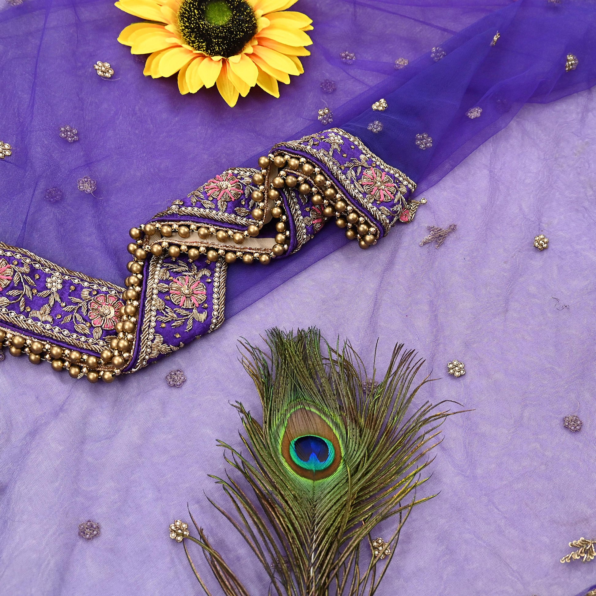 Stunning Beautiful Heavy Dupatta Hand Embroidered Net Dupatta/Stole In Purple Color Fabric. This one of a kind item is difficult to express in words. Border feature is floral & Paisley design embroidered pure metallic golden zardozi/dabka work, golden zari, golden sequins, Golden glass beads, Pink thread work embellished work is the highlight of the dupatta. Also you can see similar Zardozi, Beaded work with floral pattern in center part adds to its beauty. Purple Raw Silk & Golden Beaded Border work is giving a fabulous look to the dupatta. Awesome one !!!