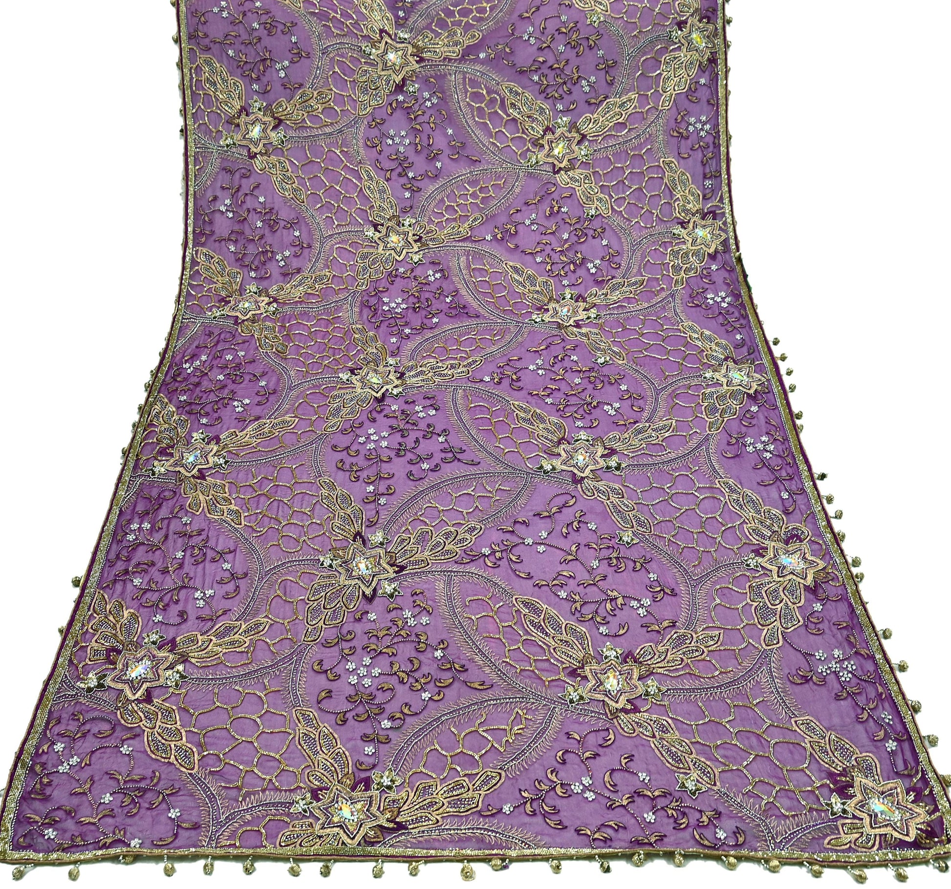 Step into timeless elegance with this one-of-a-kind hand-embroidered dupatta, crafted from pure georgette silk in a graceful purple hue. This masterpiece features an opulent golden hanging border adorned with intricate floral embroidery done in golden Zardozi, Dabka, and Zari work, beautifully accented with purple thread, white stones, golden & purple sequins, and golden glass beading—each element adding rich dimension and texture.
