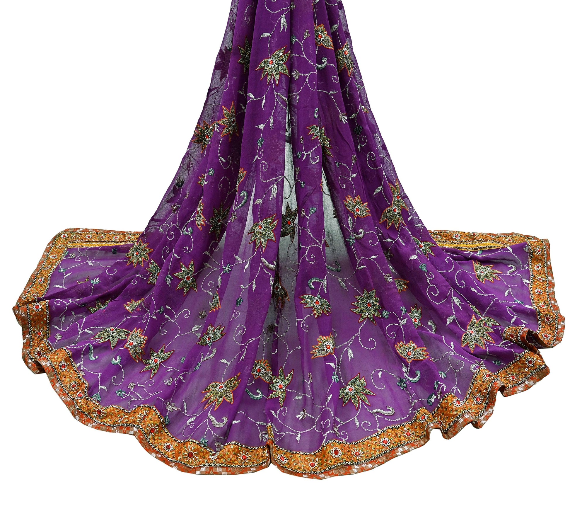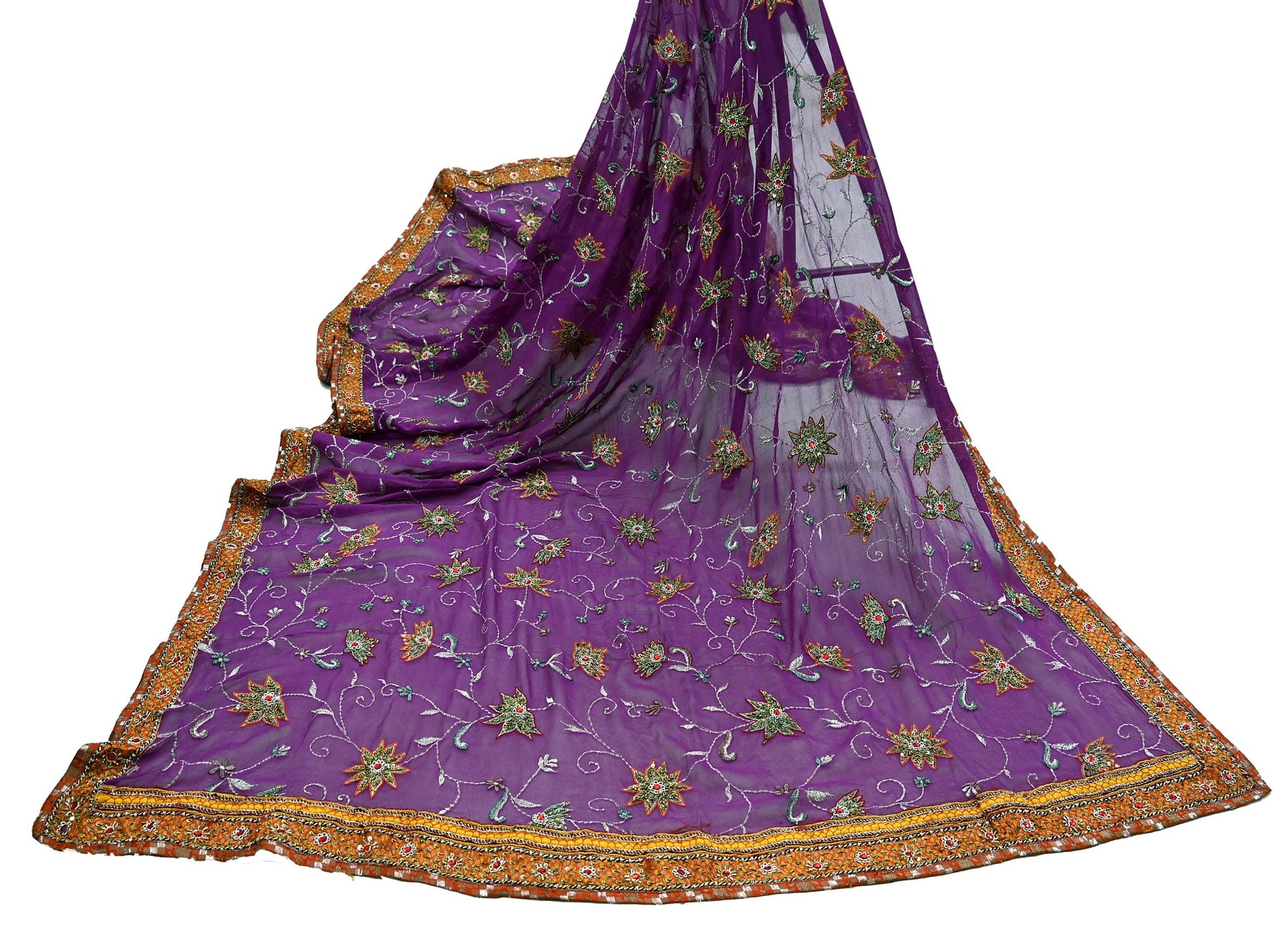 Experience timeless grandeur with this exquisite vintage dupatta in deep purple, crafted from 100% pure georgette silk. A true heirloom piece, it showcases intricate floral embroidery on the borders, embellished with pure metallic golden & silver zardozi, dabka, zari, golden & copper sequins, glass beads, multicolored threads, and striking red stones—every detail speaking of masterful craftsmanship.