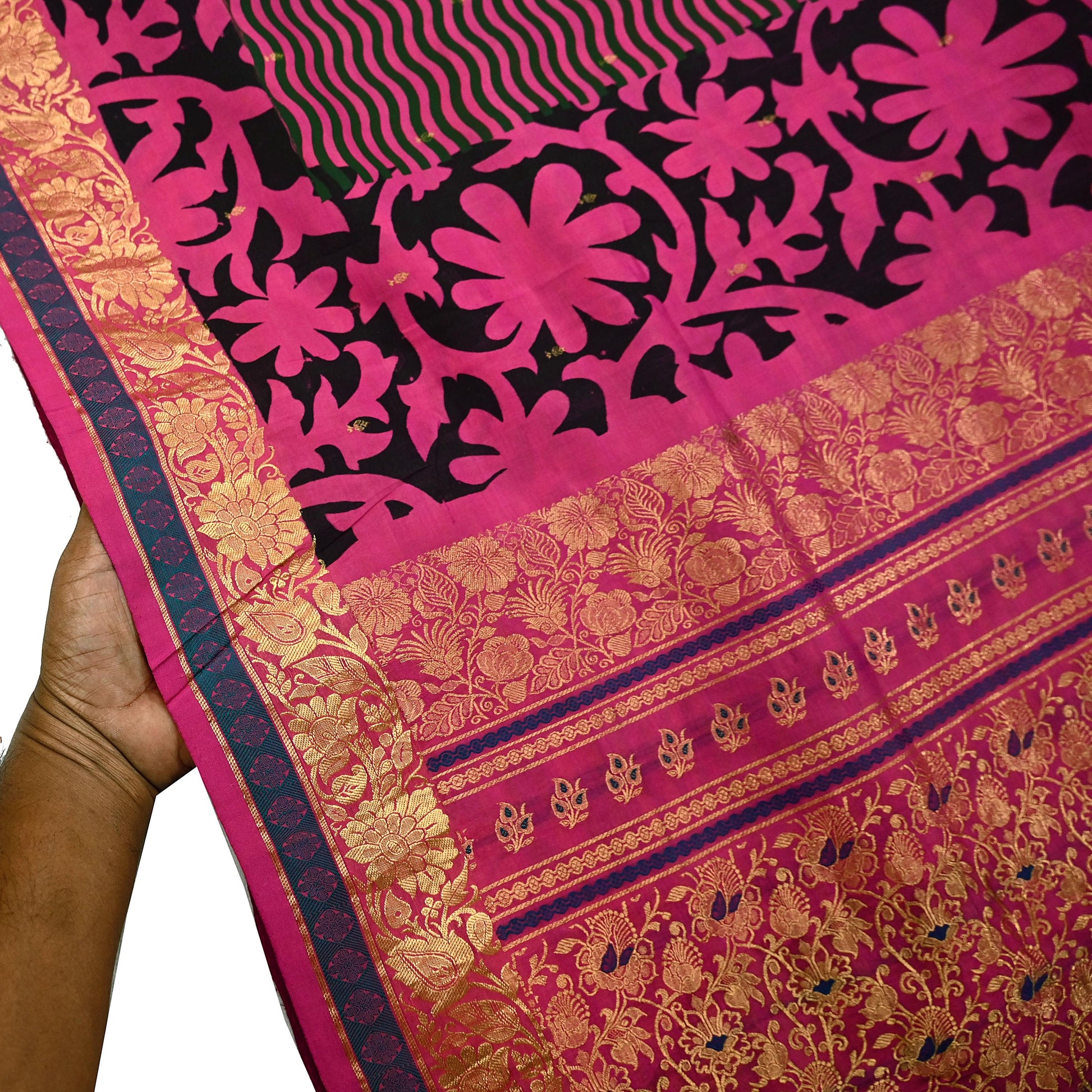 *pallu & border sari features Floral Motif Design with Green Woven Thread, Golden Metallic Zari work.