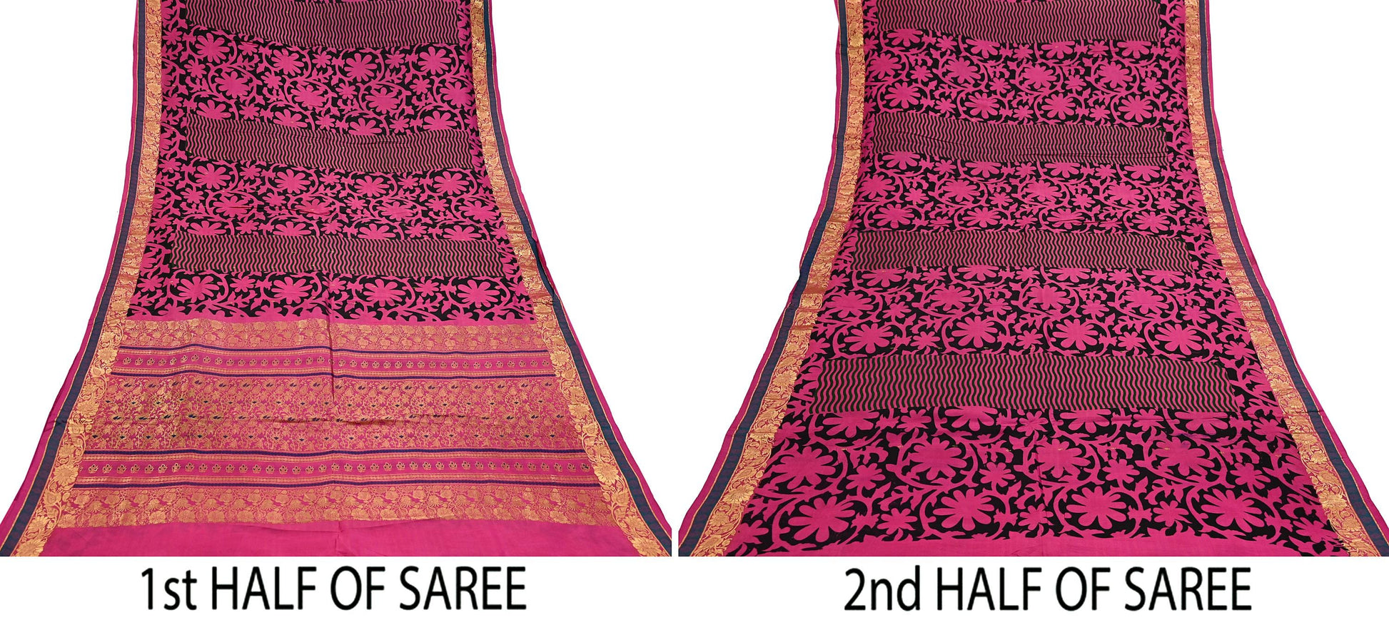 Indian Vintage Heavy Saree Pink & Black Hand Woven Kanjivaram 100% Pure Silk Sari Fabric 5Yard Ethnic Zari