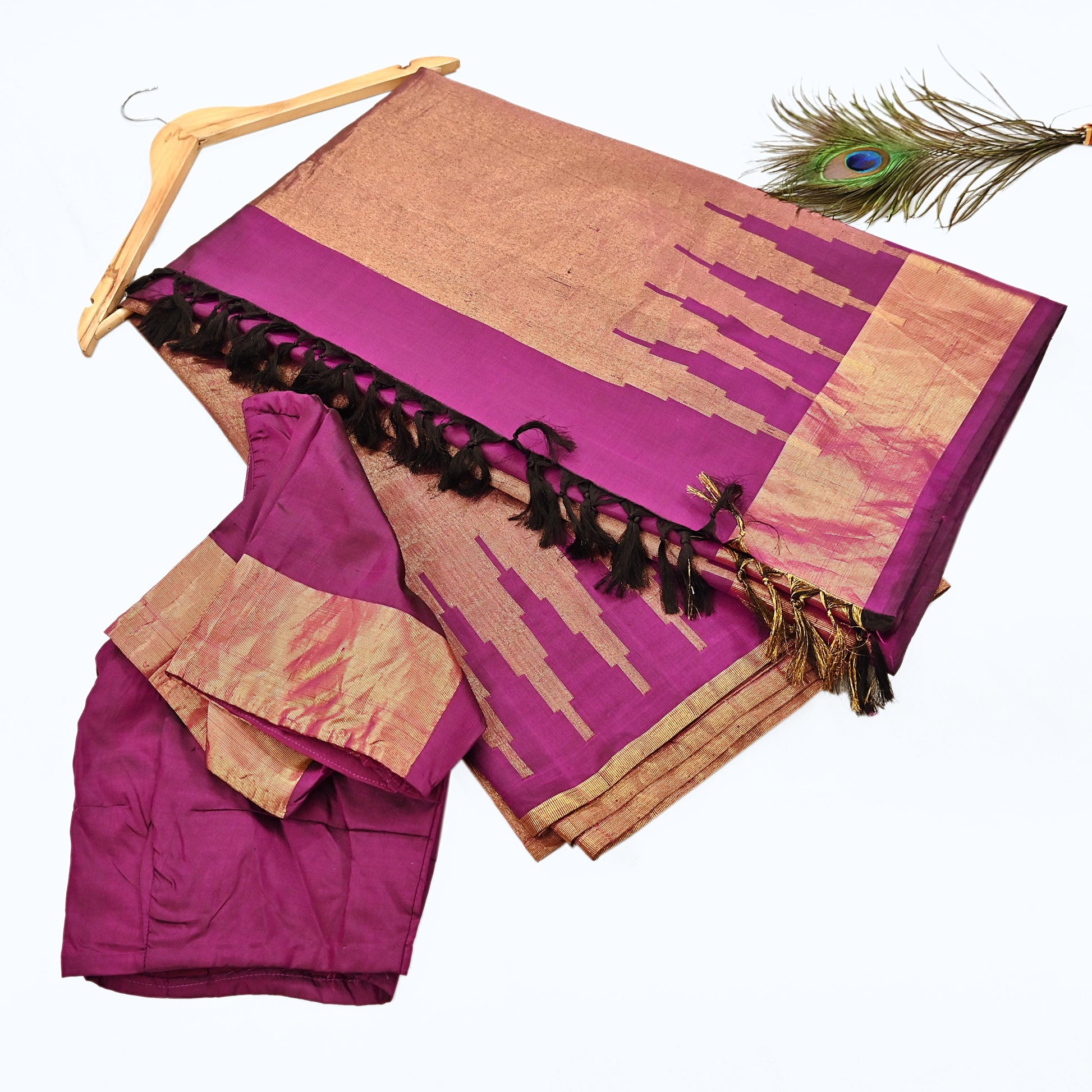 *The pallu & border sari features Temple design embellished with metallic Golden woven zari Border work. Also you can see similar work with Temple Woven Work in center part adds to its beauty. Fringes On pallu work is giving a fabulous look to the sari. Awesome one !!!