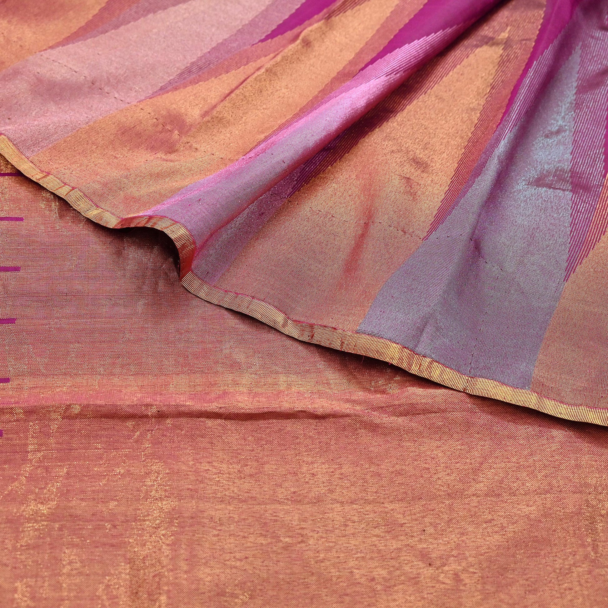 A Kanjivaram sari is a type of sari traditionally made by weavers from Kanchipuram located in Tamil Nadu, in south India. A Kanjivaram sari is distinguished by its wide contrast borders. The border color and design are usually quite different from the body. If the pallu has to be woven in a different shade, it is first separately woven and then delicately joined to the Sari.[6] The part where the body meets the pallu is often denoted by azig zag line. Suns, moons, chariots, peacocks, parrots, swans, lions, coins, mangoes, leaves and many such motifs are woven into Kanchipuram patterns.