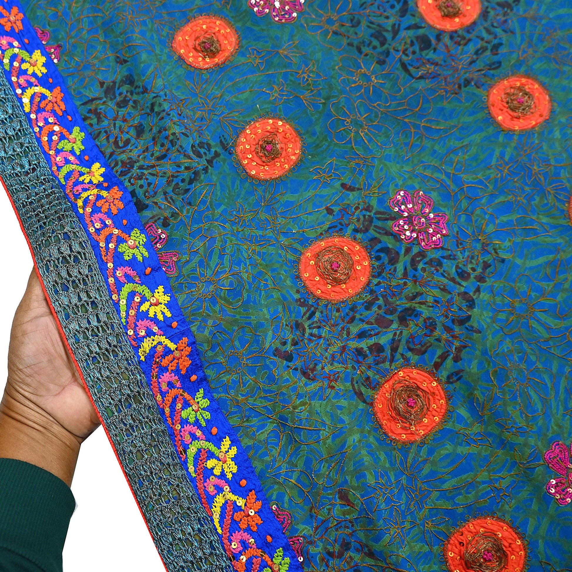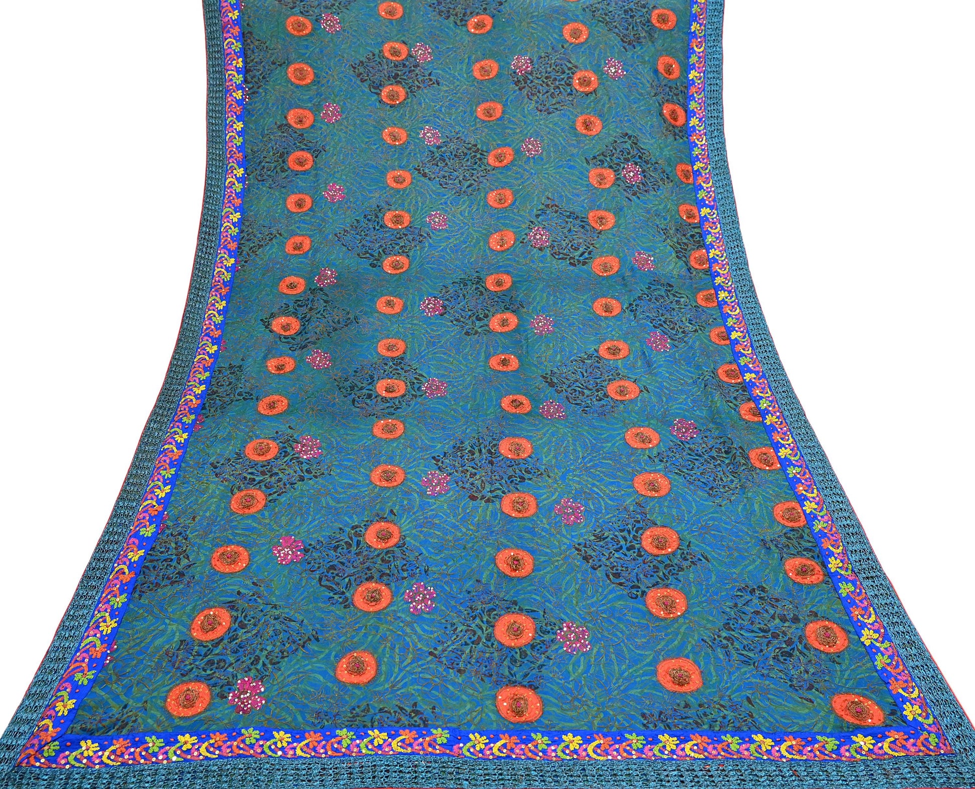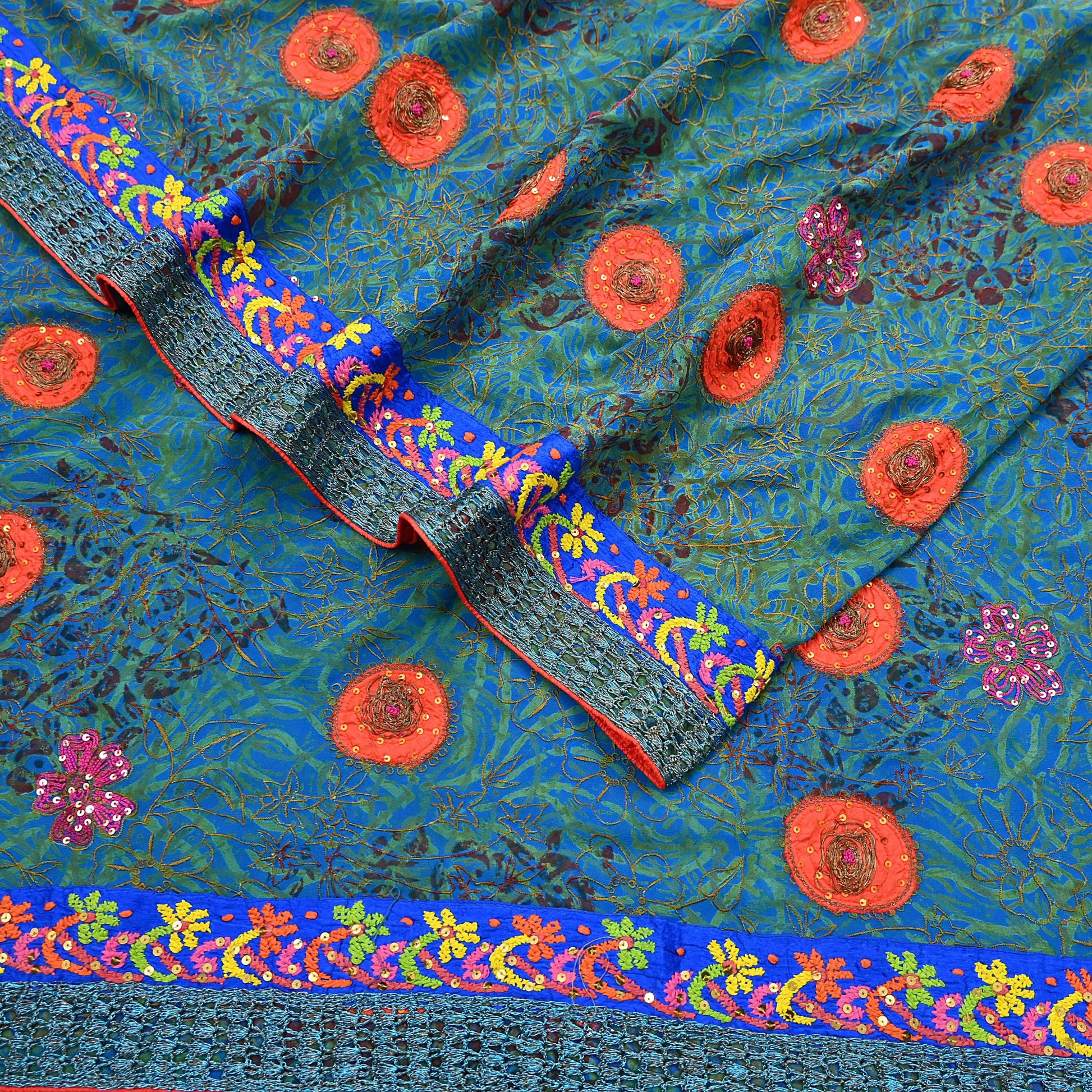 Indian Vintage Heavy Sarees Green & Blue Pure Georgette Silk Hand Embroidered Sari Fabric 6Yd Sewing Ethnic Wedding saree with blouse fabric