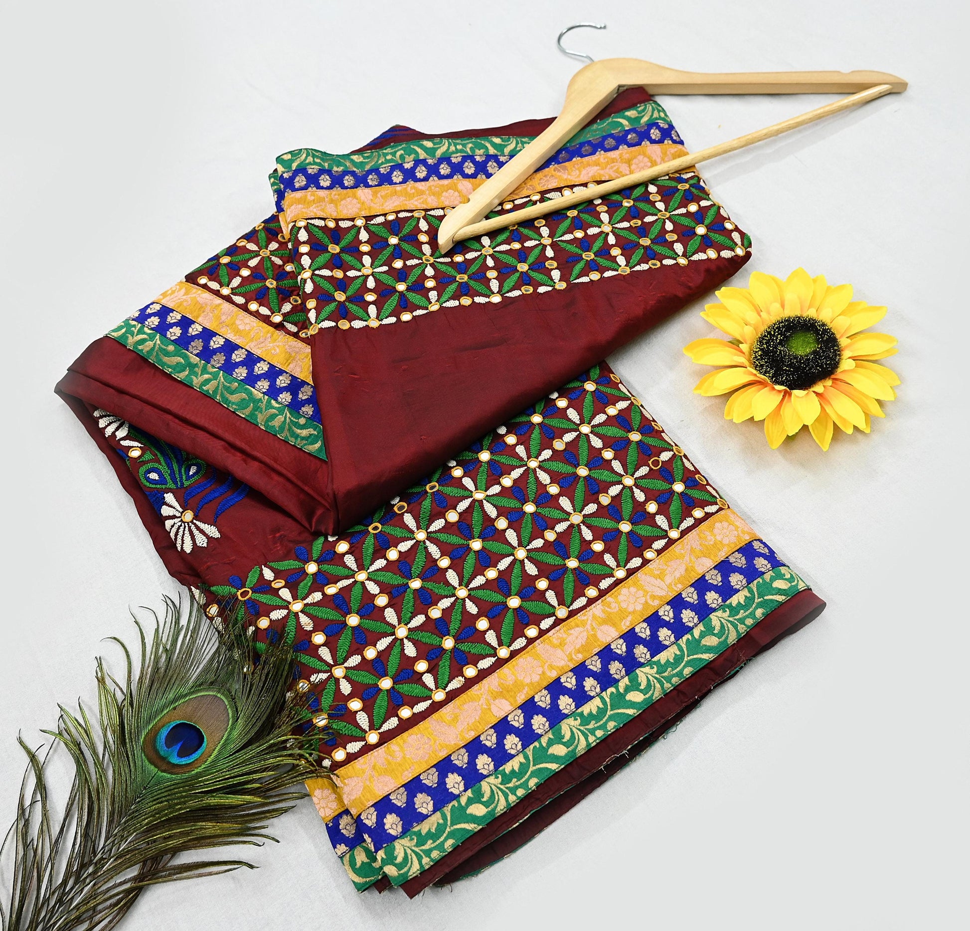 *Vintage Heavy Beautiful Maroon Colored Hand Embroidered Kutch work Pure Silk Sari.