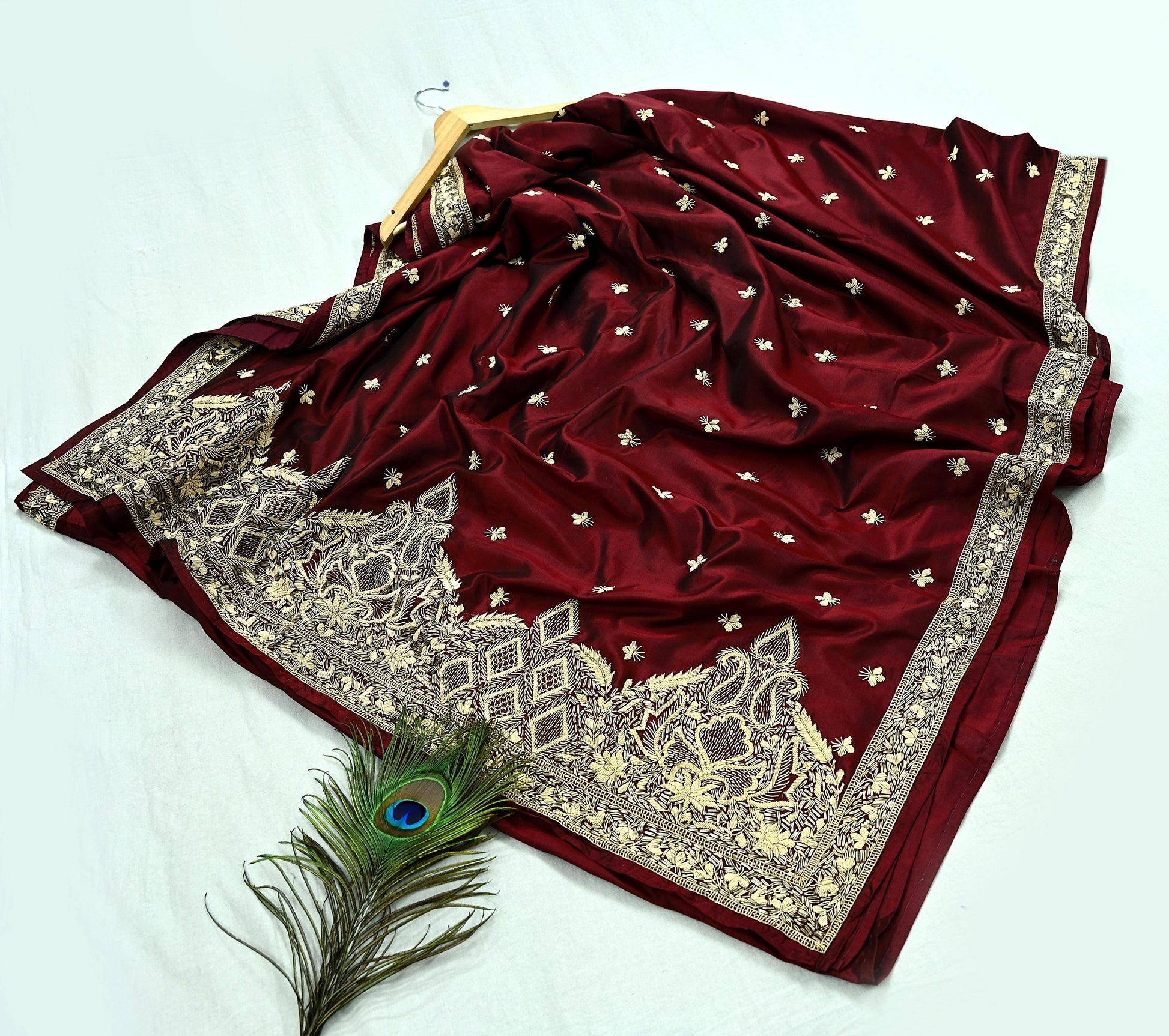 *Vintage Heavy Beautiful Maroon Colored Hand Embroidered Pure Silk Sari.