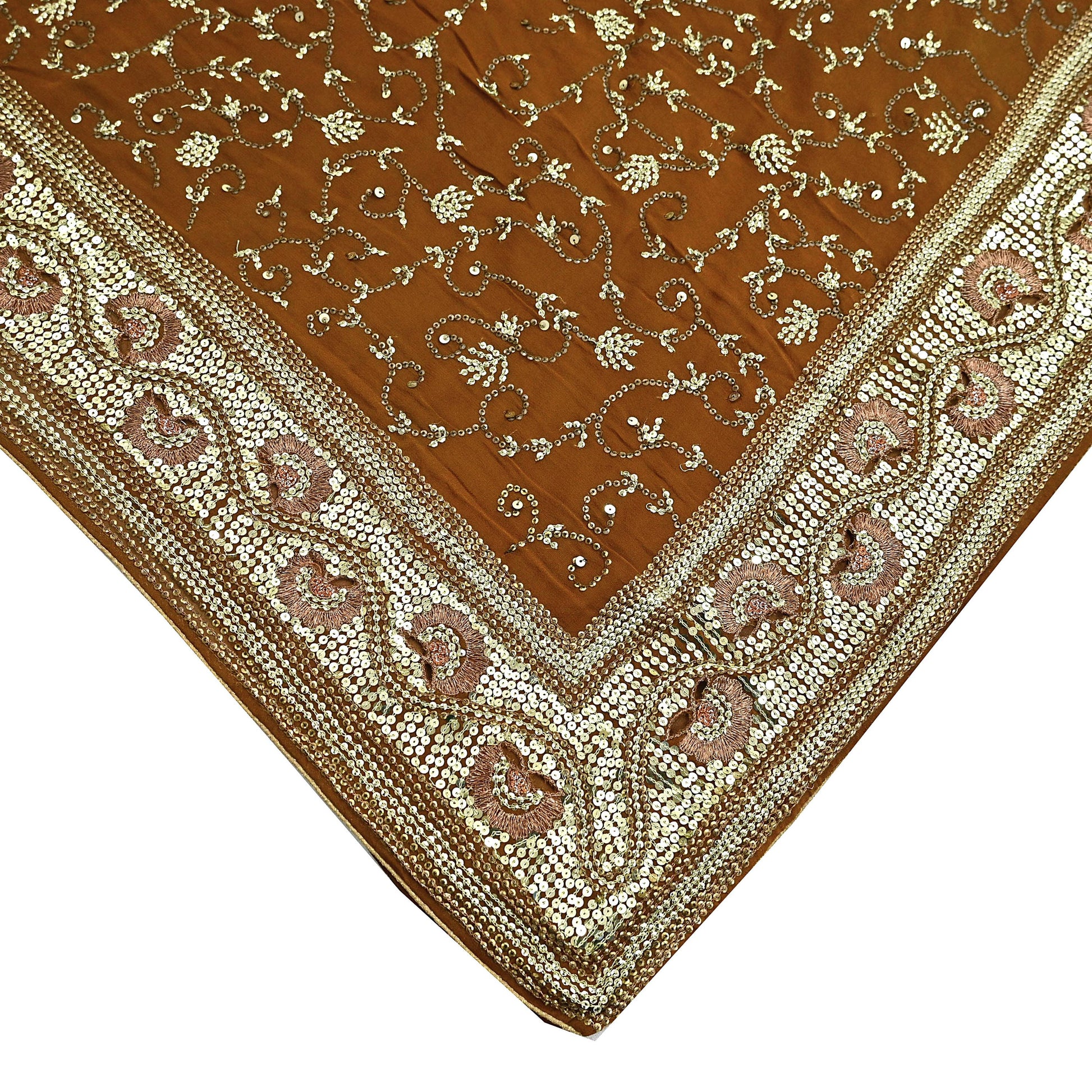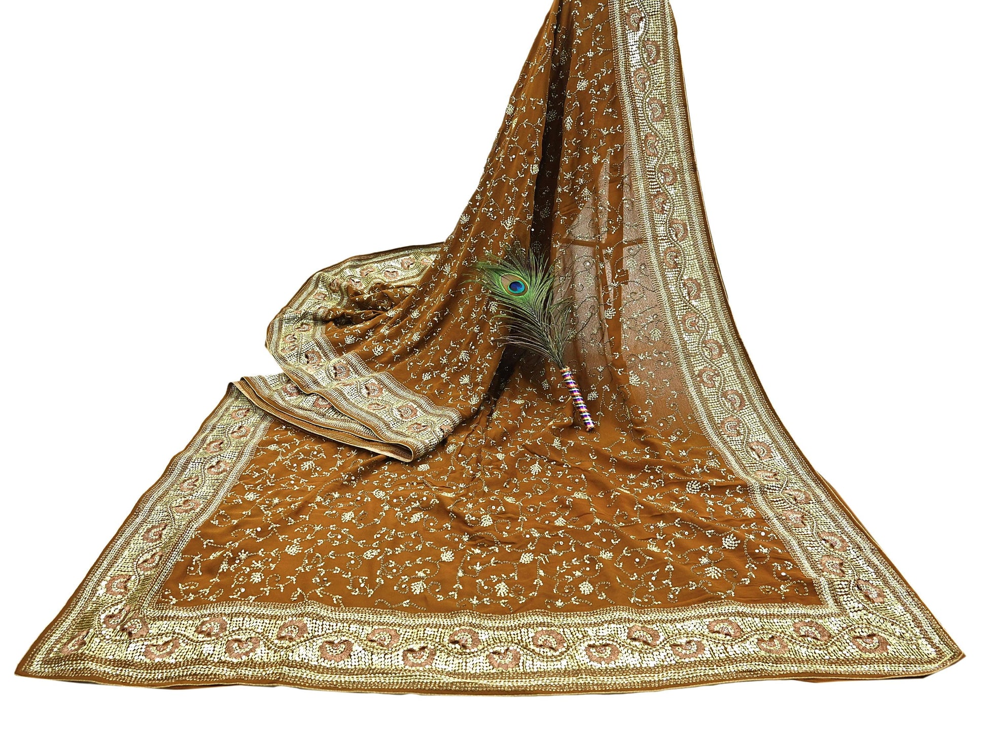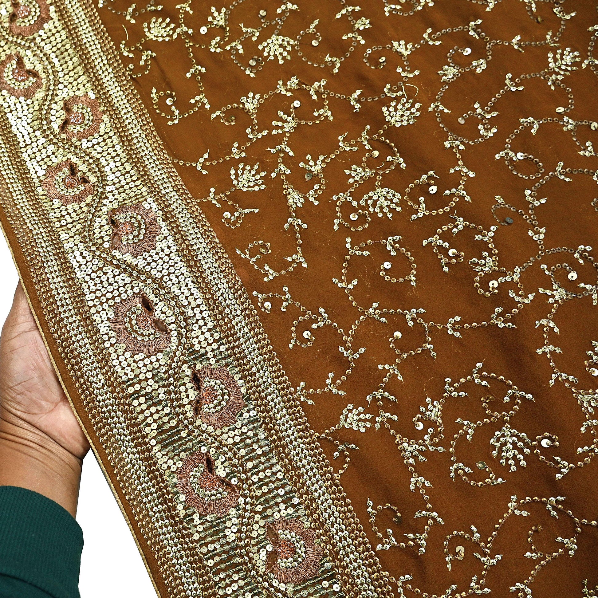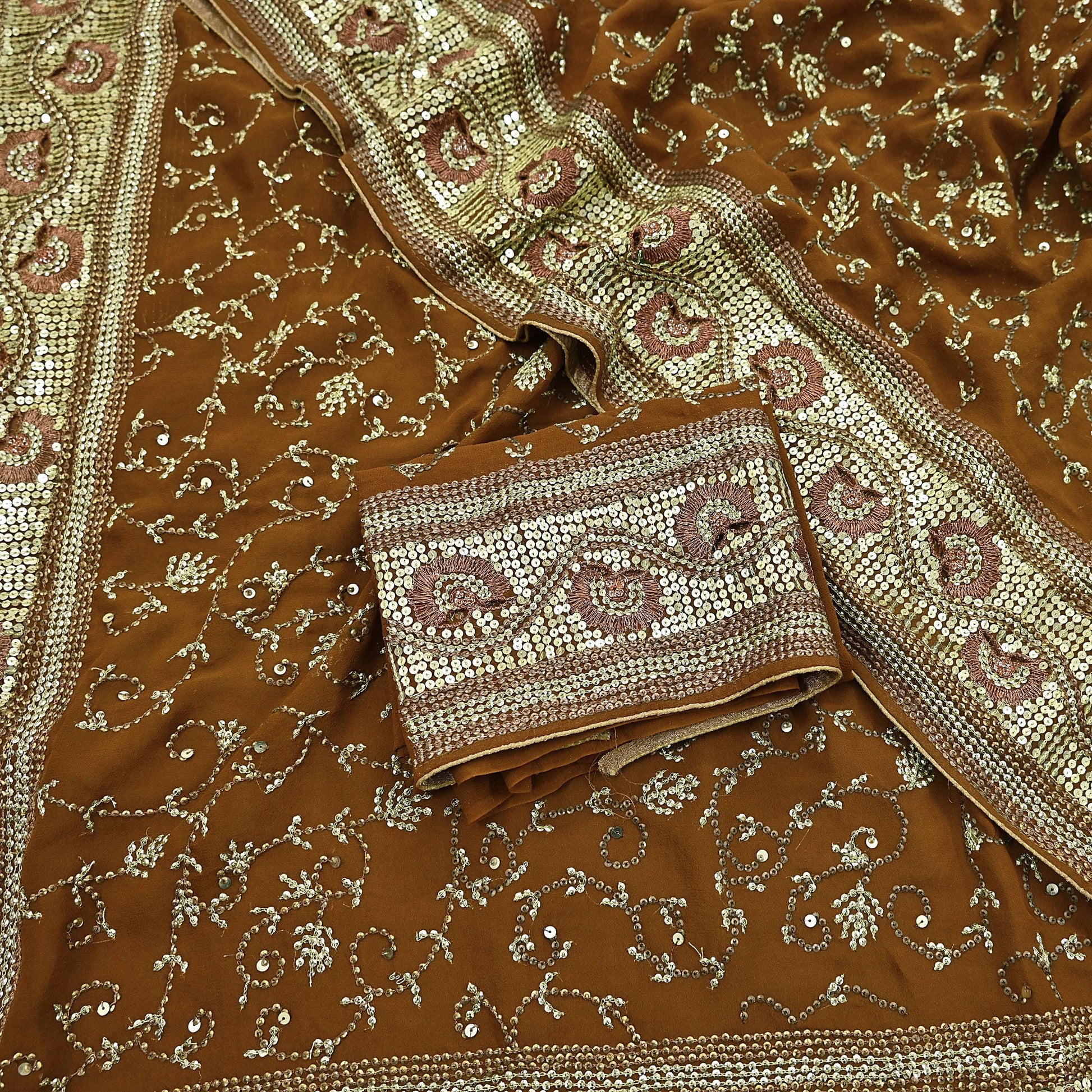 *Pallu & Border Features Floral Design Embellished With Golden Metallic Zari and golden & copper sequins Work.