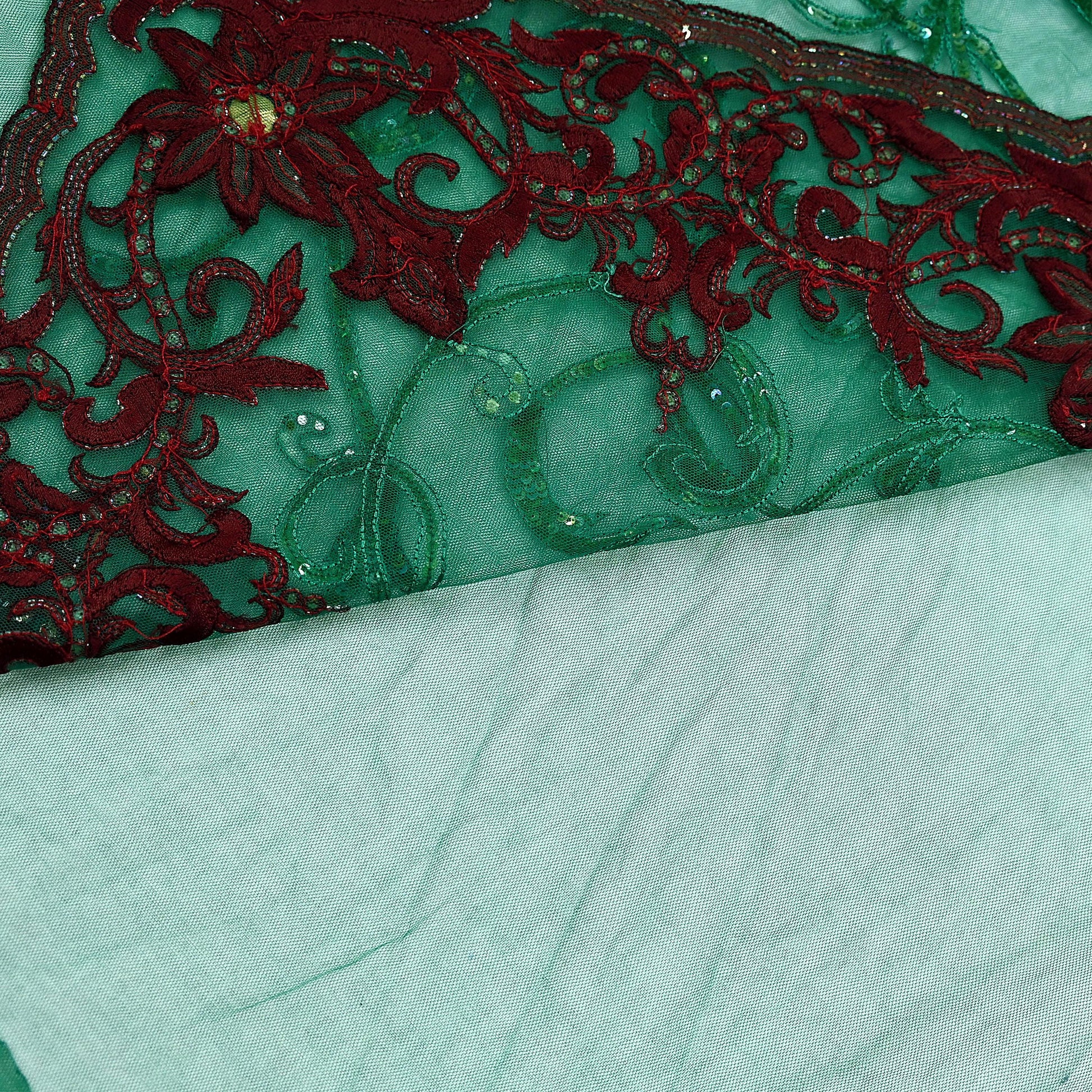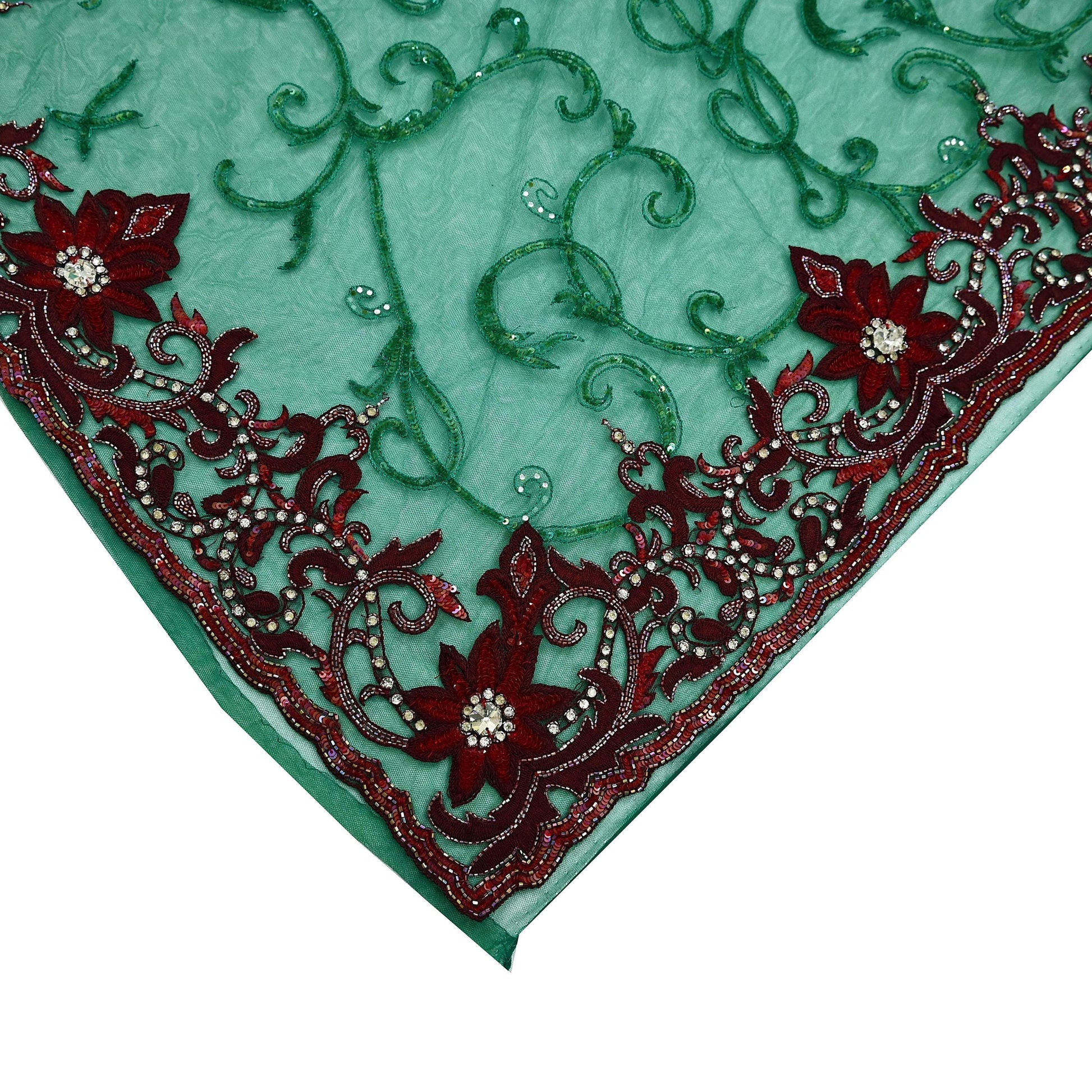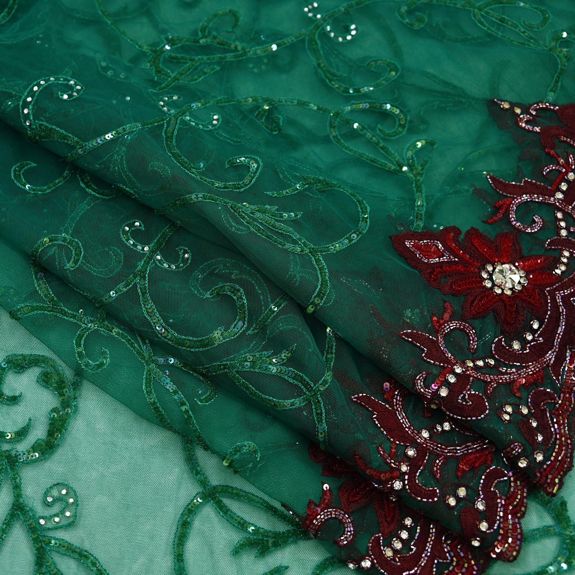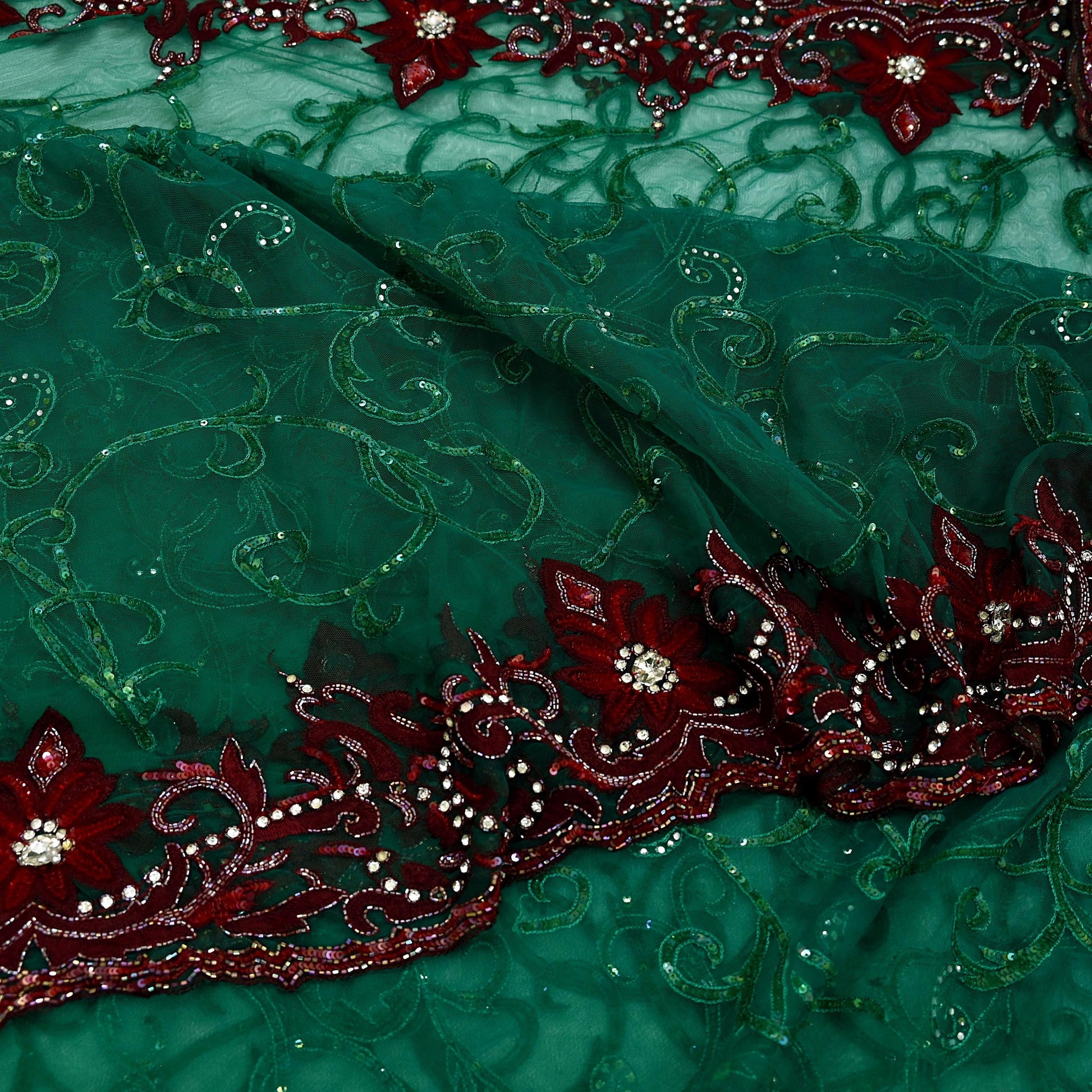 *Pallu & Border Features Paisley Design Embellished With Green & Red Sequins, Red Glass Beaded, Maroon & Green Thread, White stones Work.