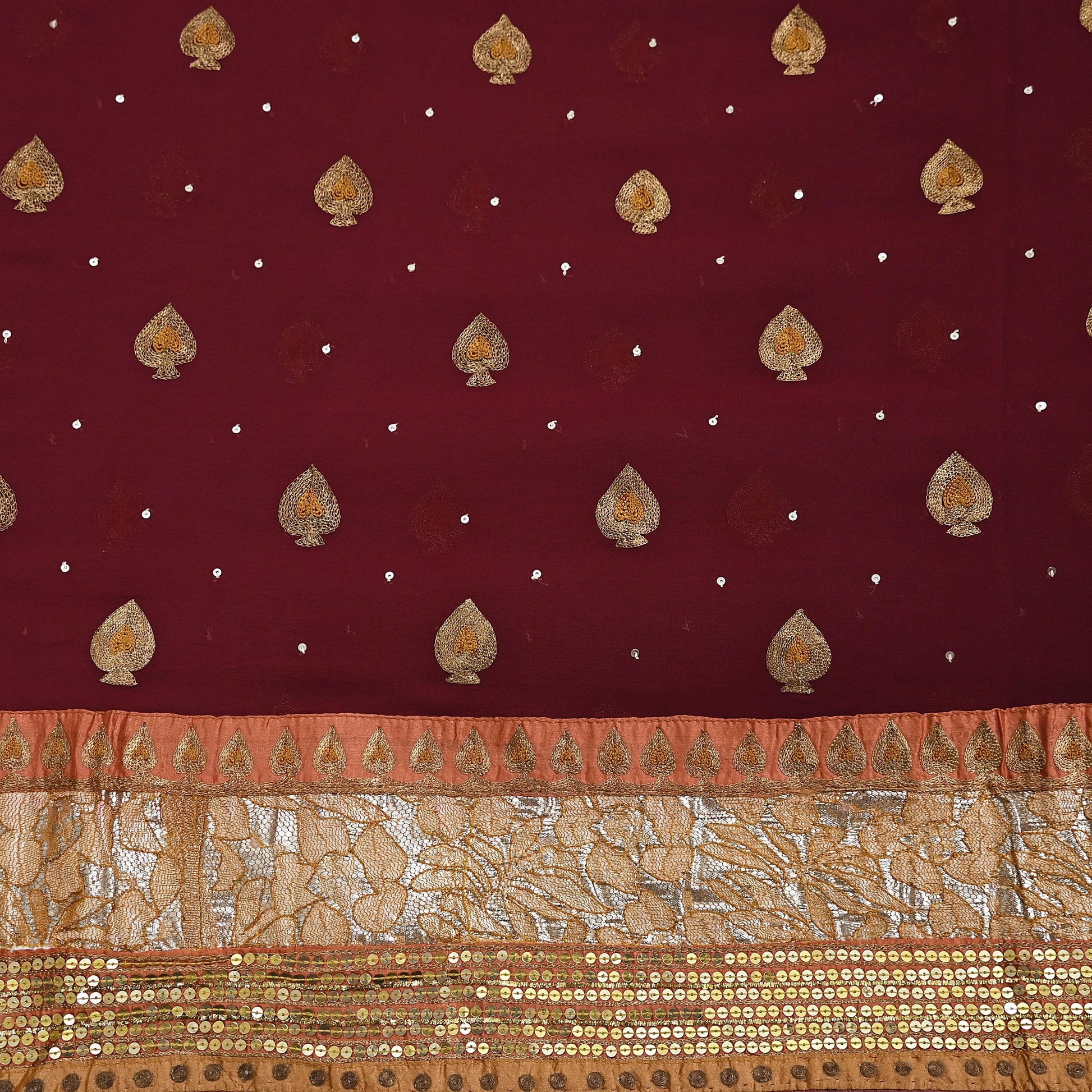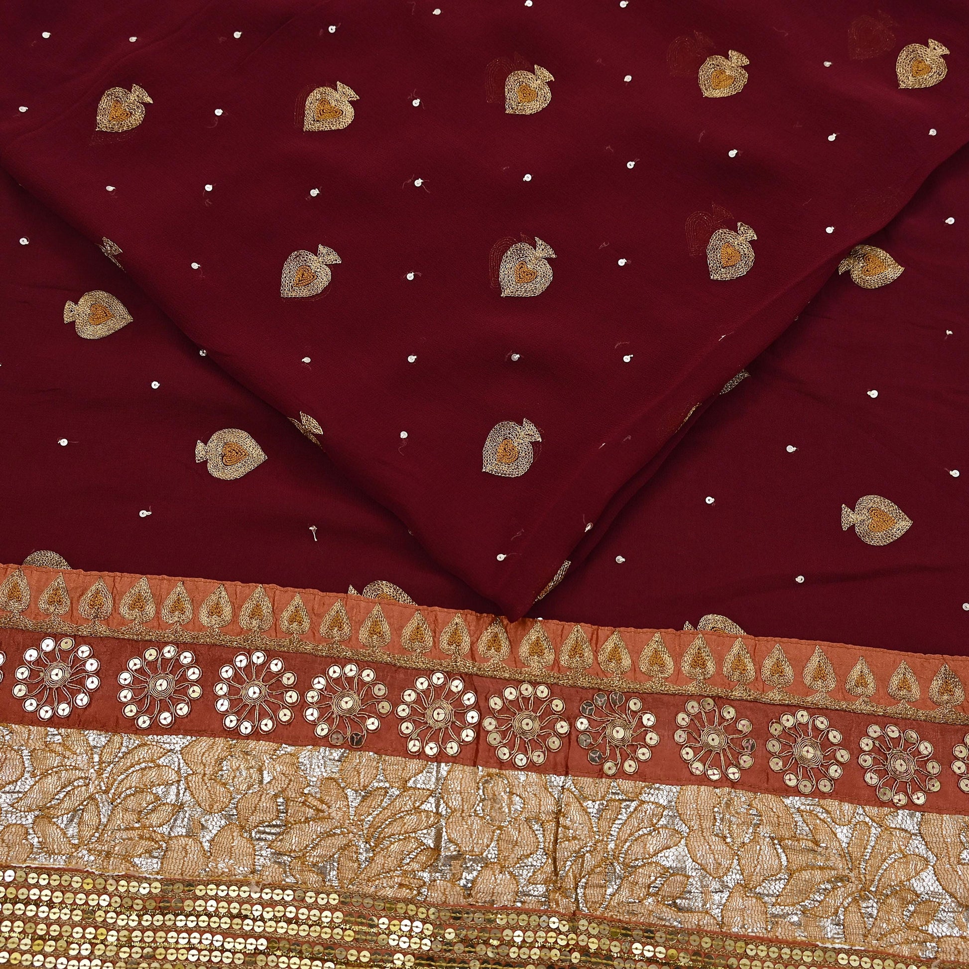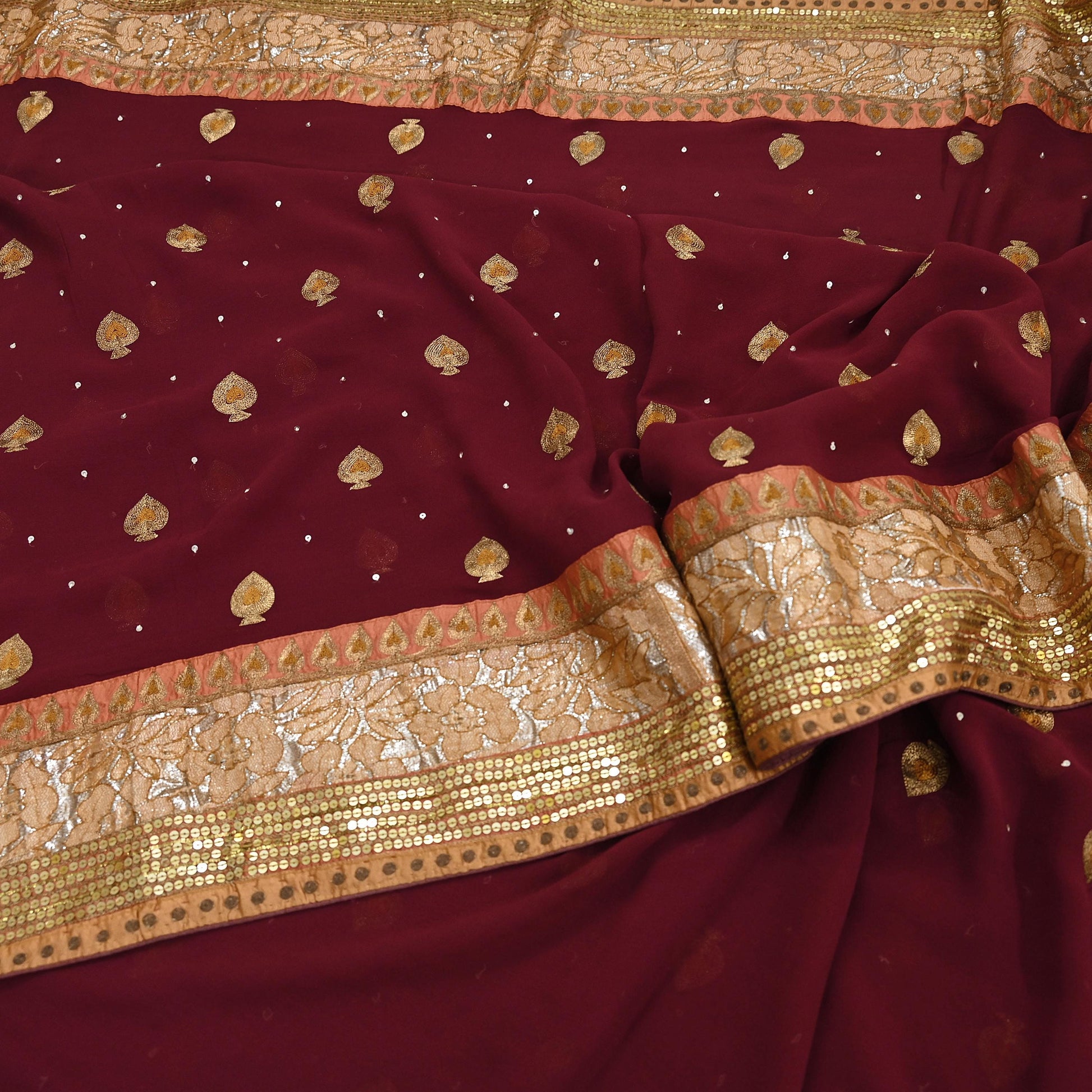 *Vintage Heavy Beautiful Maroon Colored Hand Embroidered Pure Georgette Silk Sari.