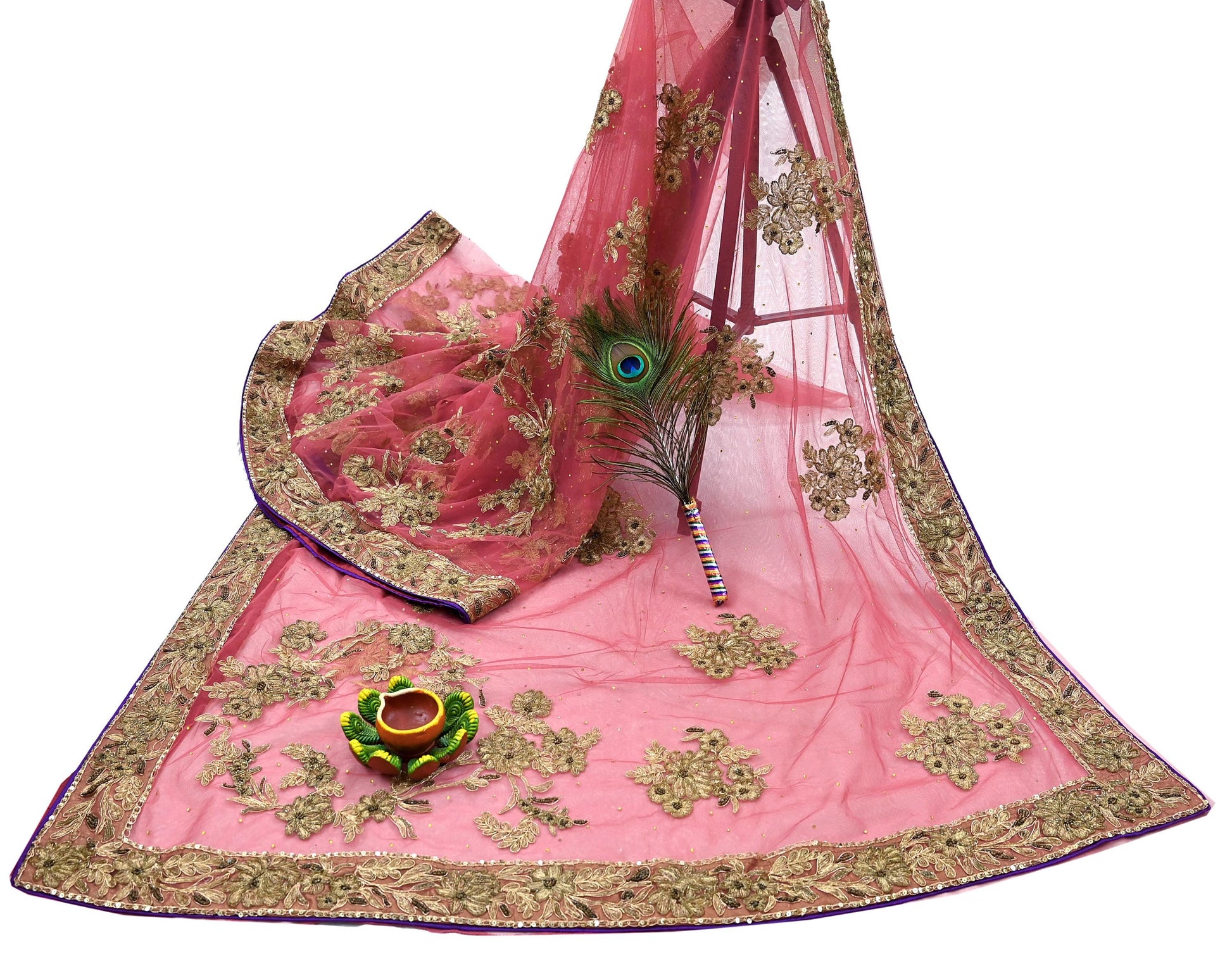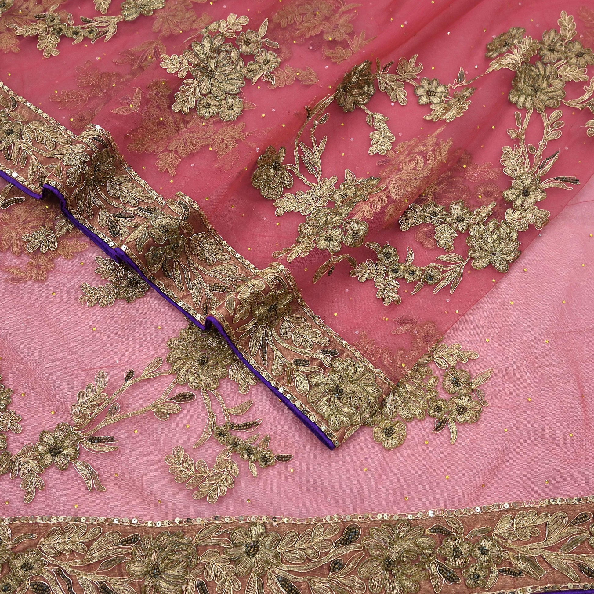 *Vintage Heavy Carrot Pink Colored Hand Embroidered Net Fabric Sari.