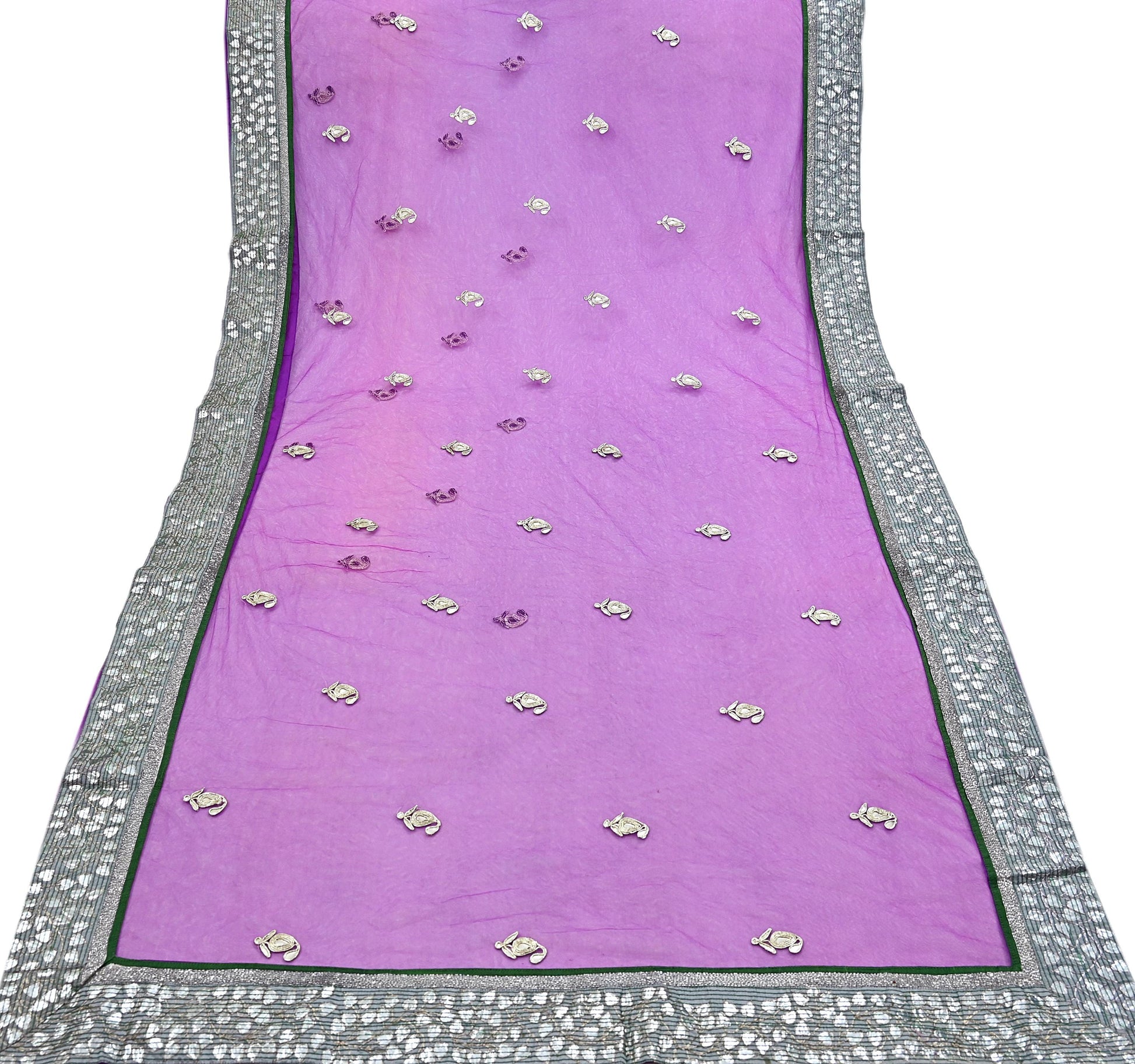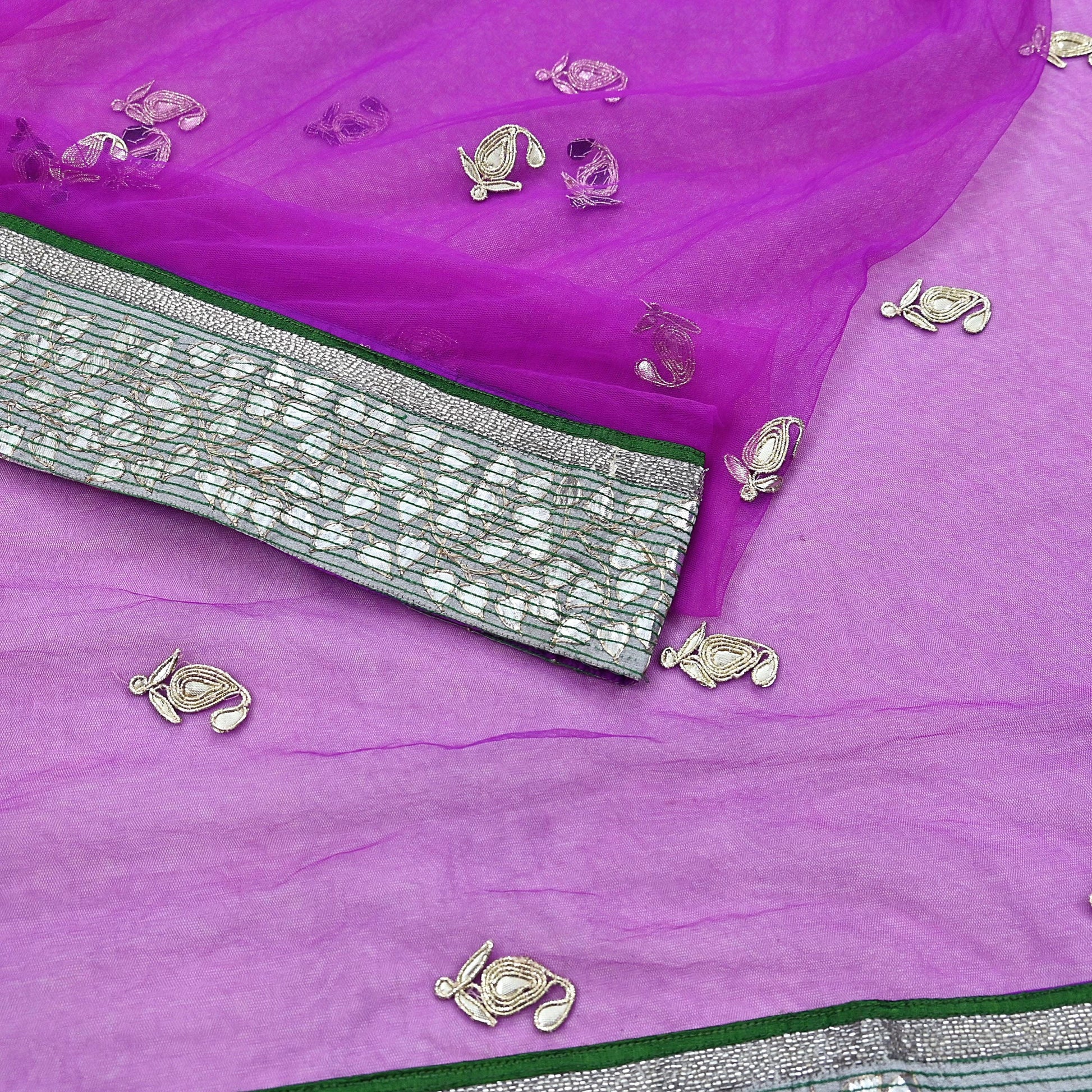 *Pallu & Border Features Floral Design Embellished With silver gota patti, white glass beaded, golden zari, green thread gray raw silk Border Work.