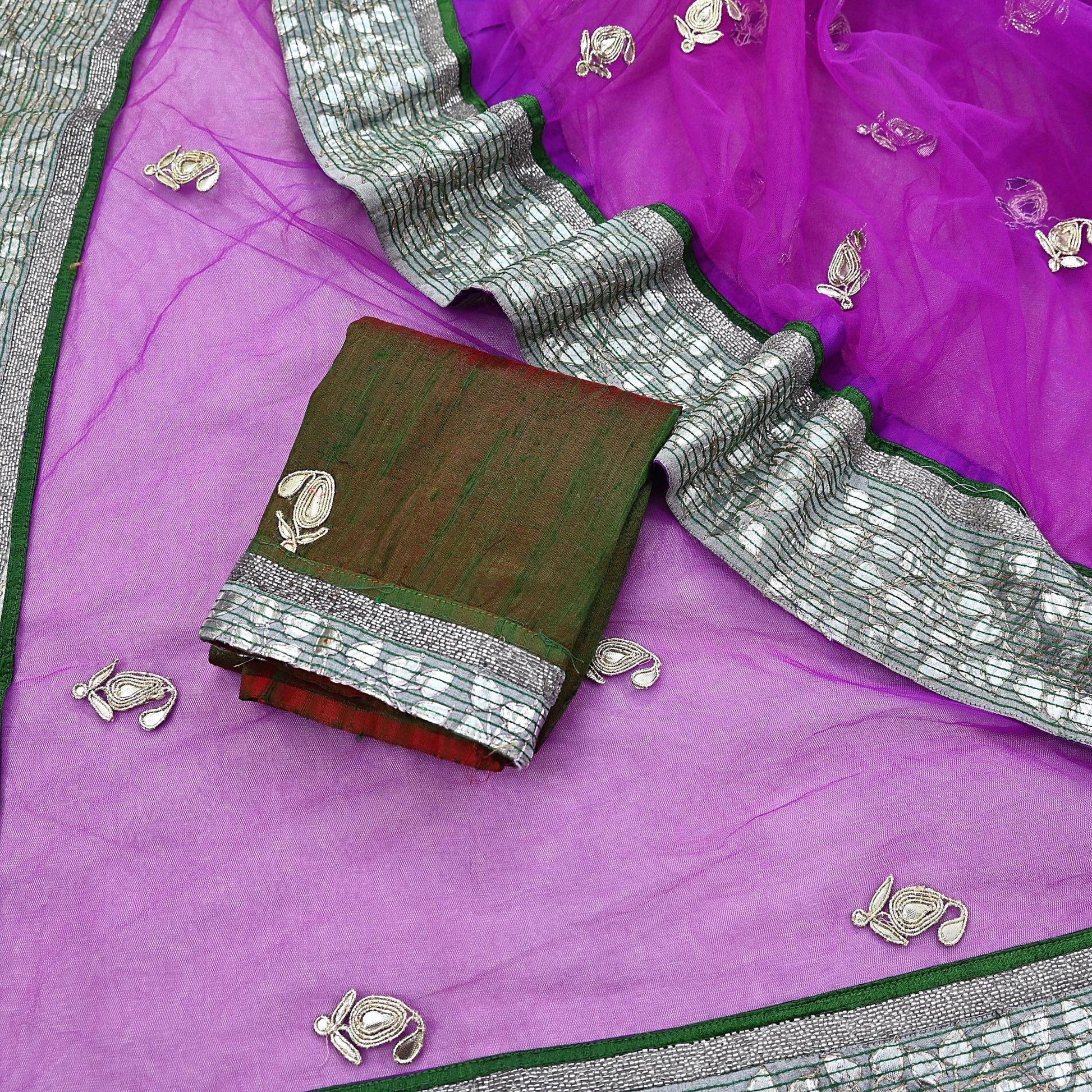 *Sari Has Green & red Matching Raw silk Unstitched Blouse fabric.