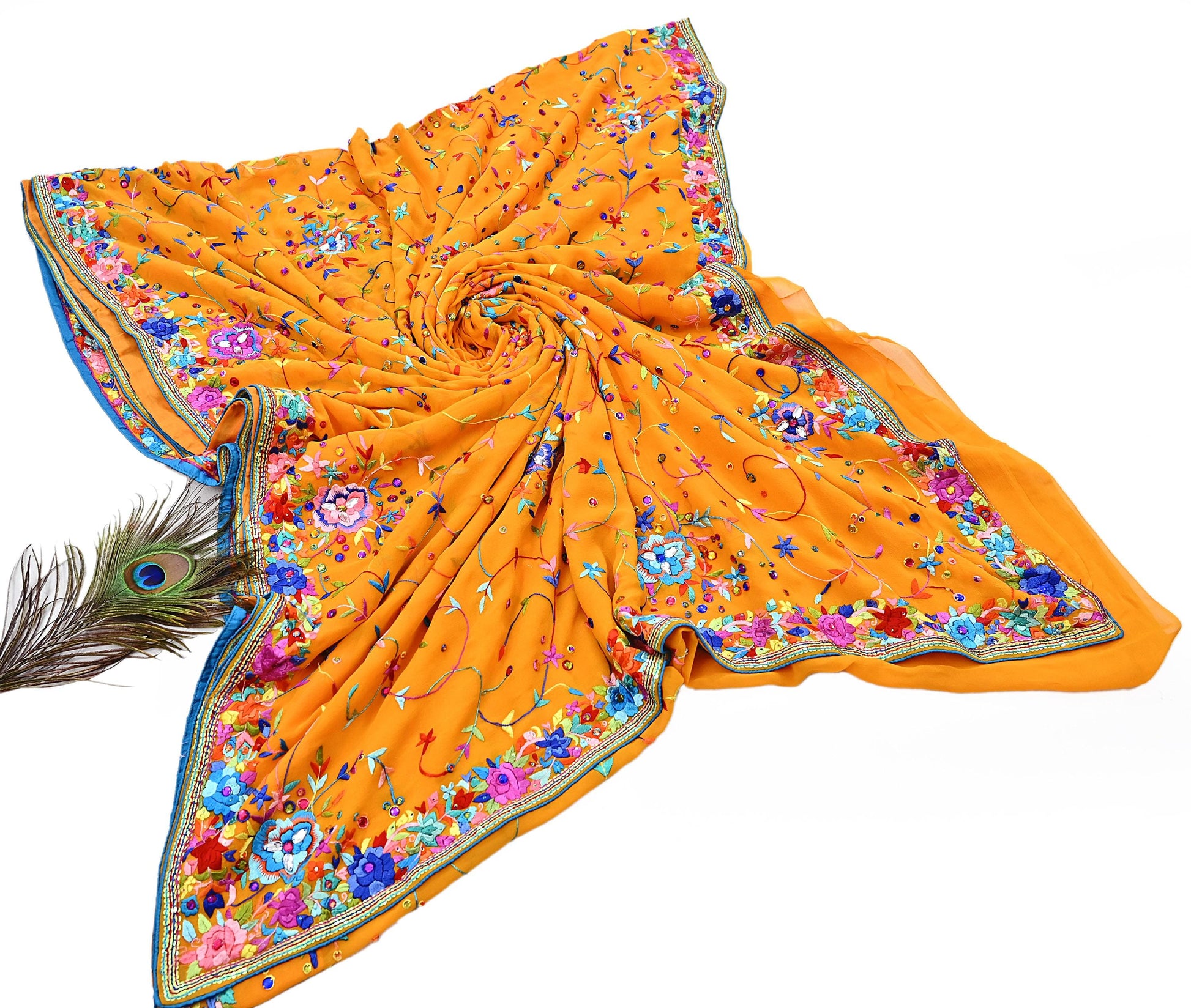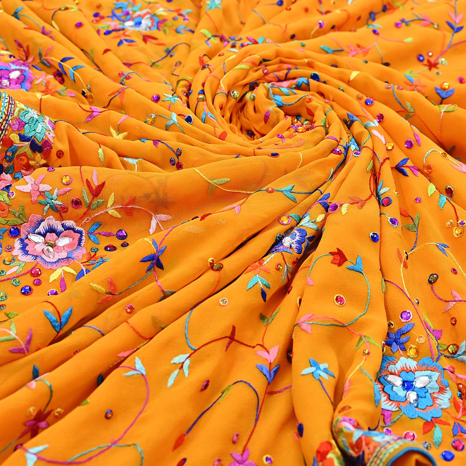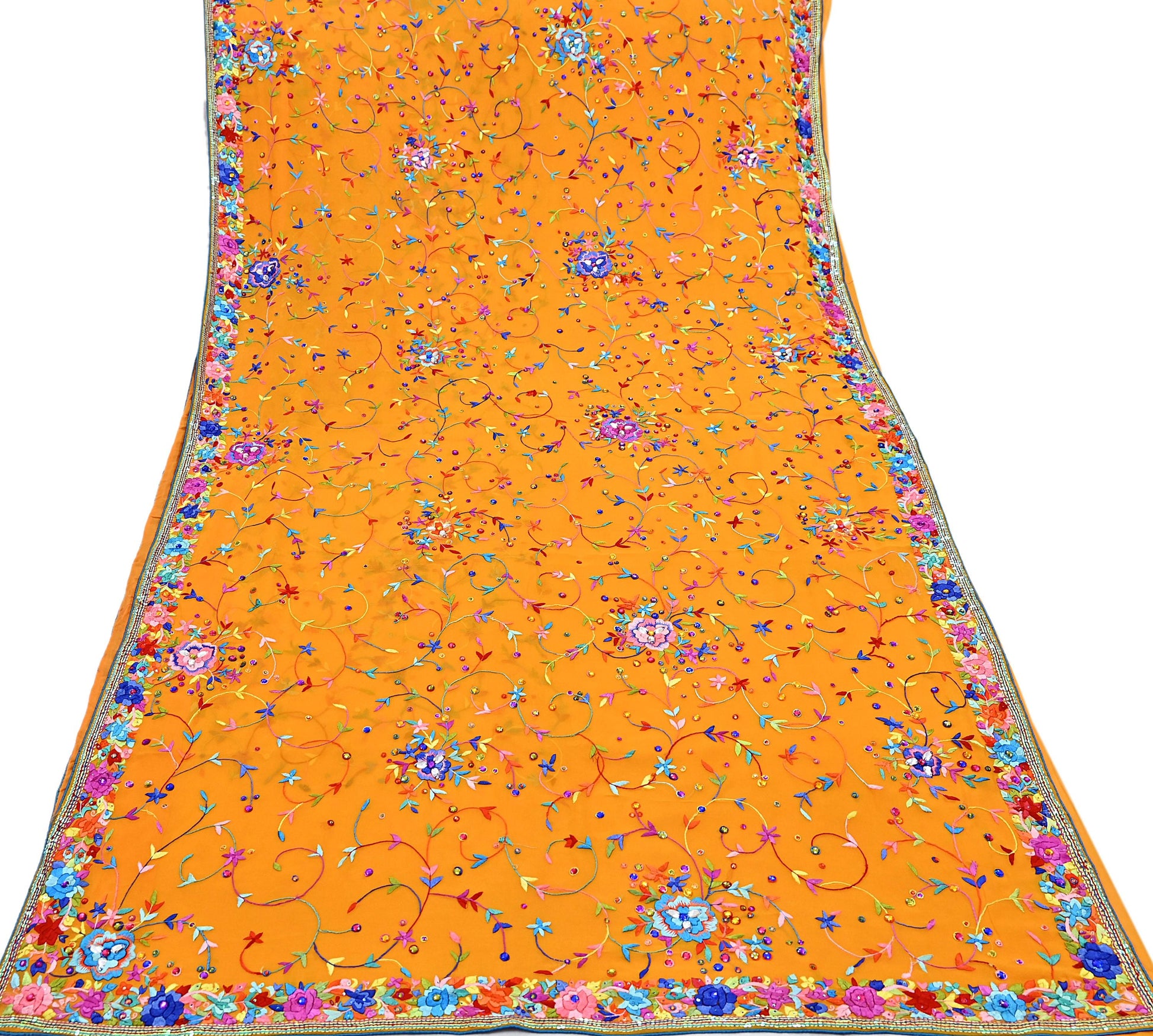 Indian Vintage Heavy Sari saffron Pure Georgette Silk Hand Embroidered Parsi Gara Sarees Craft Fabric 5Yd Sewing Dress making Wedding sari