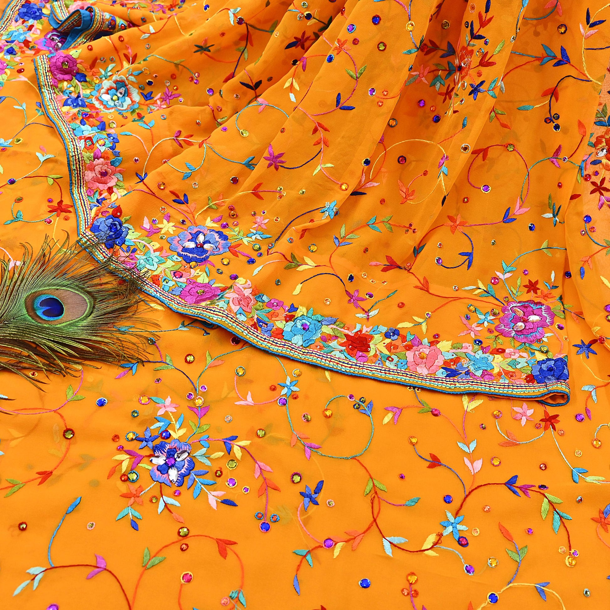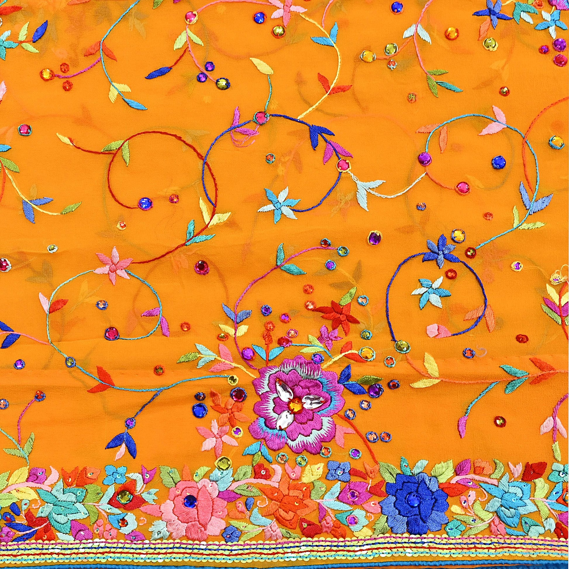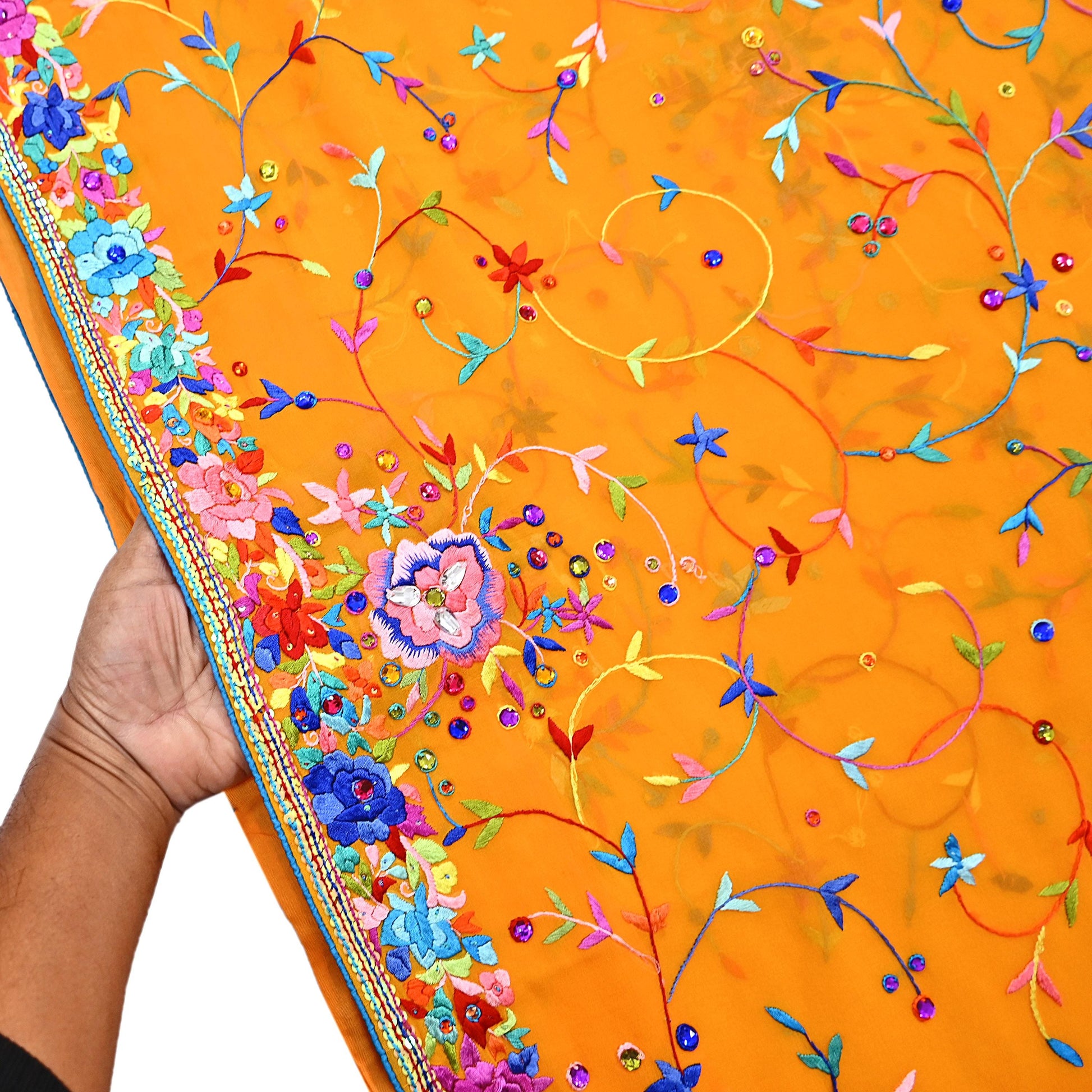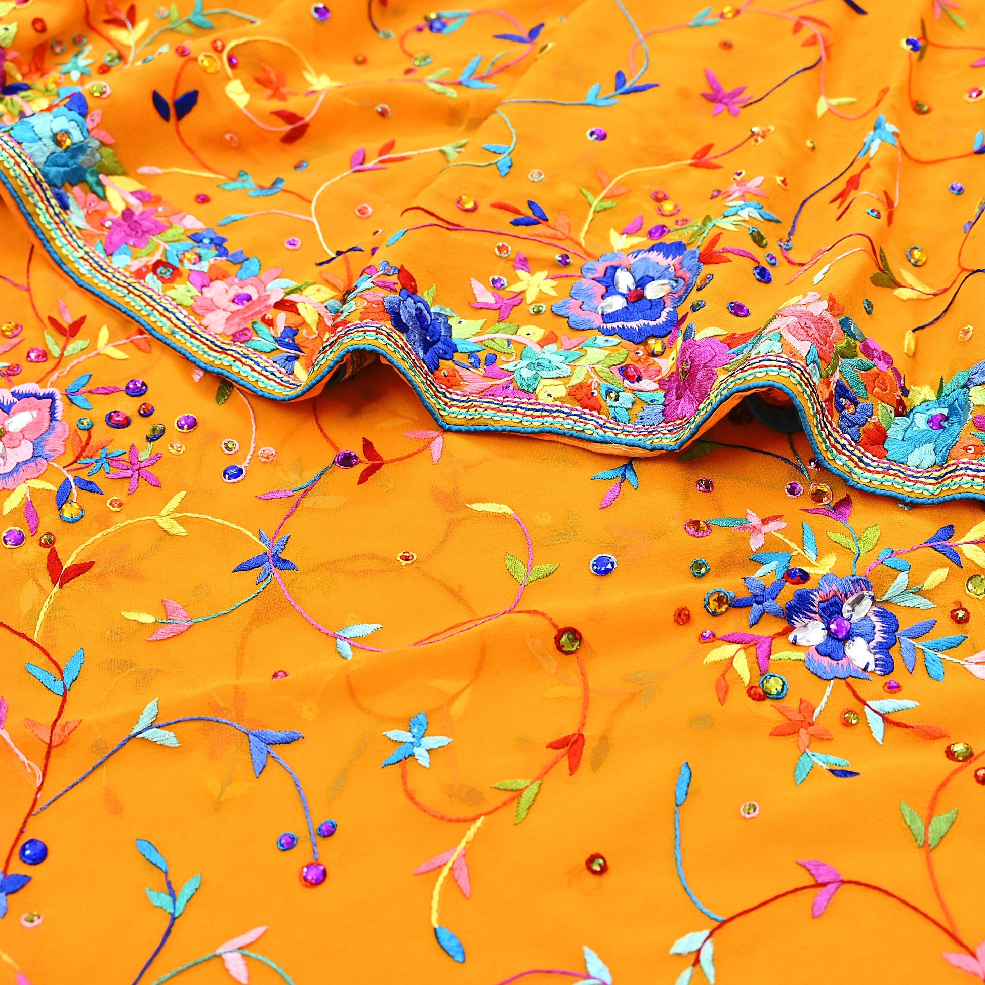 *Vintage saffron Colored Hand Embroidered Parsee/Parsi Gara Sari Pure Georgette Silk Fabric.
