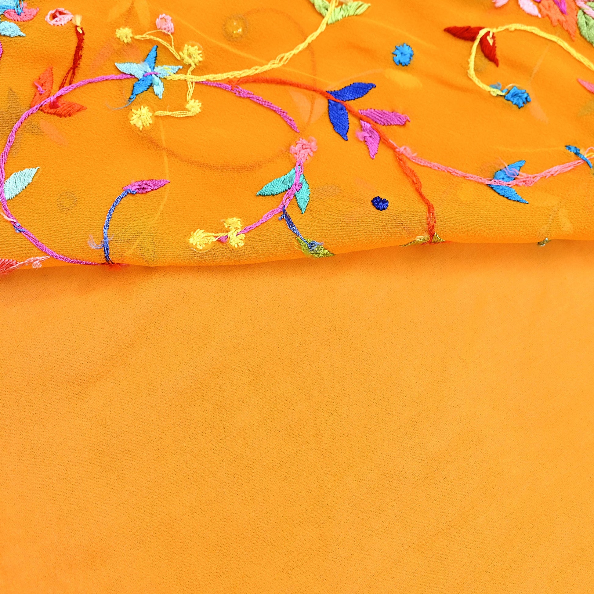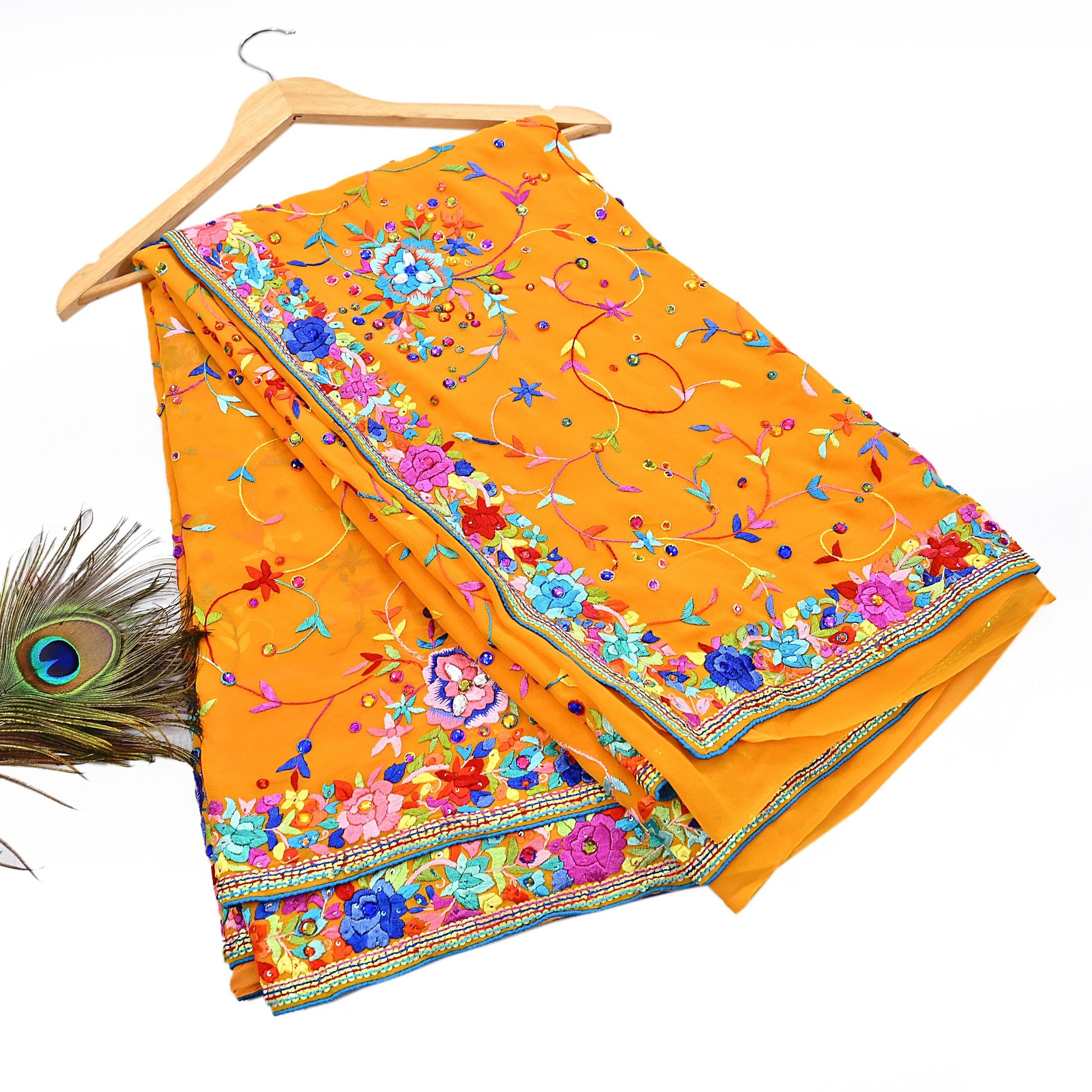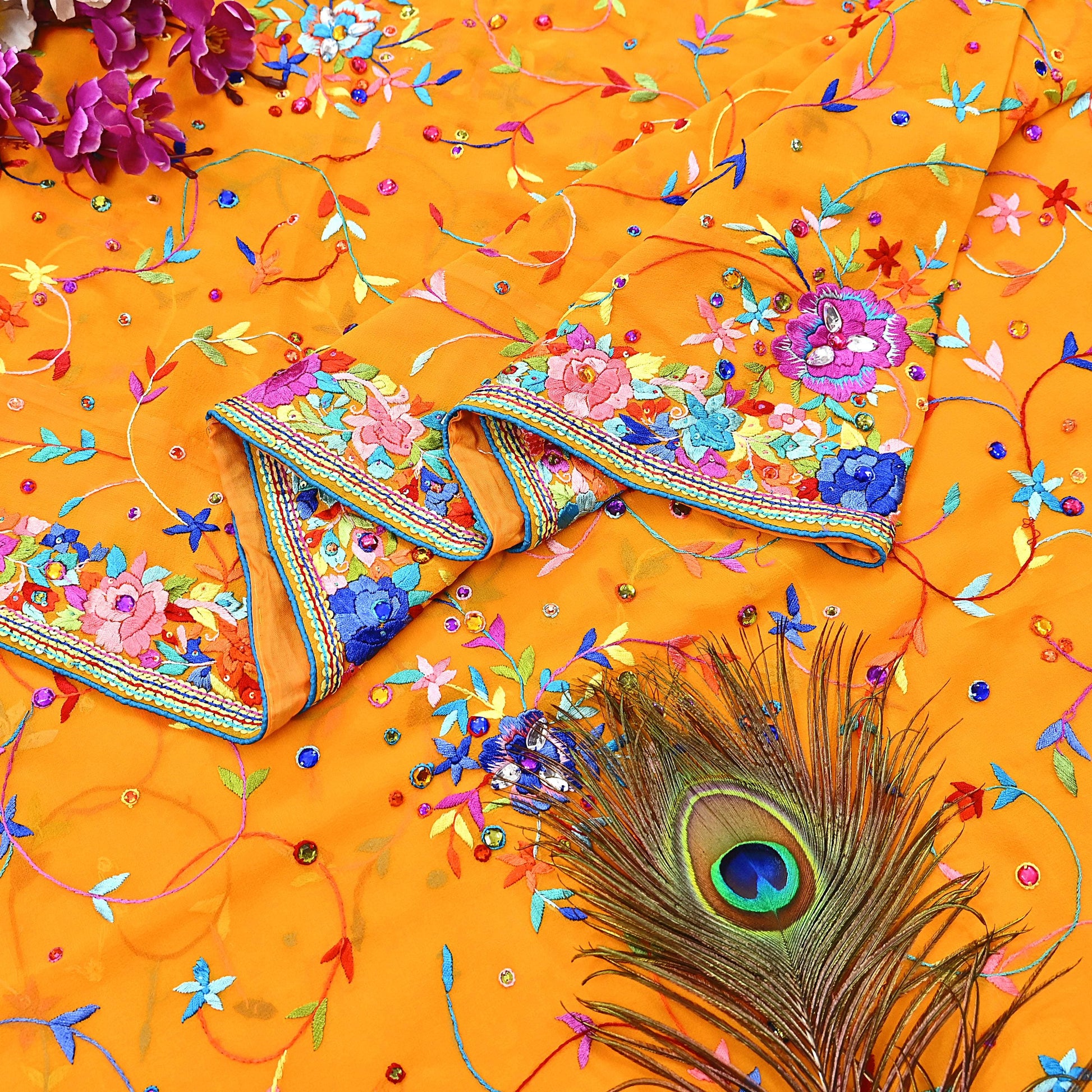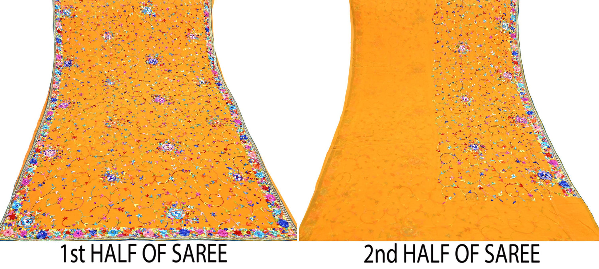 *Vintage saffron Colored Hand Embroidered Parsee/Parsi Gara Sari Pure Georgette Silk Fabric.