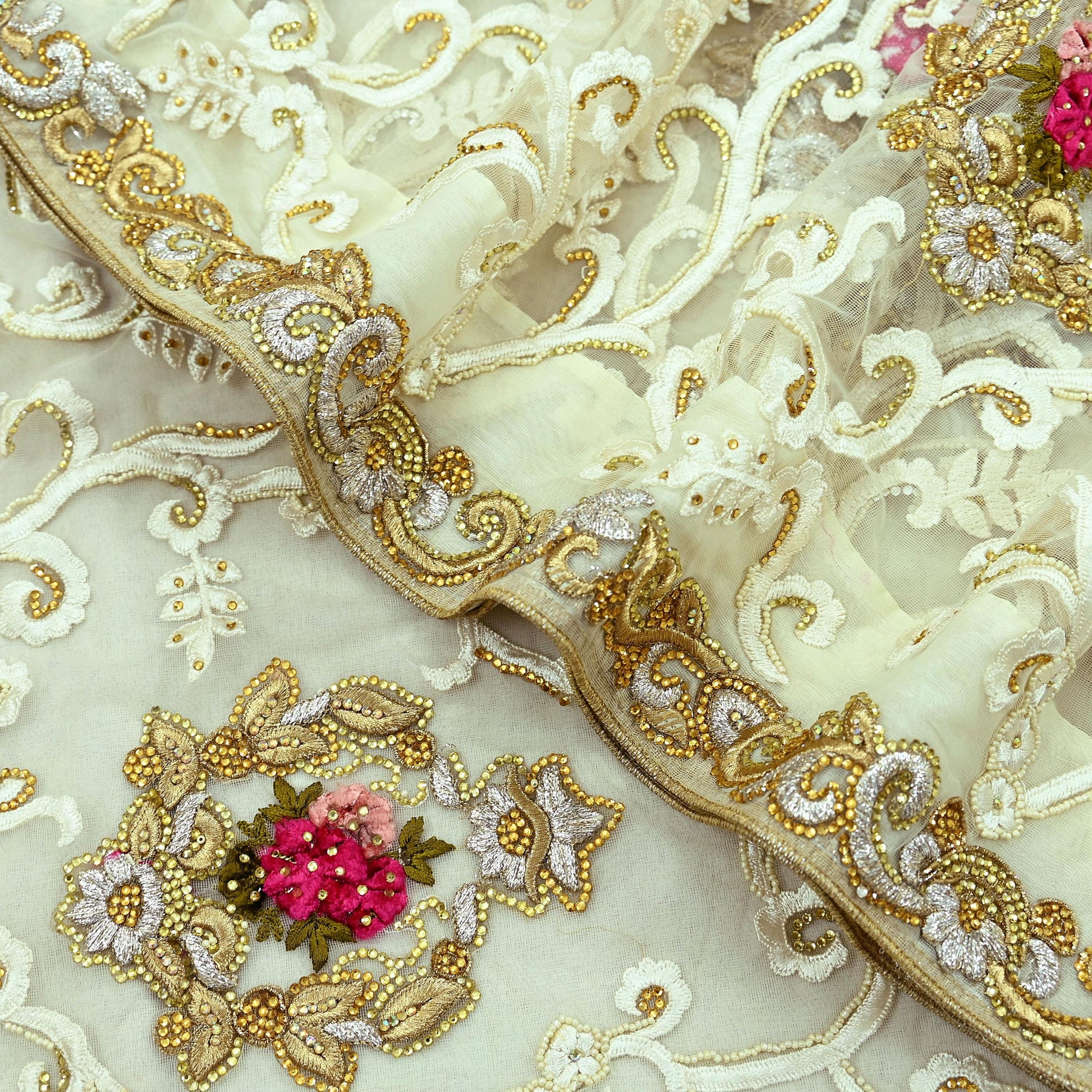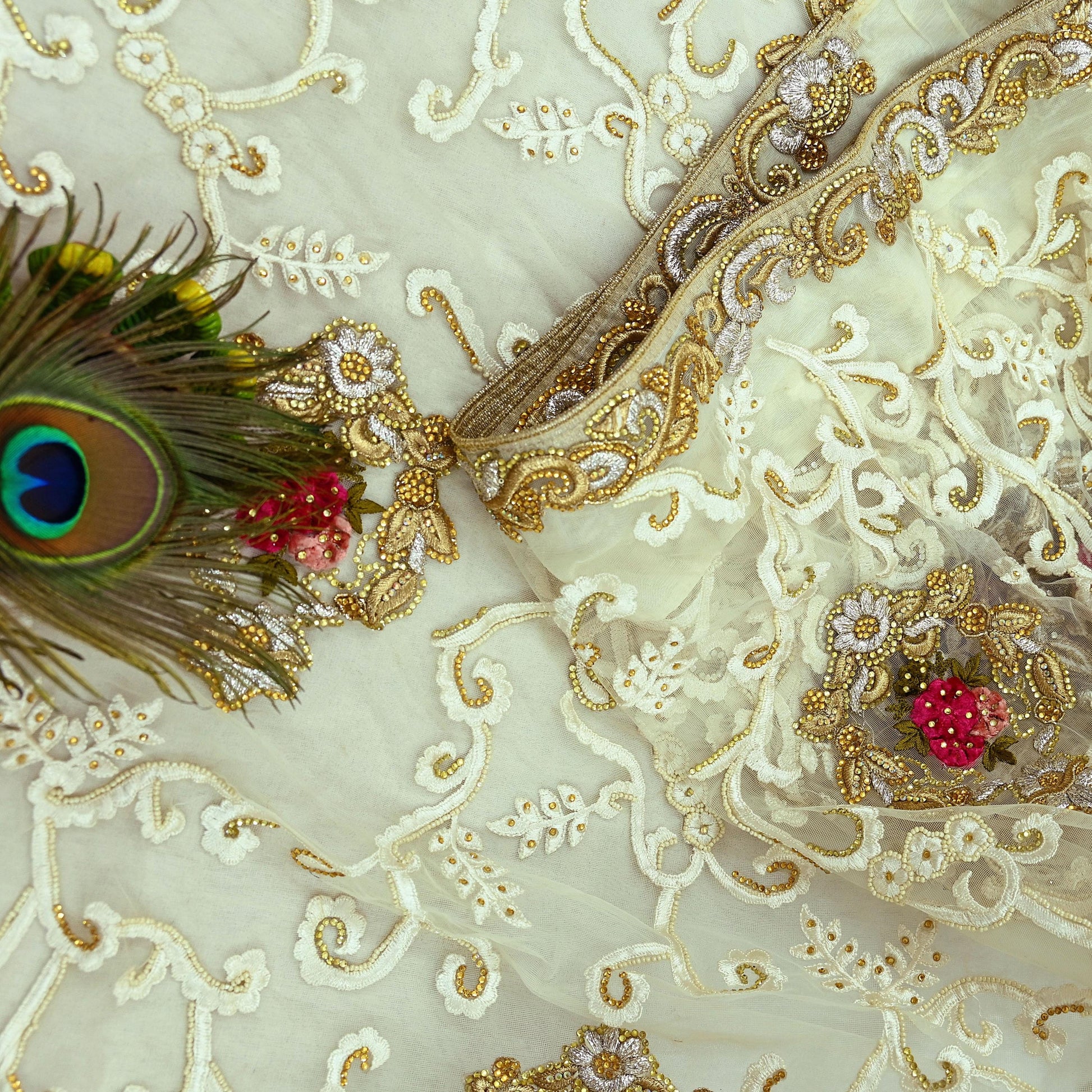 The soft and sheer white base fabric provides an ethereal canvas for the ornate embellishments, creating a piece that’s both regal and versatile—ideal for bridal styling, festive occasions, or creative repurposing into unique garments or décor.