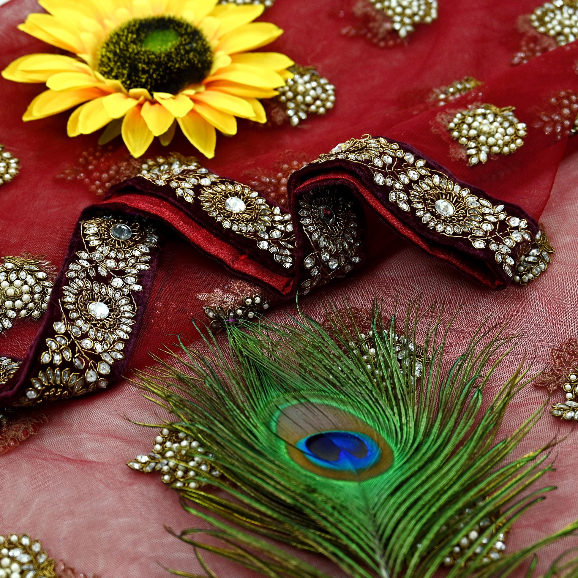 Indian Vintage Heavy Wedding Dupatta Maroon Net Long Stole Hand Embroidered By Designer Sabyasachi Scarves Zardozi Bridal Veil