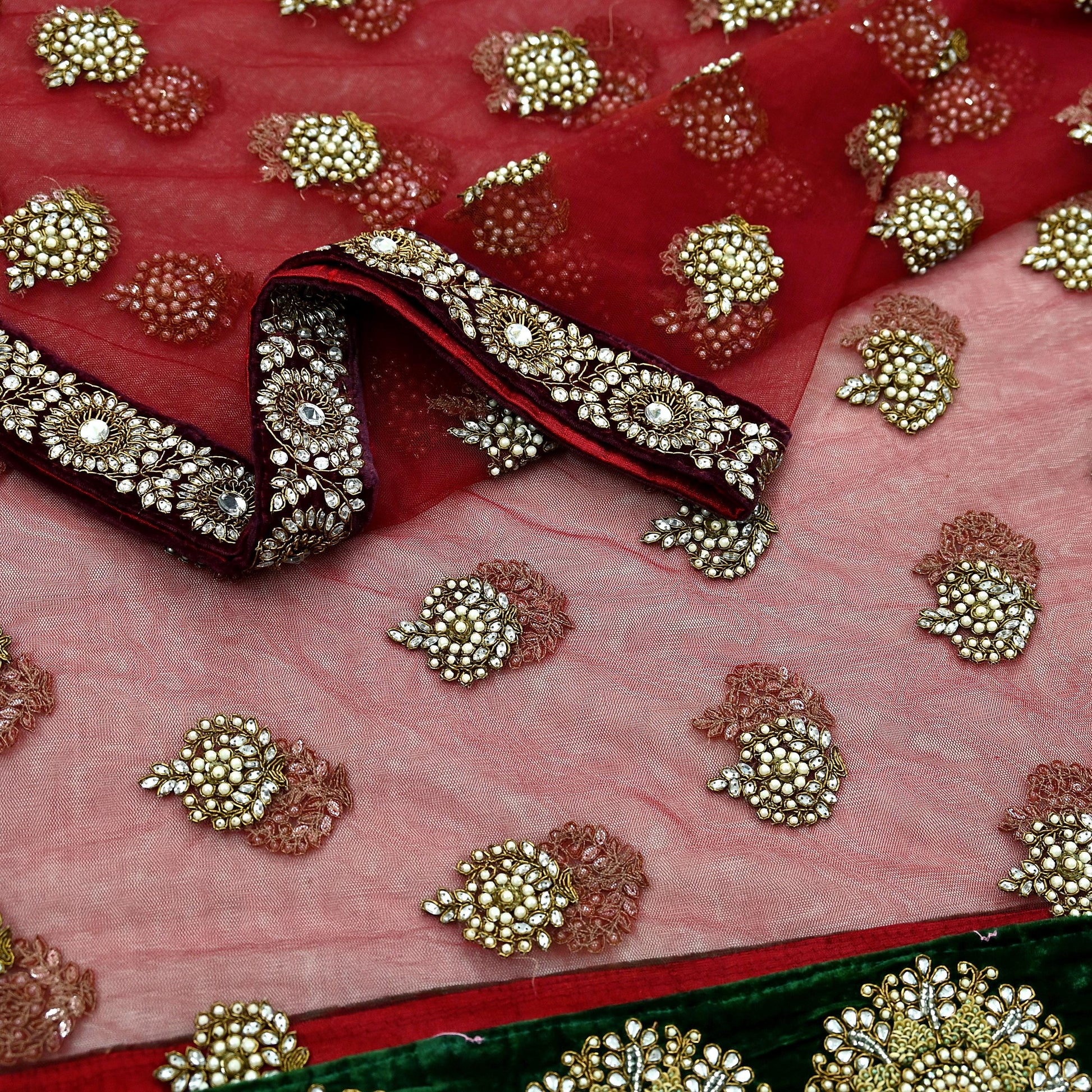 This one of a kind item is difficult to express in words. *This one of a kind item is difficult to express in words. Border feature is floral design embroidered pure metallic golden zardozi/dabka work, golden zari, golden & Ivory sequins, White stones, white pearl-like beads, and intricate Maroon & Green velvet Border work embellished work is the highlight of the dupatta. Also you can see similar work with floral pattern in center part adds to its beauty.
