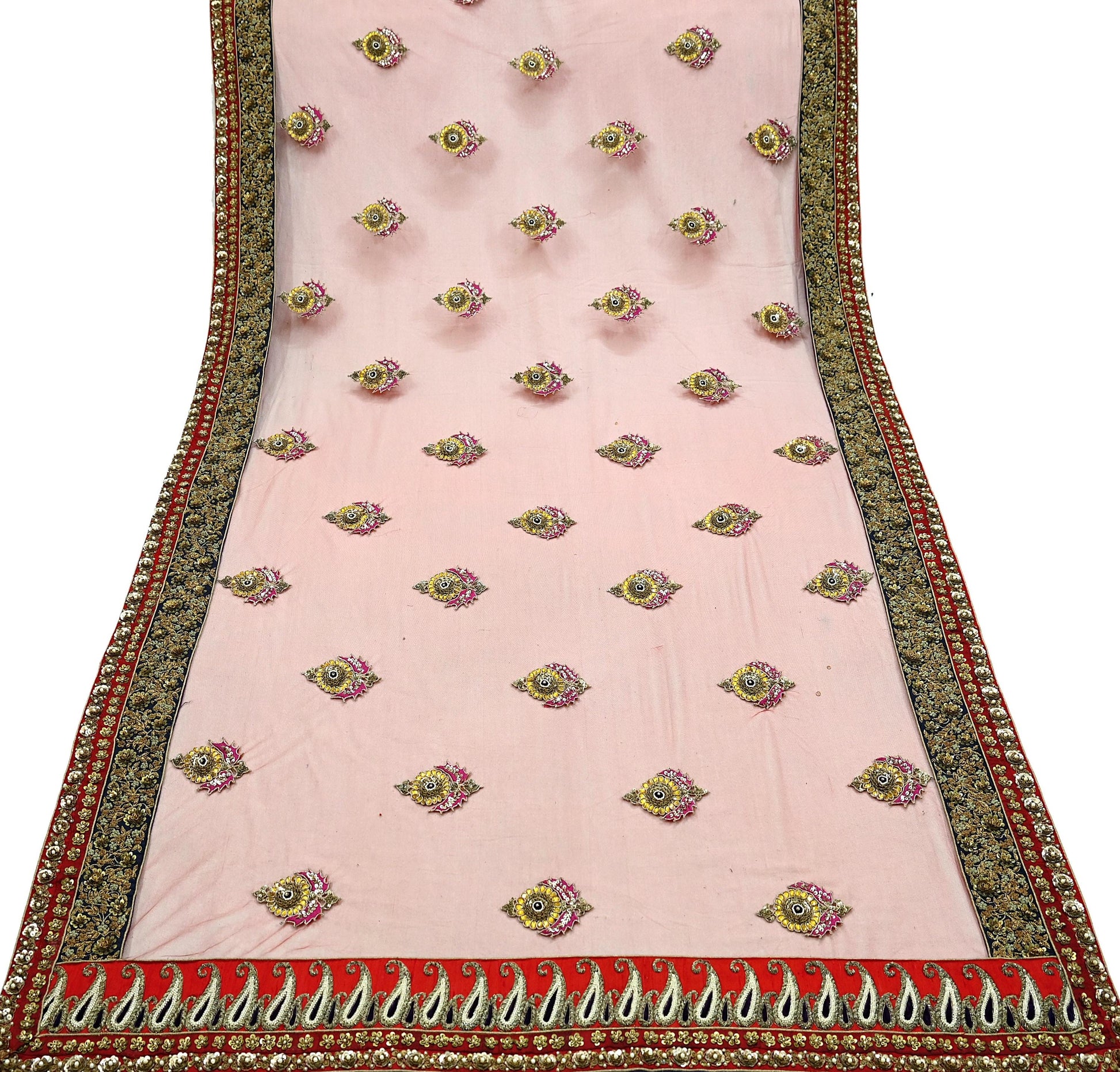 *This one of a kind item is difficult to express in words. Border feature is floral design embroidered Pure Metallic Golden Zardozi/ Dabka, Zari, Golden Sequins, Golden Glass Beaded, White Pearl Like Beaded, Rani Pink, Green Thread work embellished work is the highlight of the dupatta. Also you can see similar Mukesh work with floral pattern in center part adds to its beauty.