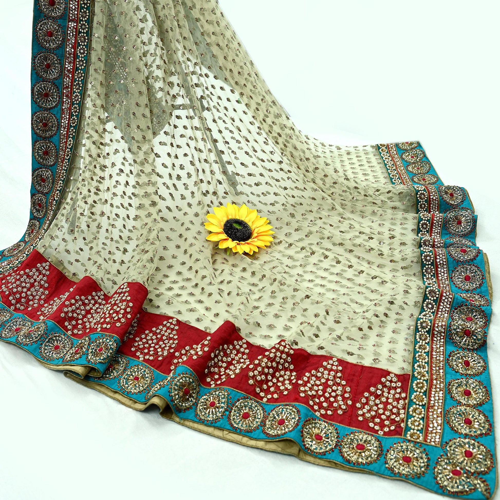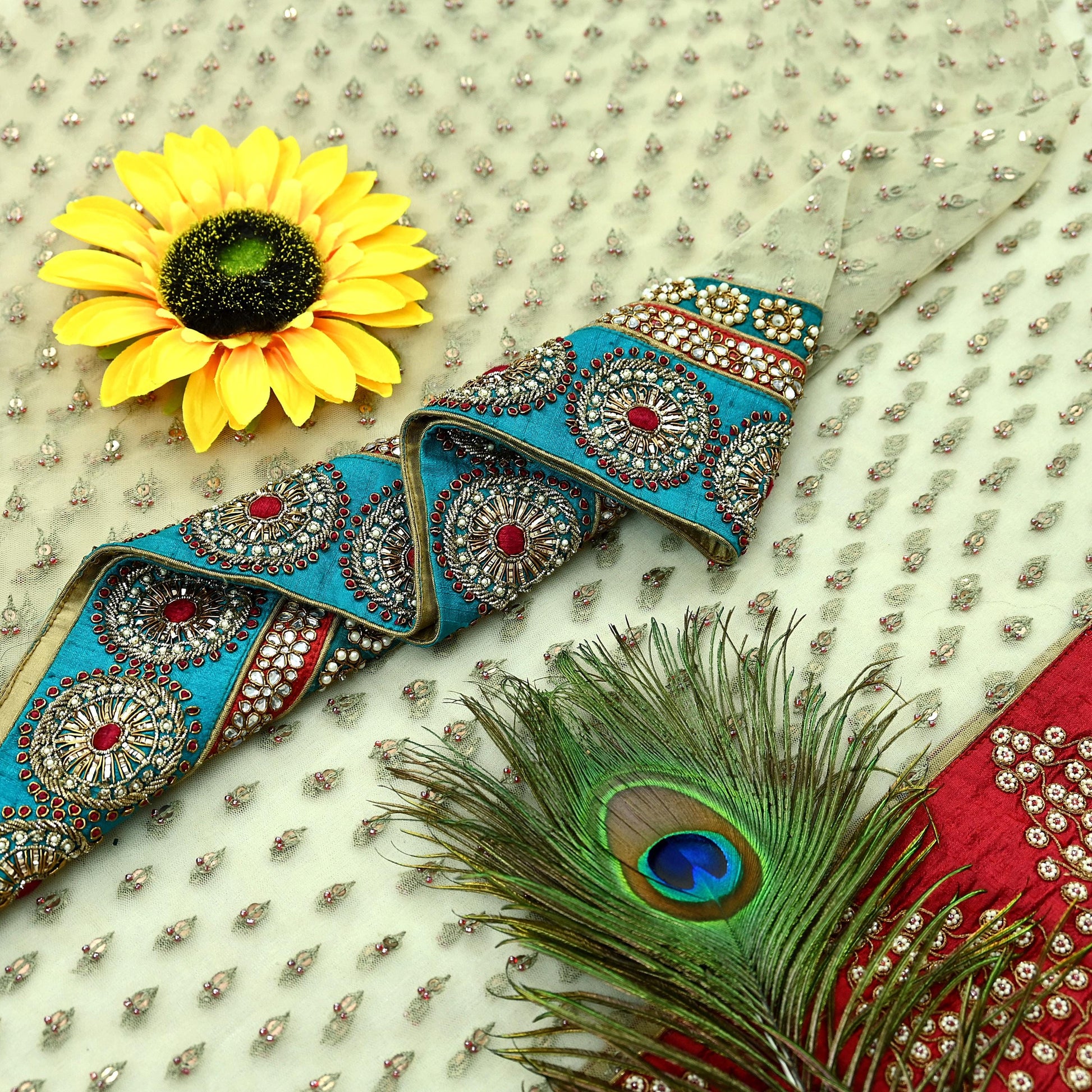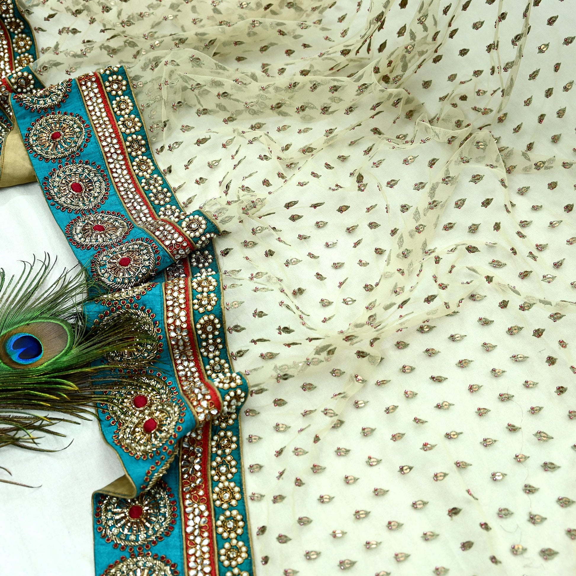 *This one of a kind item is difficult to express in words. Border feature is Floral design embroidered pure metallic golden Zardozi/Zari, white beads, pearl-like beads, and golden Mukesh, Red & Green Thread work embellished work is the highlight of the dupatta.
