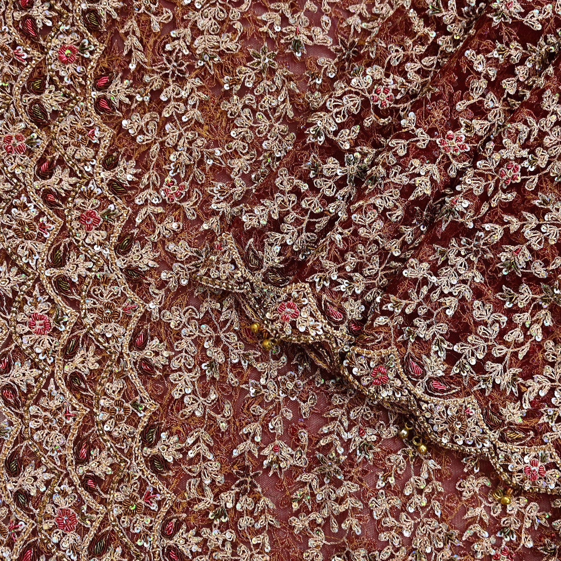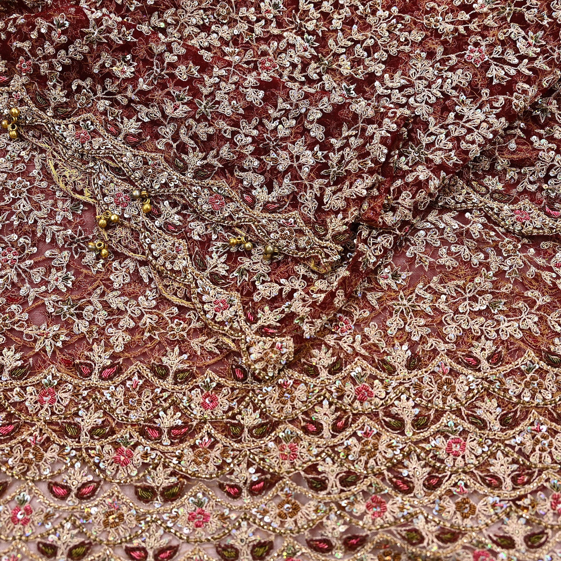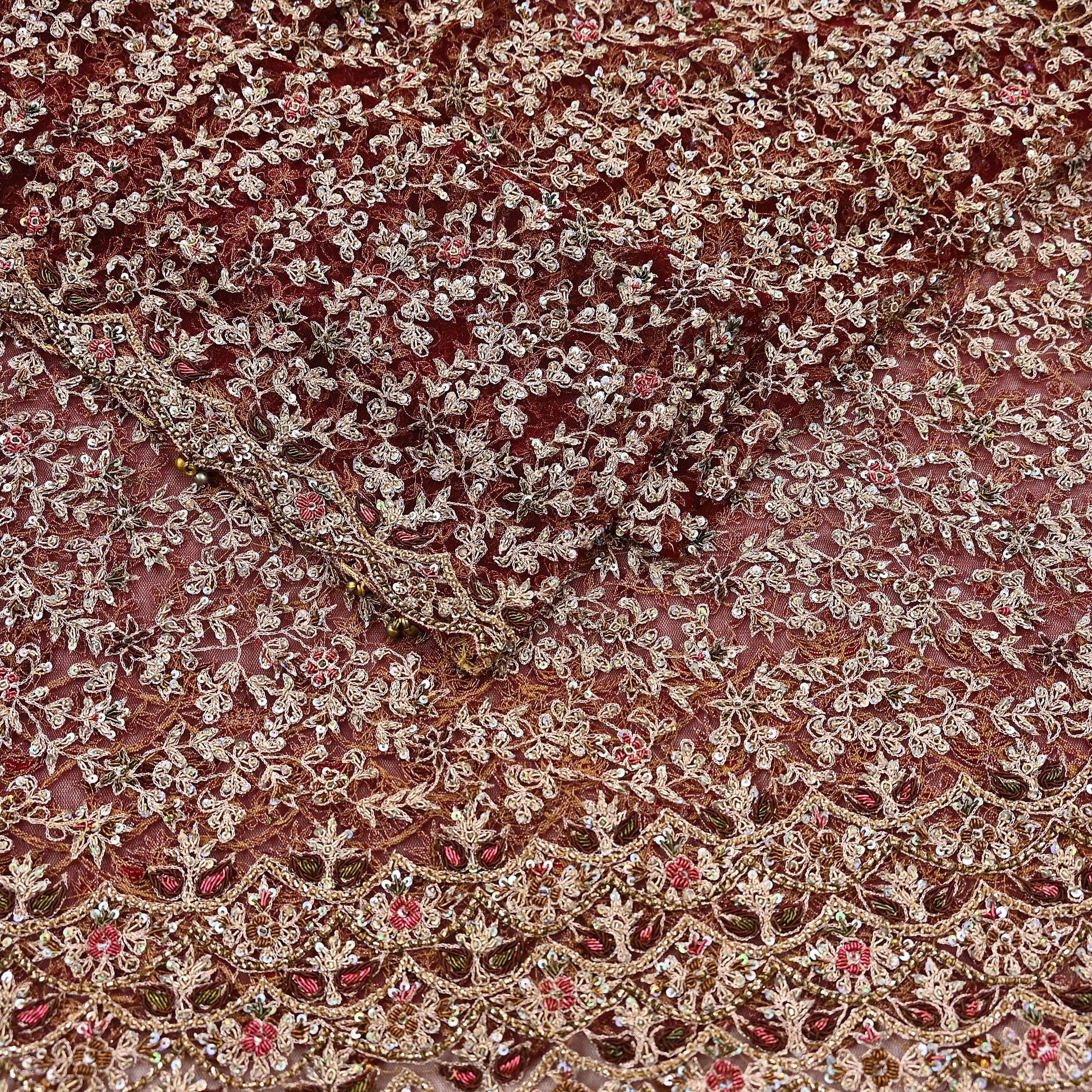 Stunning Beautiful Heavy Look Dupatta Hand Embroidered Net Dupatta/Stole In Maroon Color Fabric. This one of a kind item is difficult to express in words. Border feature Golden Sequins, Multi Thread Work With The floral & Paisley design embroidered work Peach, Maroon , Green & Golden Zardozi/ Dabka, Zari, Glass Beaded, Sequins, Maroon Thread work is the highlight of the dupatta. Also you can see similar Work with floral pattern in center part adds to its beauty. Beautiful Golden Sequins work is giving a fabulous look to the dupatta. Awesome one !!!