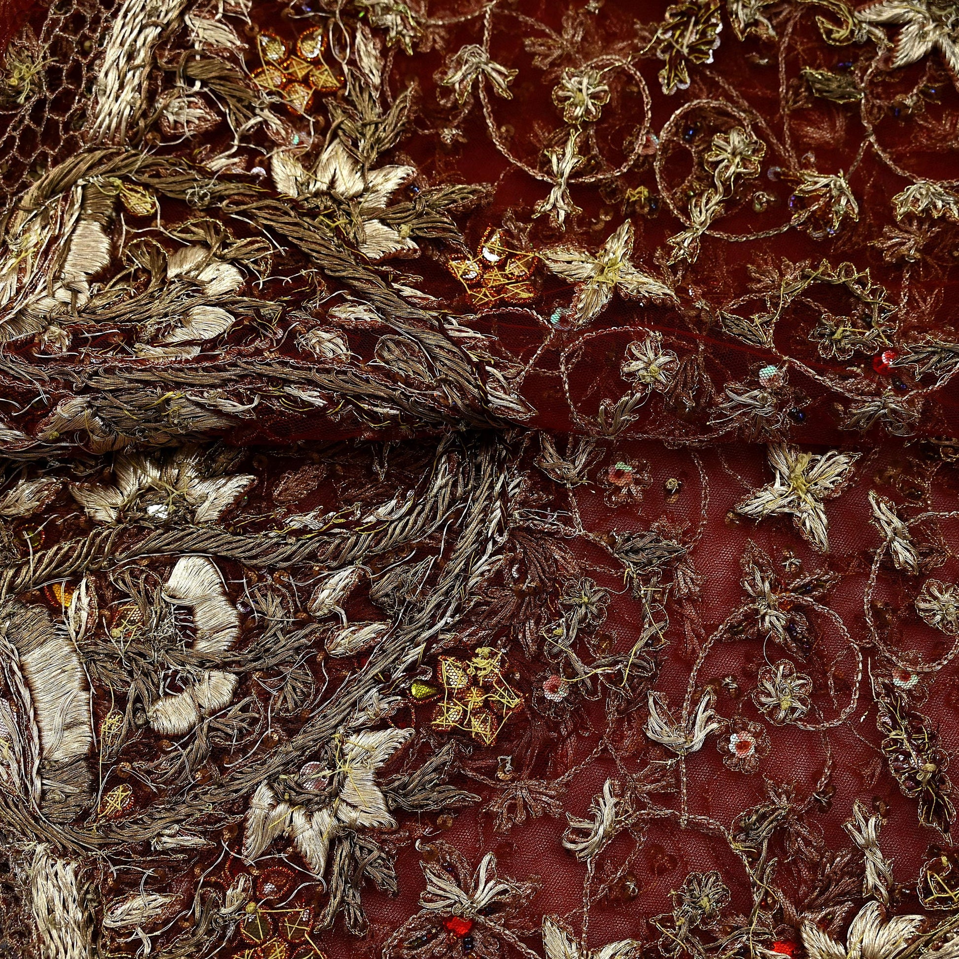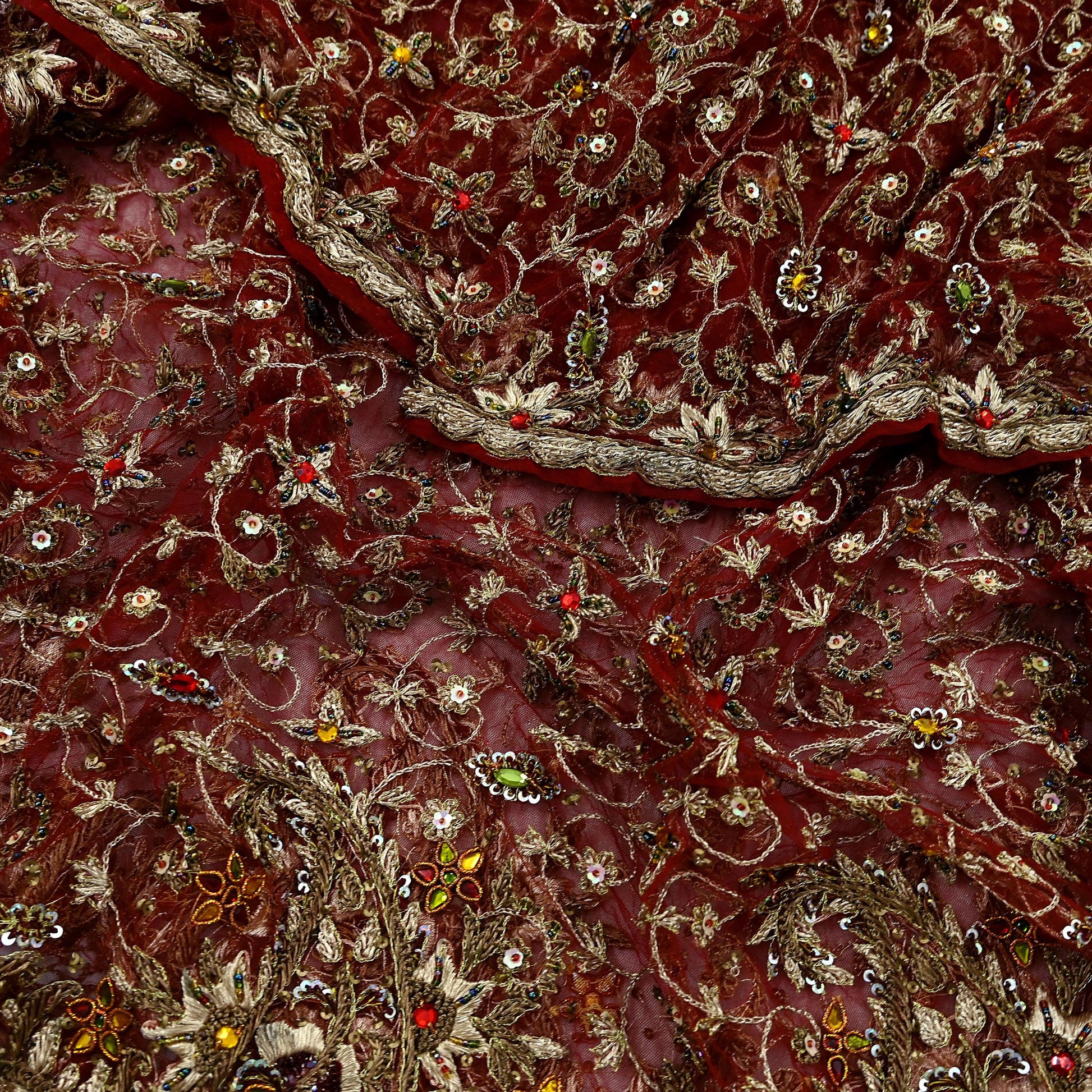 Make a bold and beautiful statement with this exquisite maroon hand-embroidered net dupatta, a stunning heirloom-quality piece radiating vintage charm and artisanal finesse.