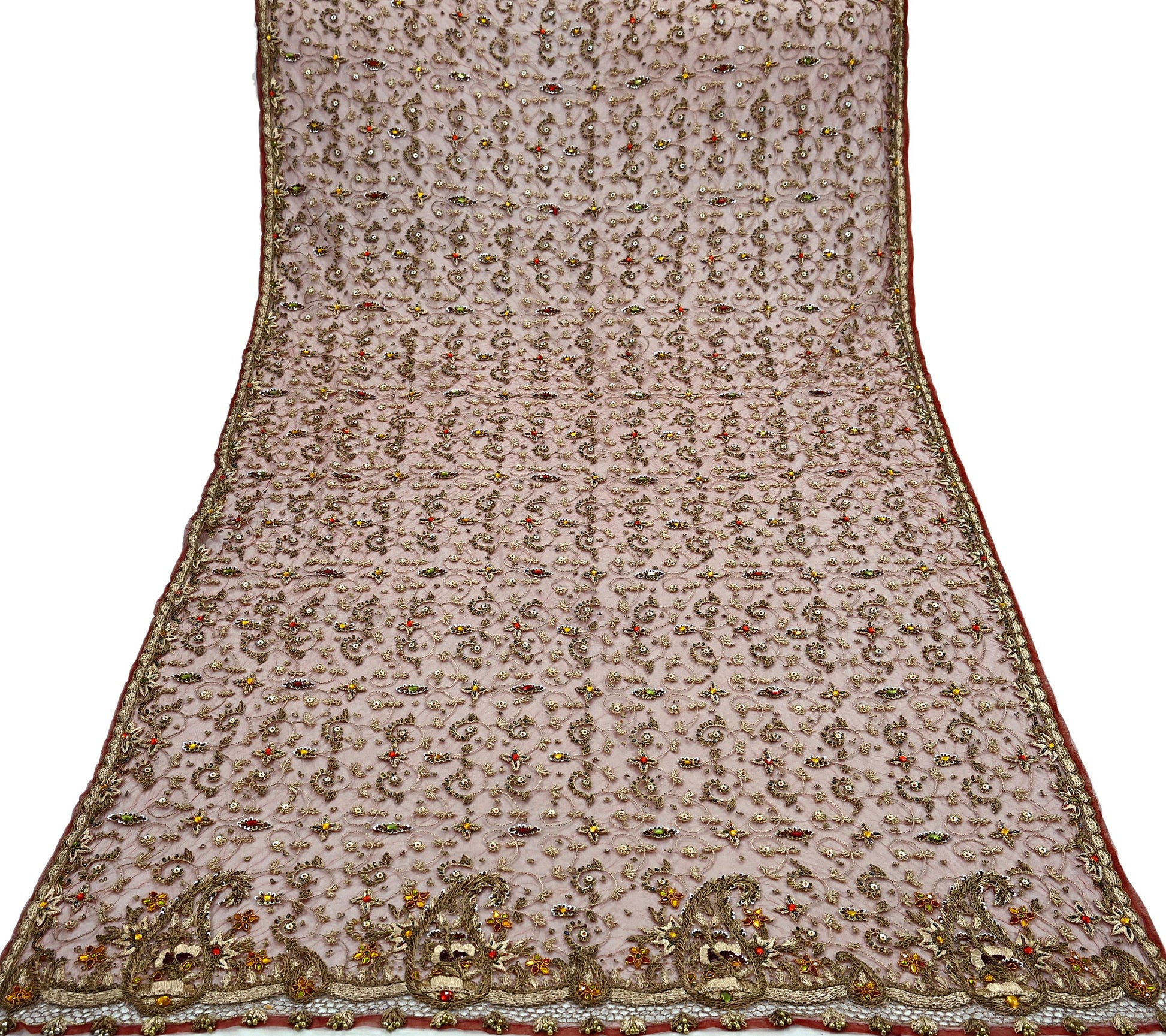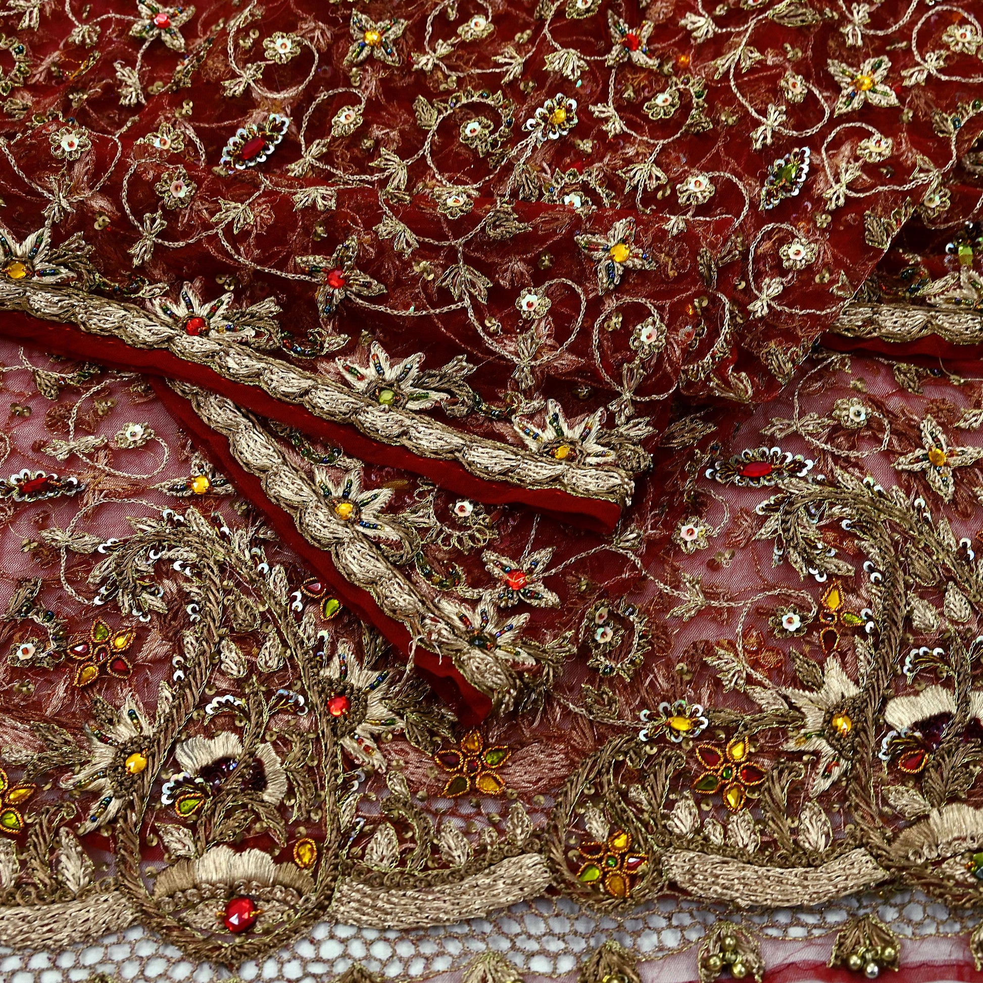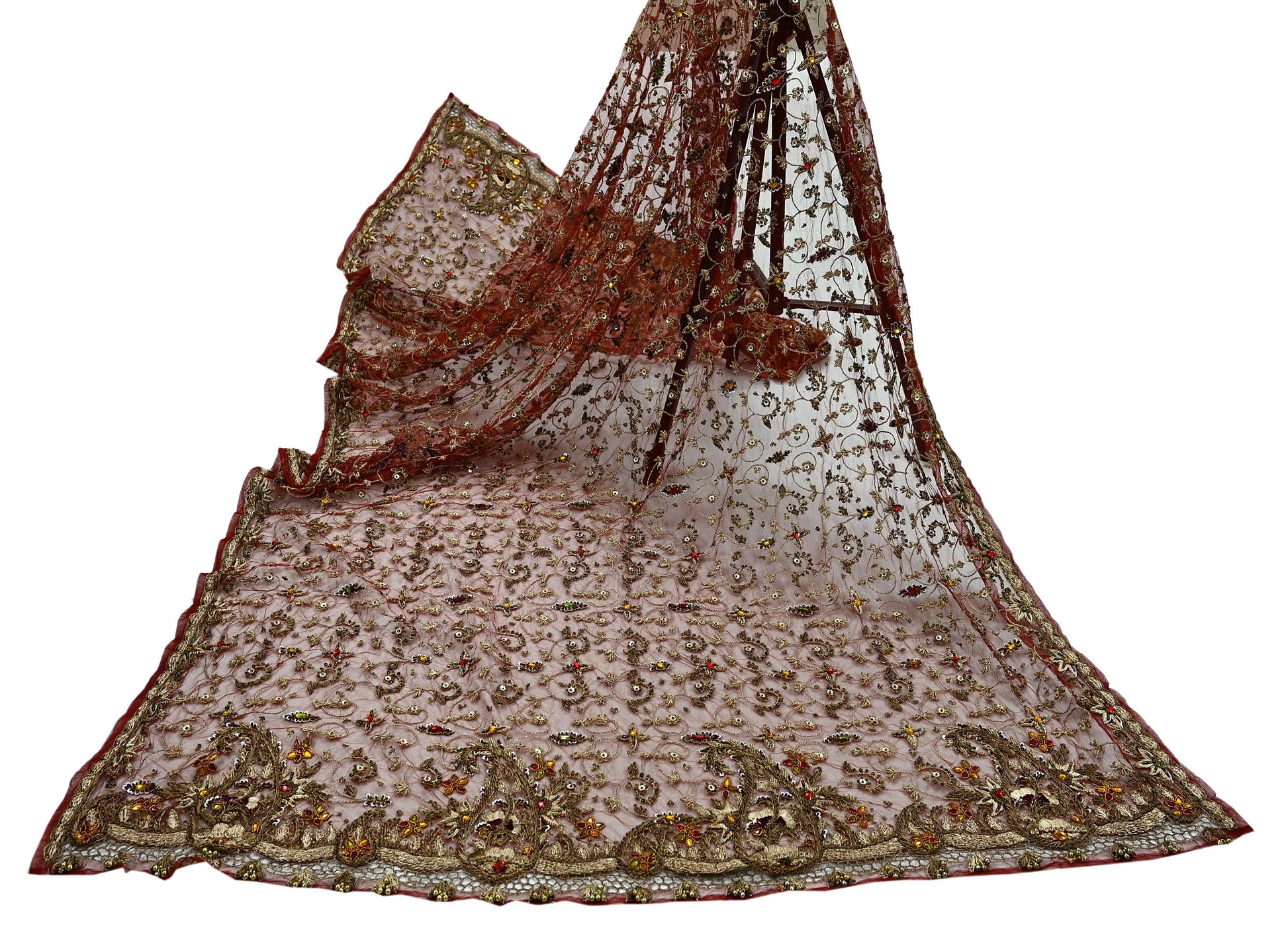 Indian Vintage Heavy Wedding Maroon Dupatta Net Mesh Long Stole Hand Embroidered Scarves Golden Zardozi Zari Sequins Dridal Veil Hijab