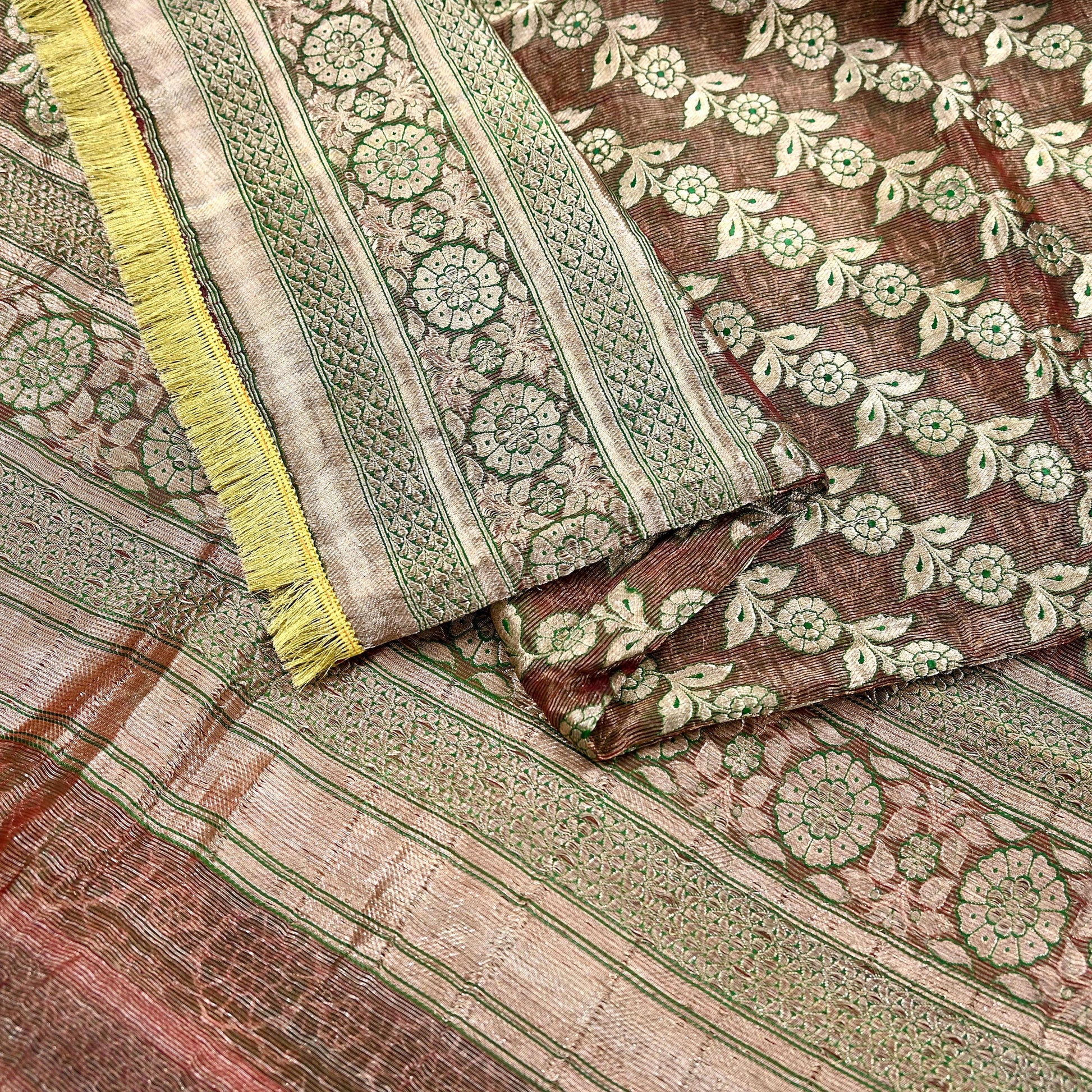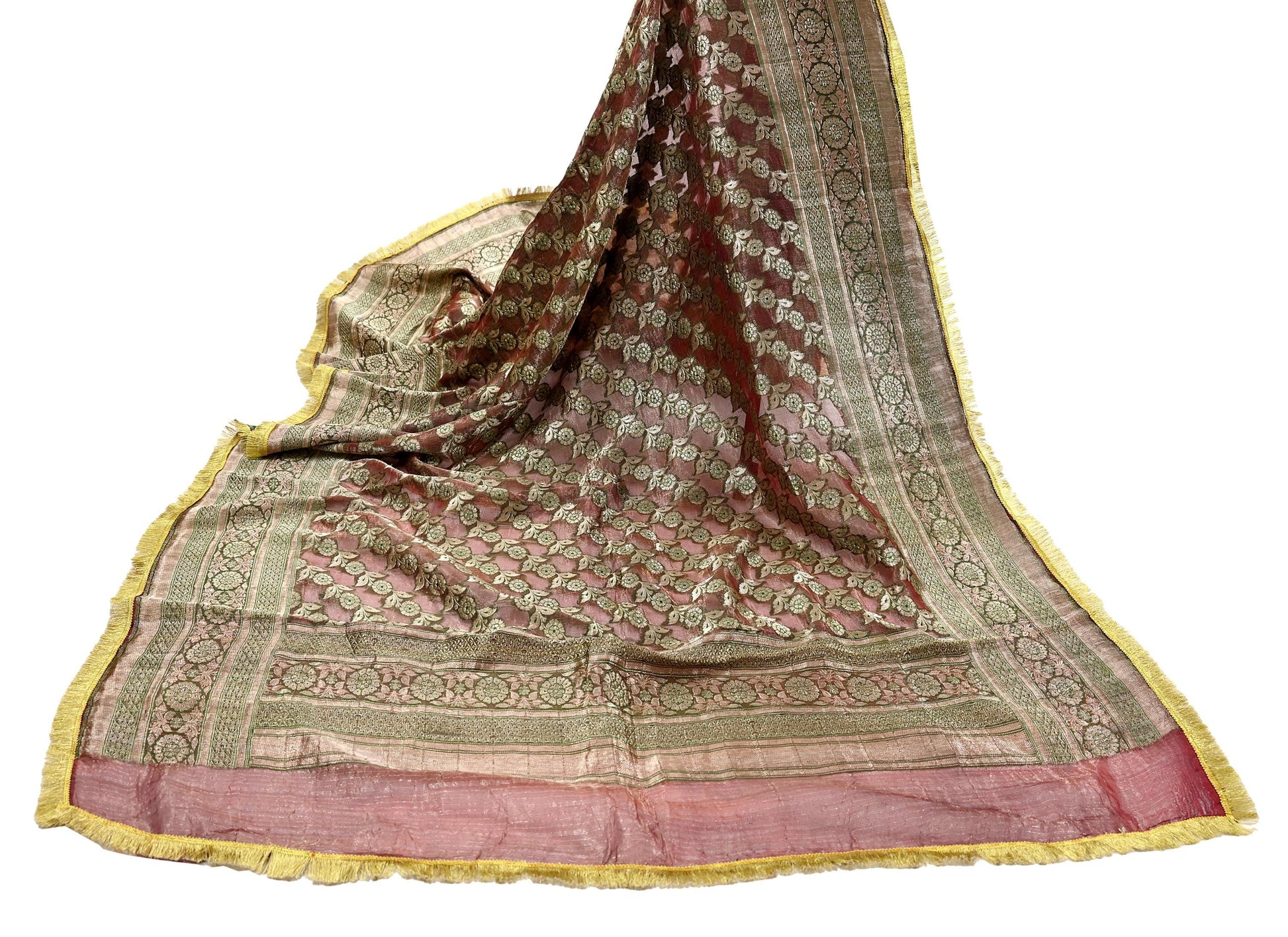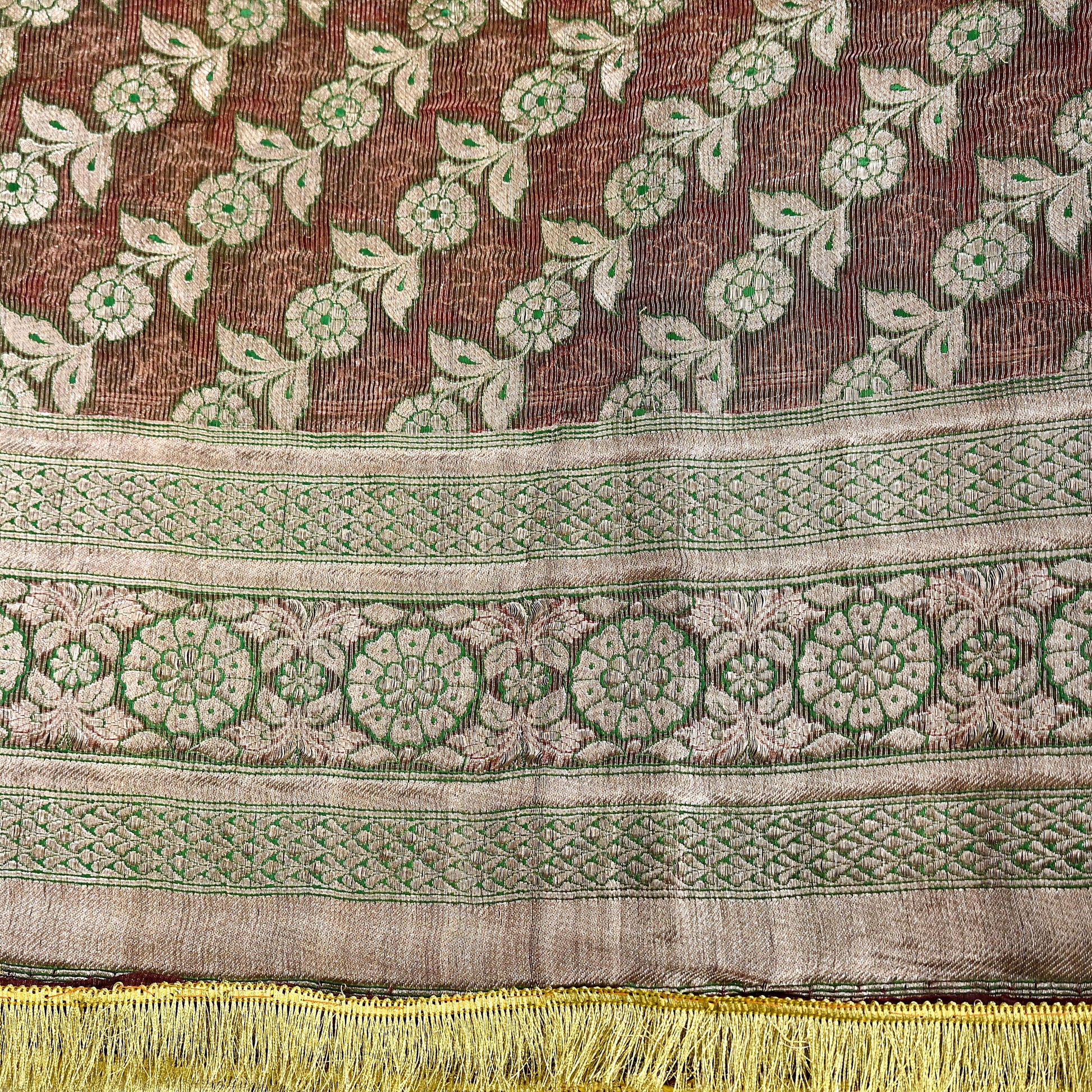 Stunning Very Heavy Dupatta Hand Woven Banarasi 100% Pure Organza Silk Dupatta/Stole In Maroon Color Fabric. This one of a kind item is difficult to express in words. Border feature is Paisley design embroidered pure metallic golden zari and green woven Thread work embellished work is the highlight of the dupatta. Also you can see similar Zardozi work with floral pattern in center part adds to its beauty. Golden Fringes work is giving a fabulous look to the dupatta. Awesome one !!!