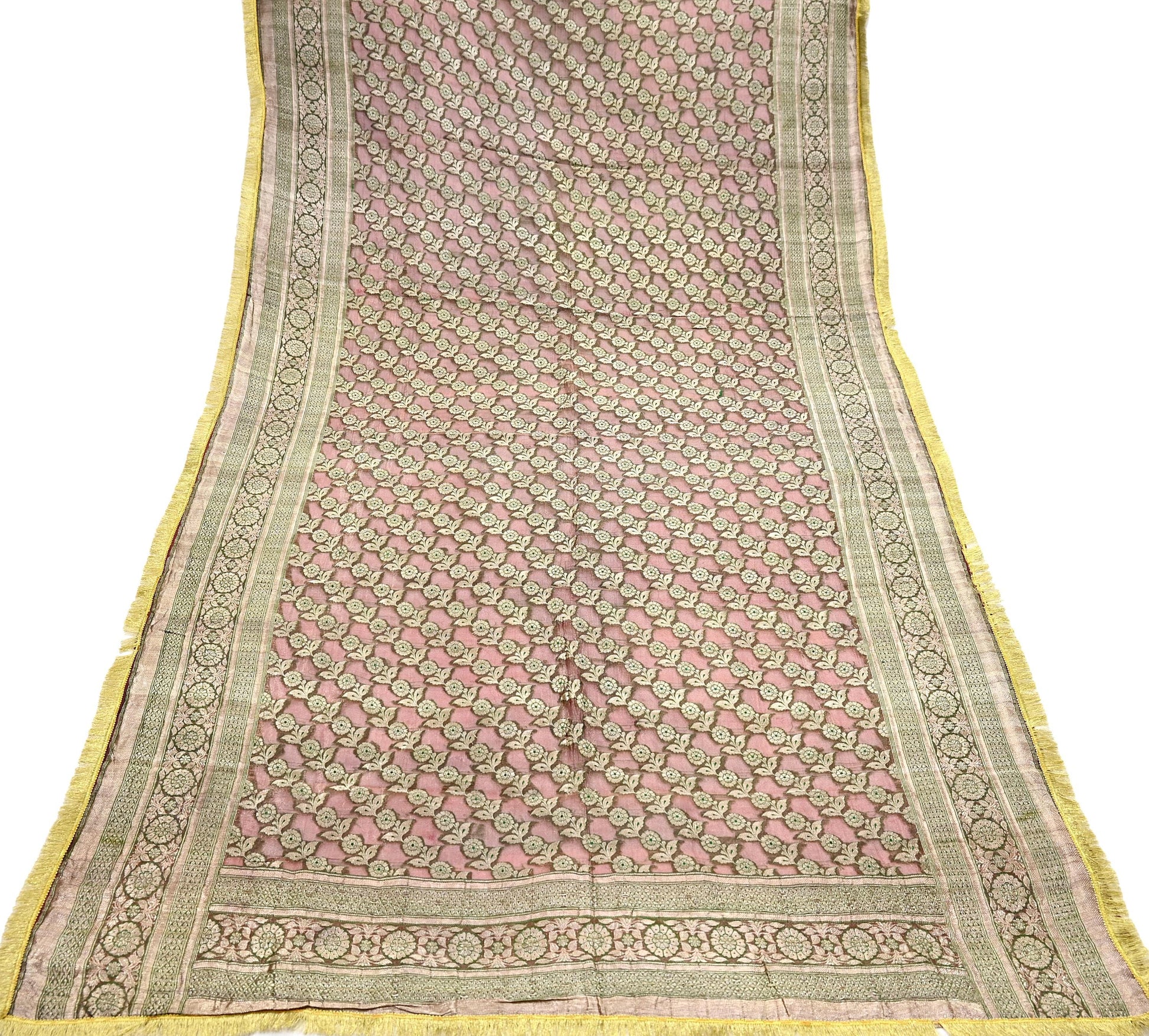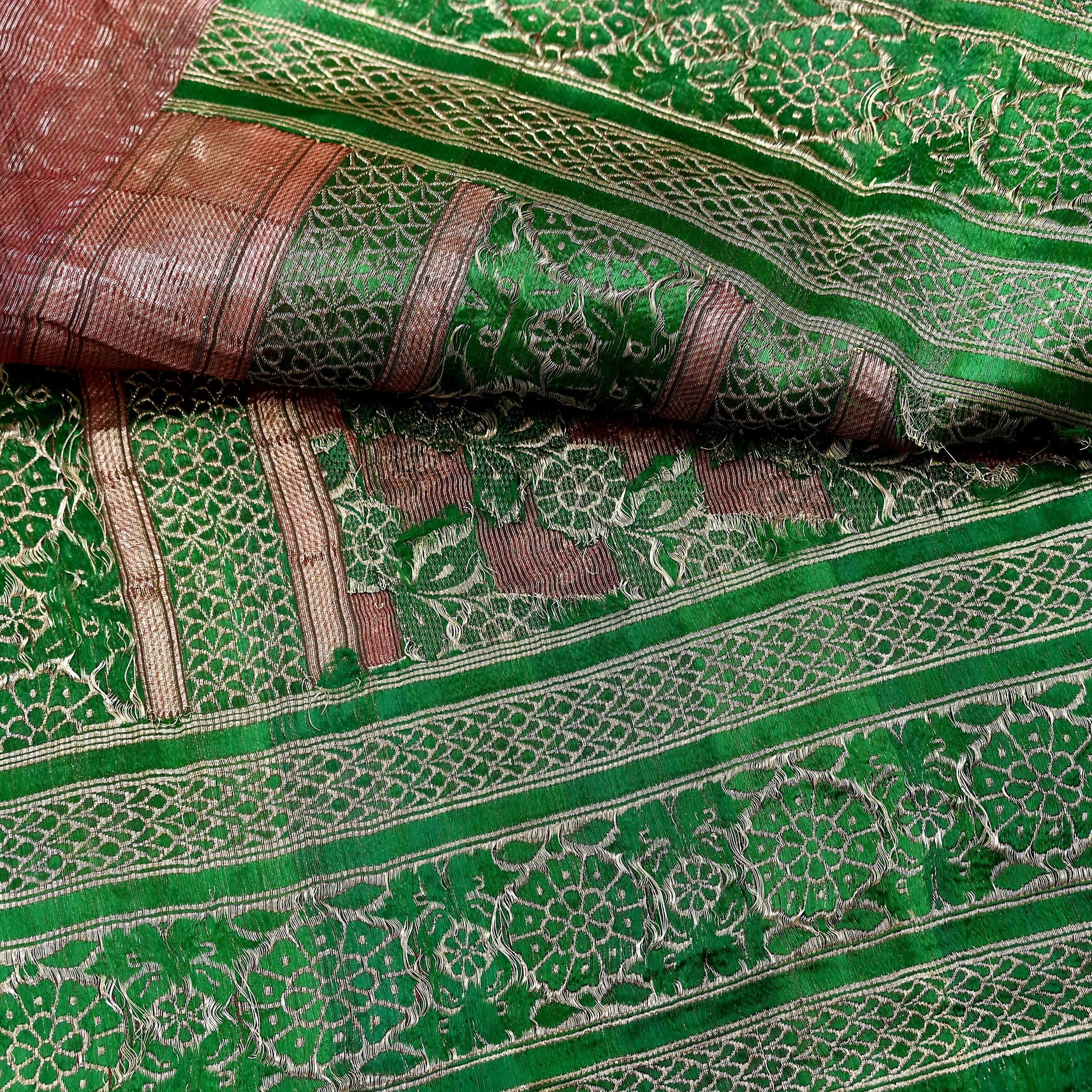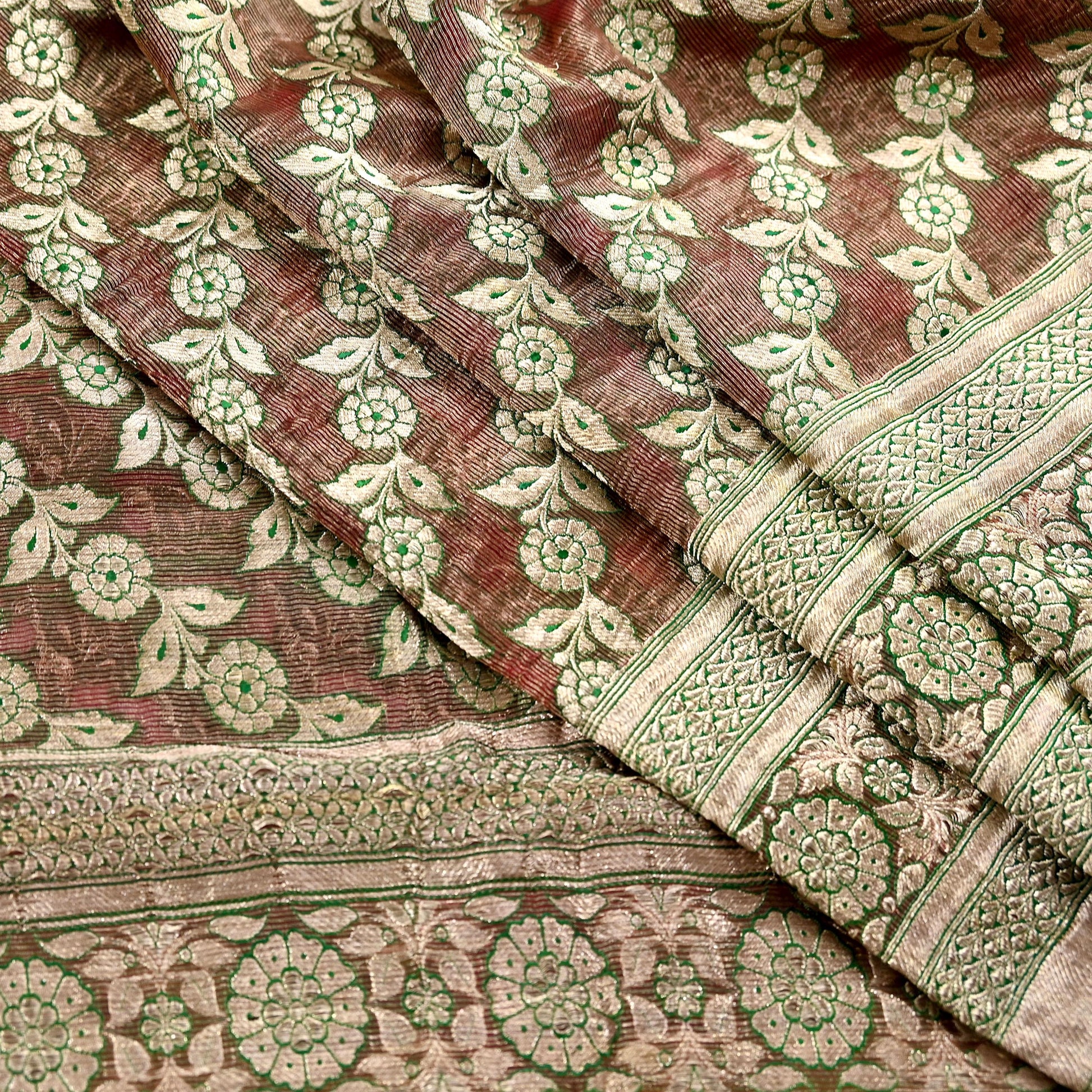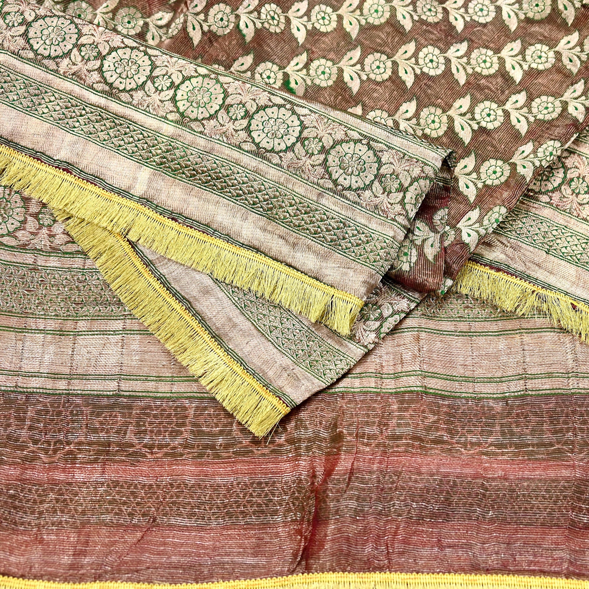 Stunning Very Heavy Dupatta Hand Woven Banarasi 100% Pure Organza Silk Dupatta/Stole In Maroon Color Fabric. This one of a kind item is difficult to express in words. Border feature is Paisley design embroidered pure metallic golden zari and green woven Thread work embellished work is the highlight of the dupatta. Also you can see similar Zardozi work with floral pattern in center part adds to its beauty. Golden Fringes work is giving a fabulous look to the dupatta. Awesome one !!!