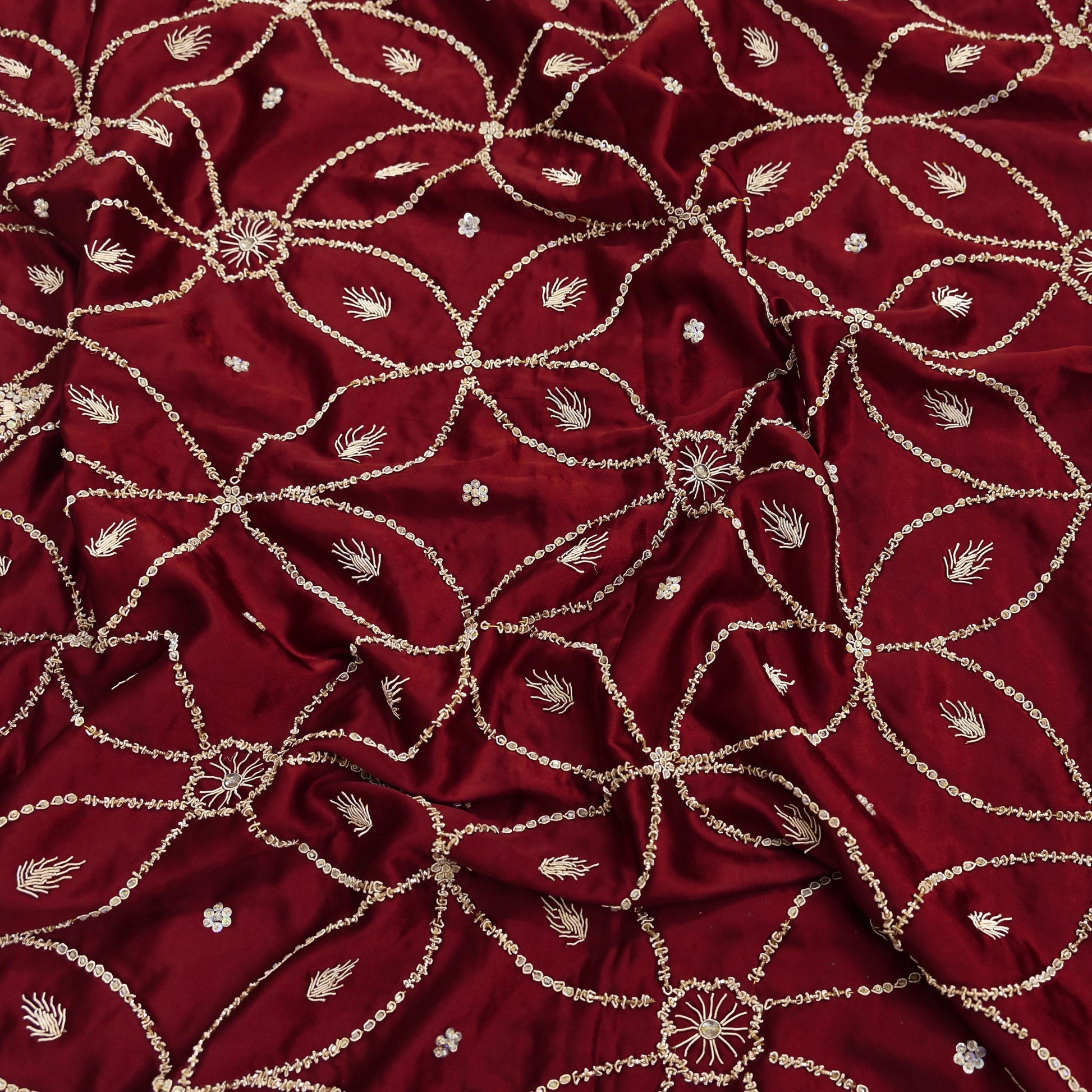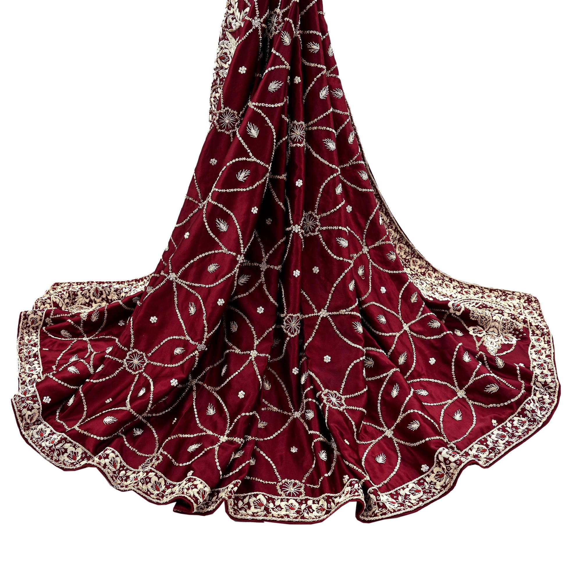 Indian Vintage Heavy Wedding Maroon Dupatta Pure Satin Silk Long Stole Hand Embroidered Scarves Golden Zardozi Bridal Veil