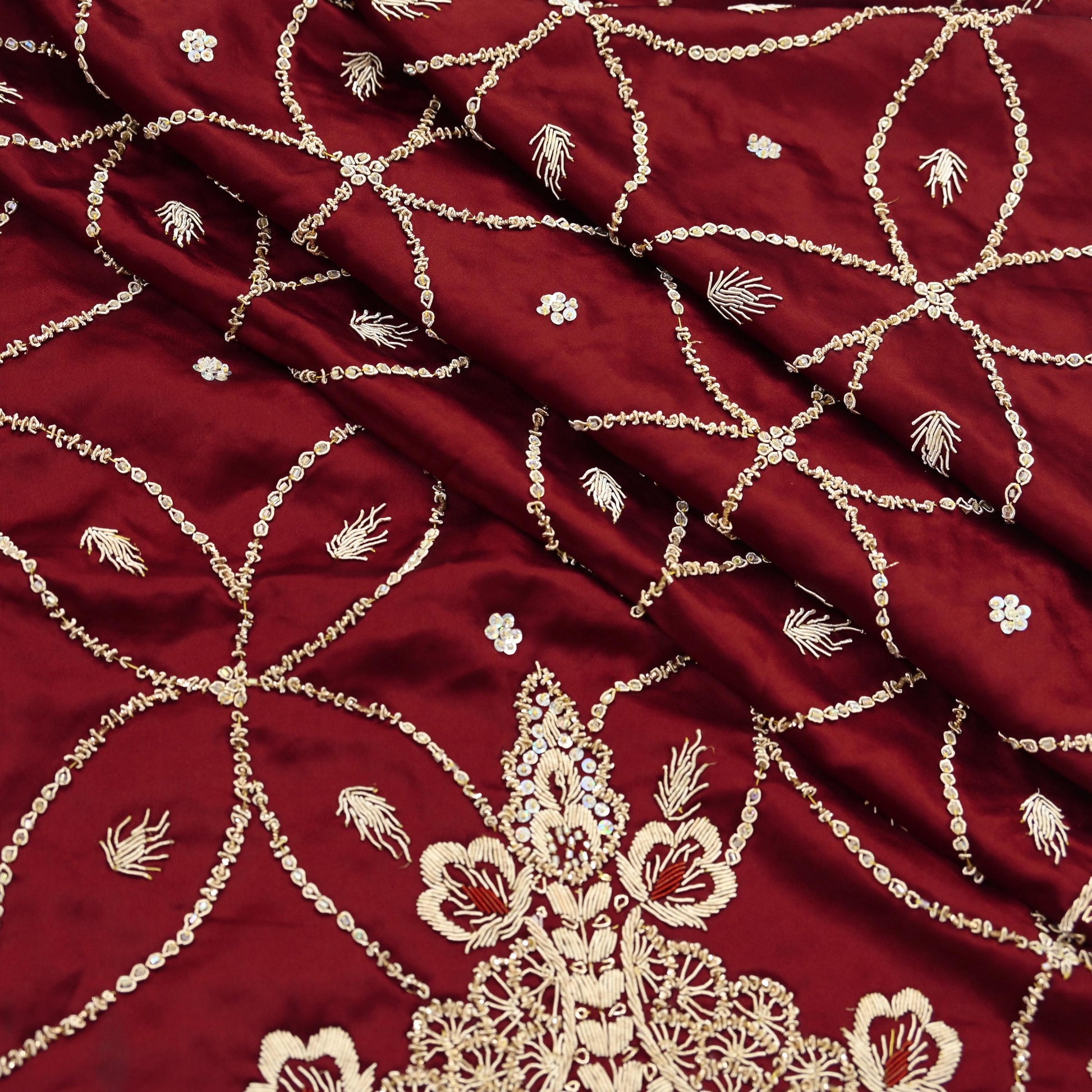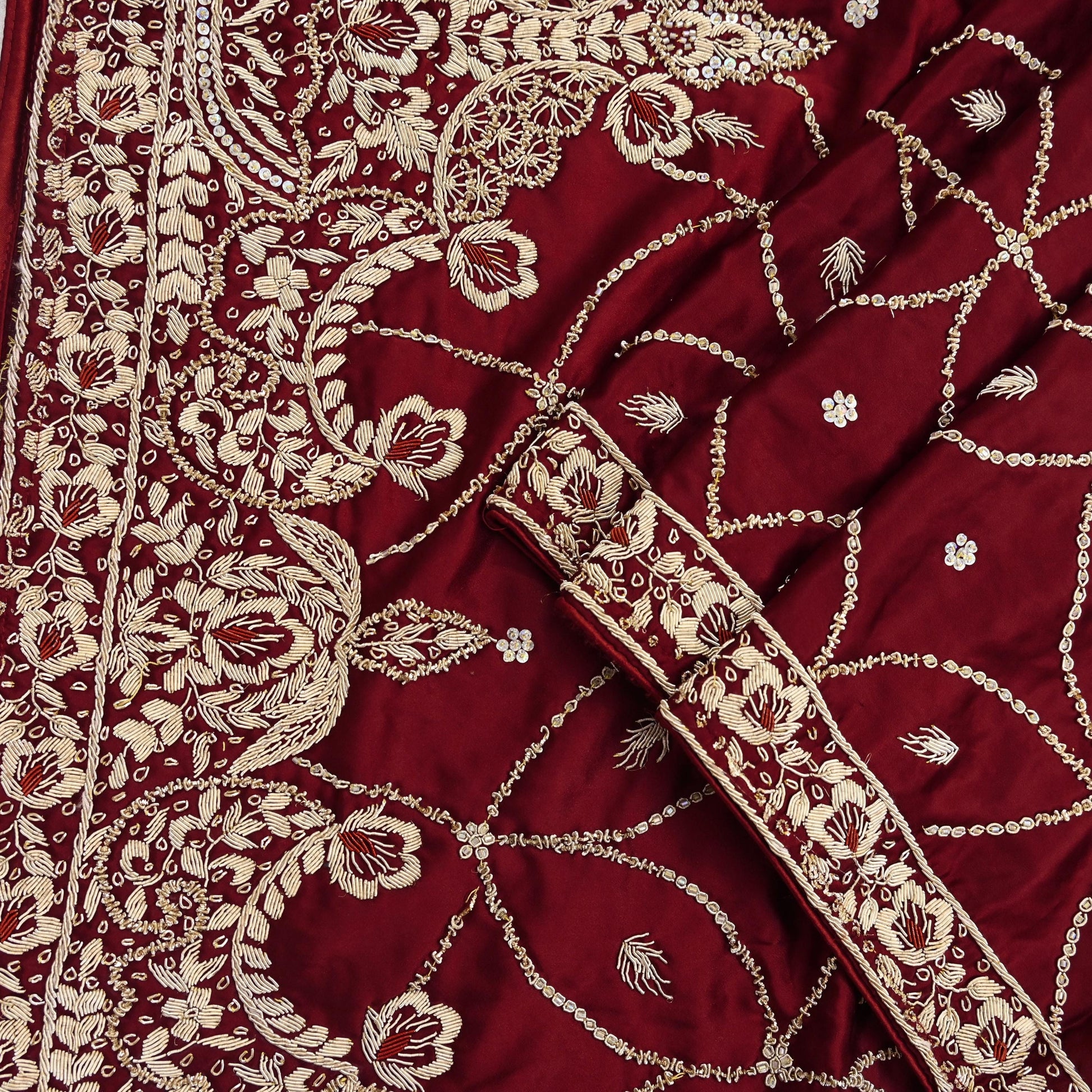 Stunning Very Heavy Dupatta Hand Embroidered 100% Pure Satin Silk Dupatta/Stole In Maroon Color Fabric. This one of a kind item is difficult to express in words. Border feature is floral & Paisley design embroidered pure metallic Golden & Red zardozi, Dakba, Zari, White Glass Beadeds, Silver Sequins, White Beaded work embellished work is the highlight of the dupatta. Also you can see similar work with floral pattern in center part adds to its beauty. Glass Beaded Work is giving a fabulous look to the dupatta. Awesome one !!!