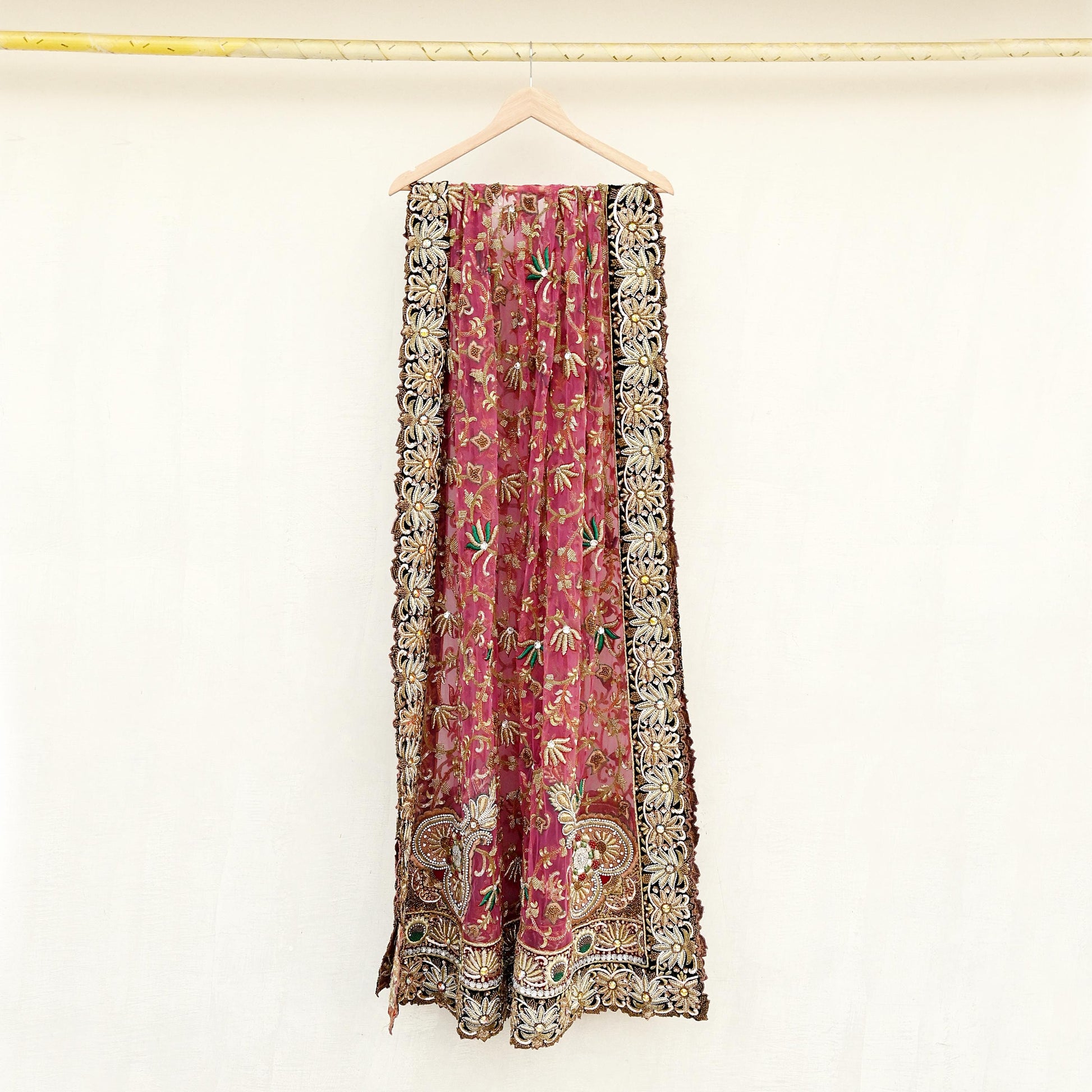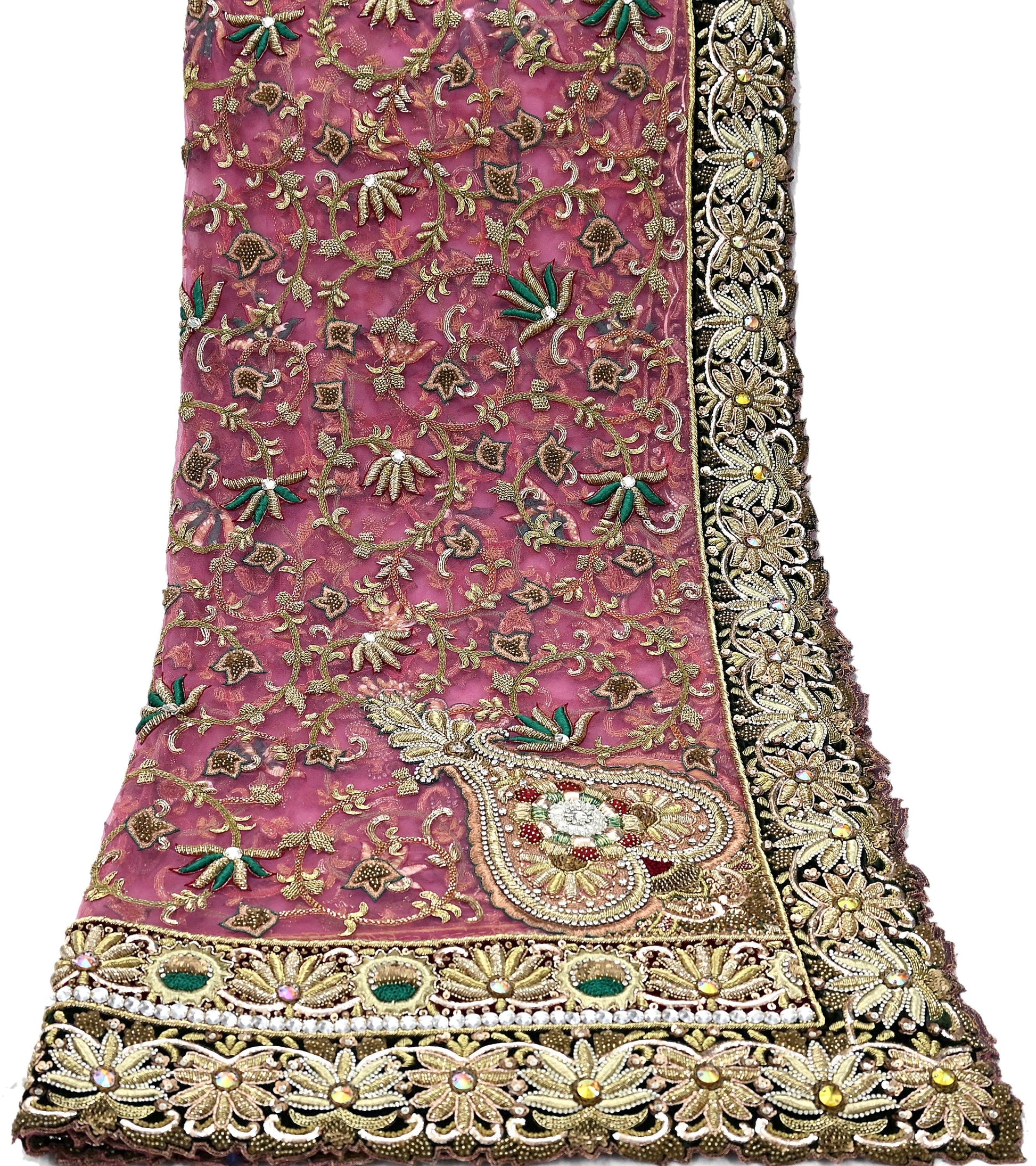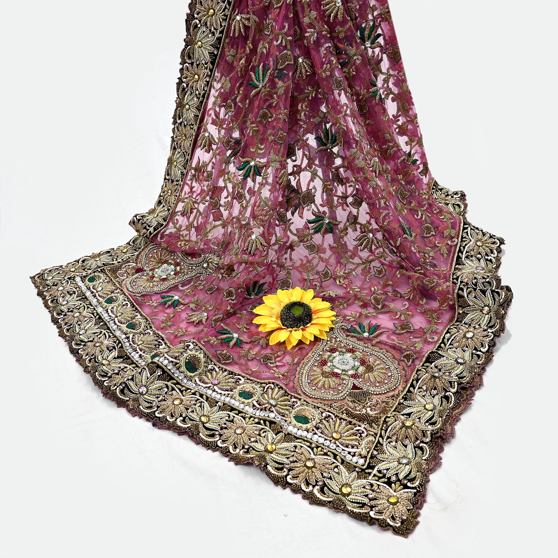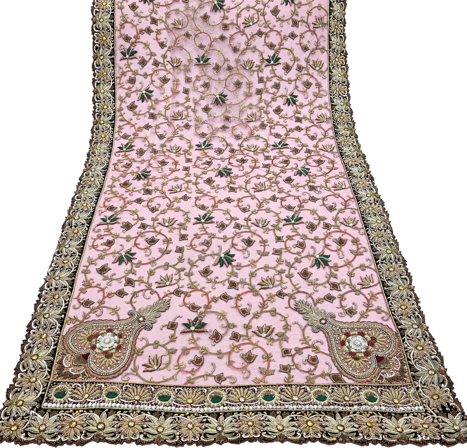 Indian Vintage Heavy Wedding Pink Net/Mesh/ Velvet Hand Embroidered Dupatta Designer By Anamika Khanna Bridal Wear Dabka Zardozi Veil Hijab