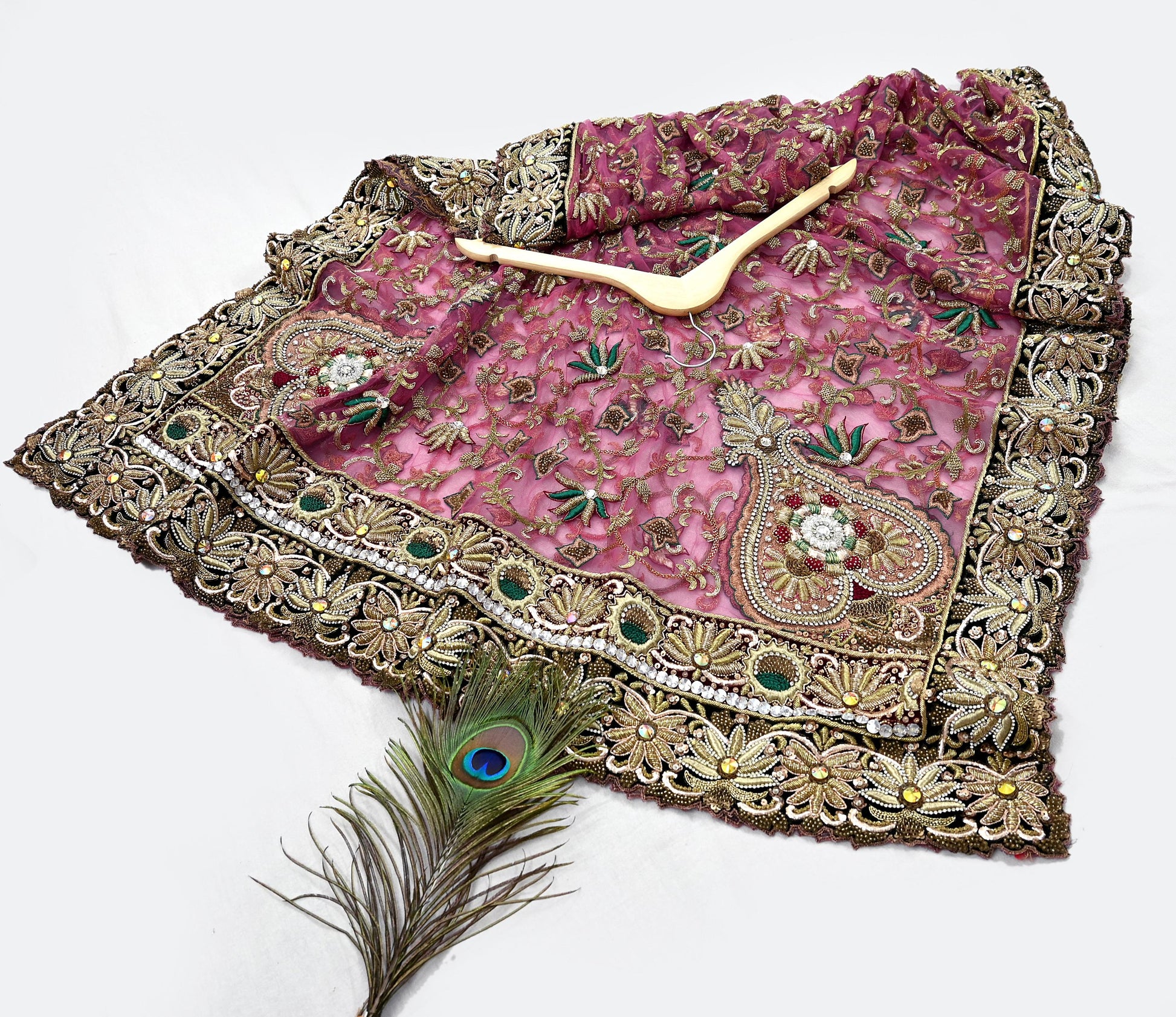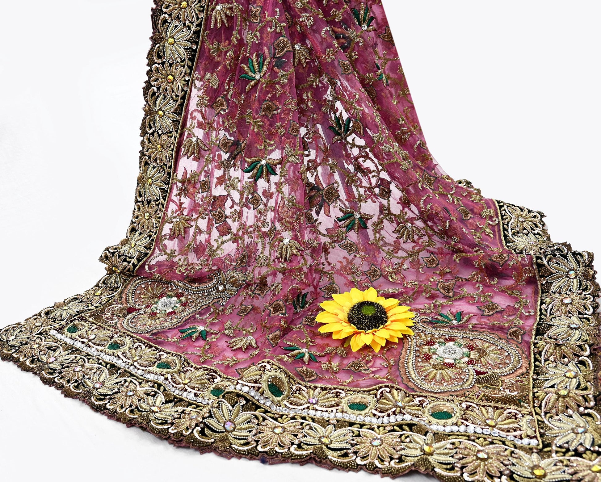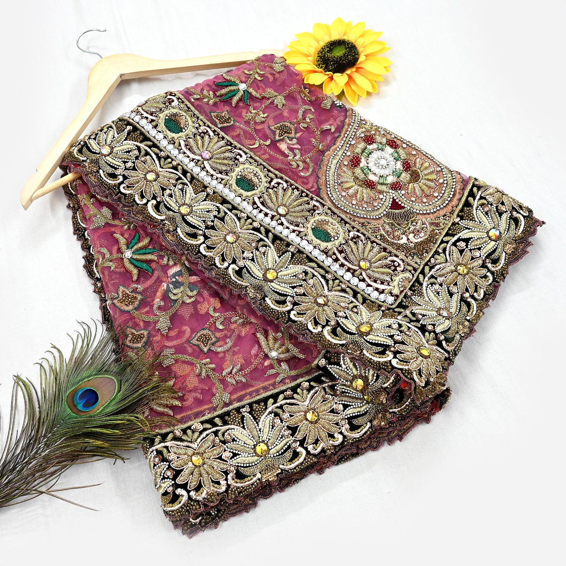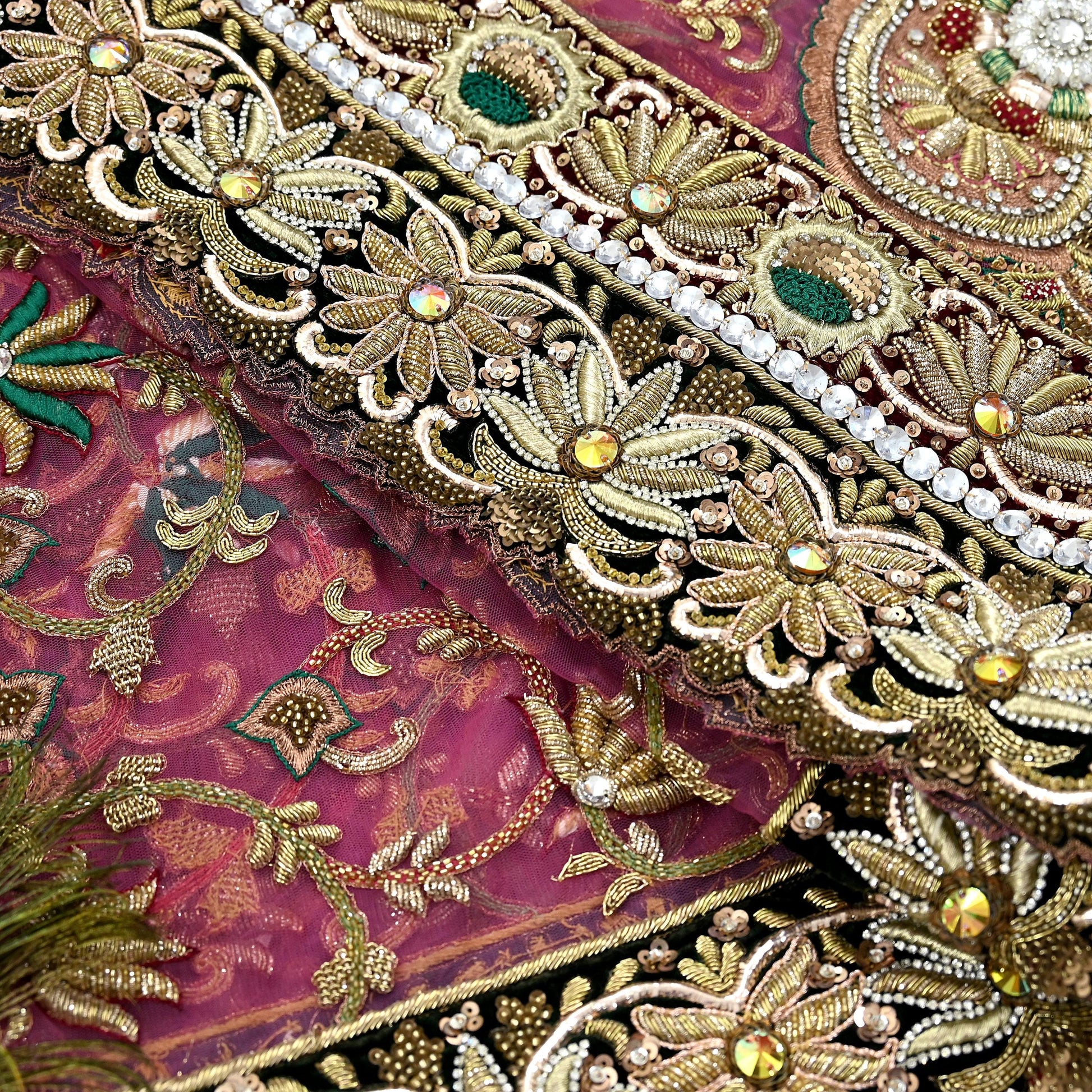 Indian Vintage Heavy Wedding Pink Net/Mesh/ Velvet Hand Embroidered Dupatta Designer By Anamika Khanna Bridal Wear Dabka Zardozi Veil Hijab