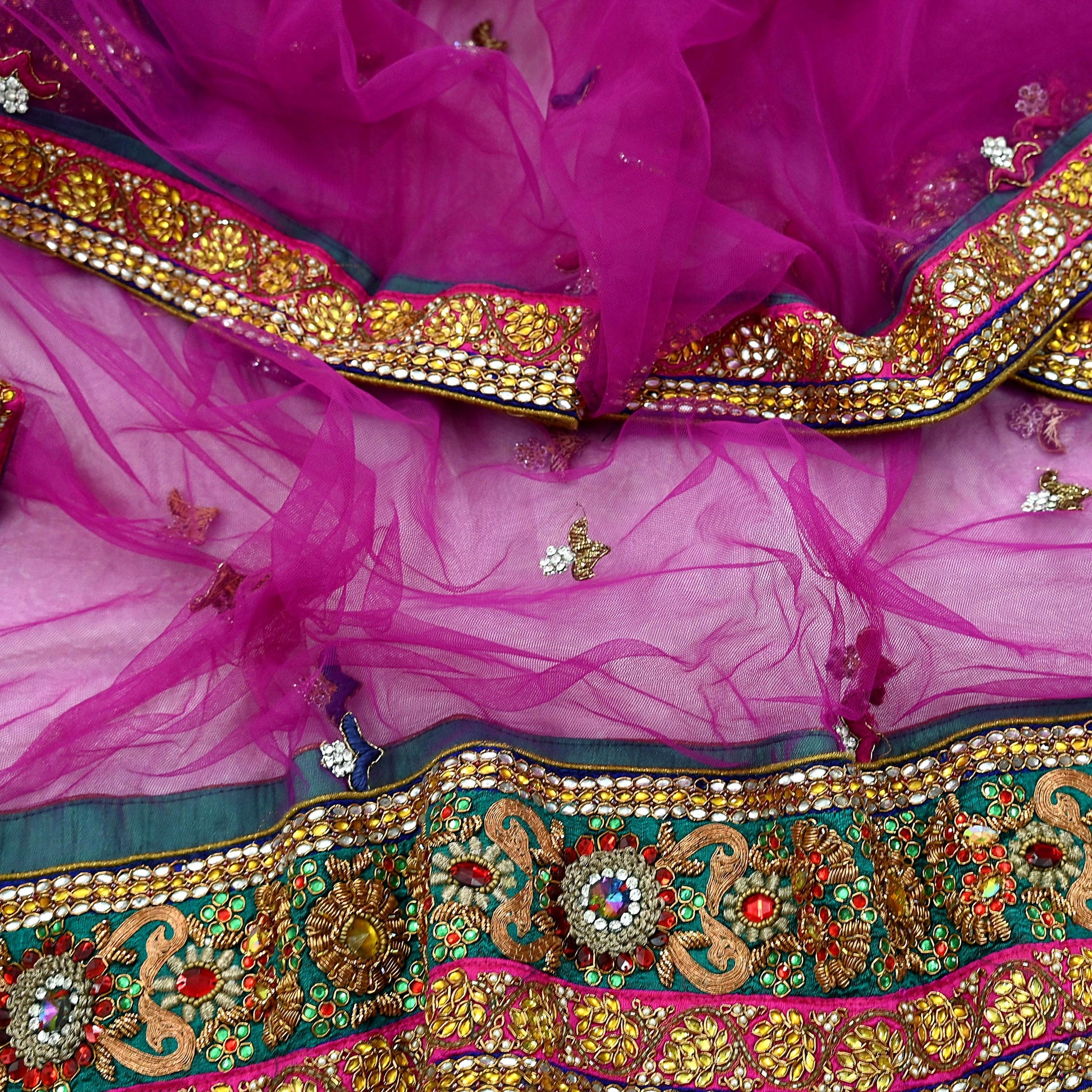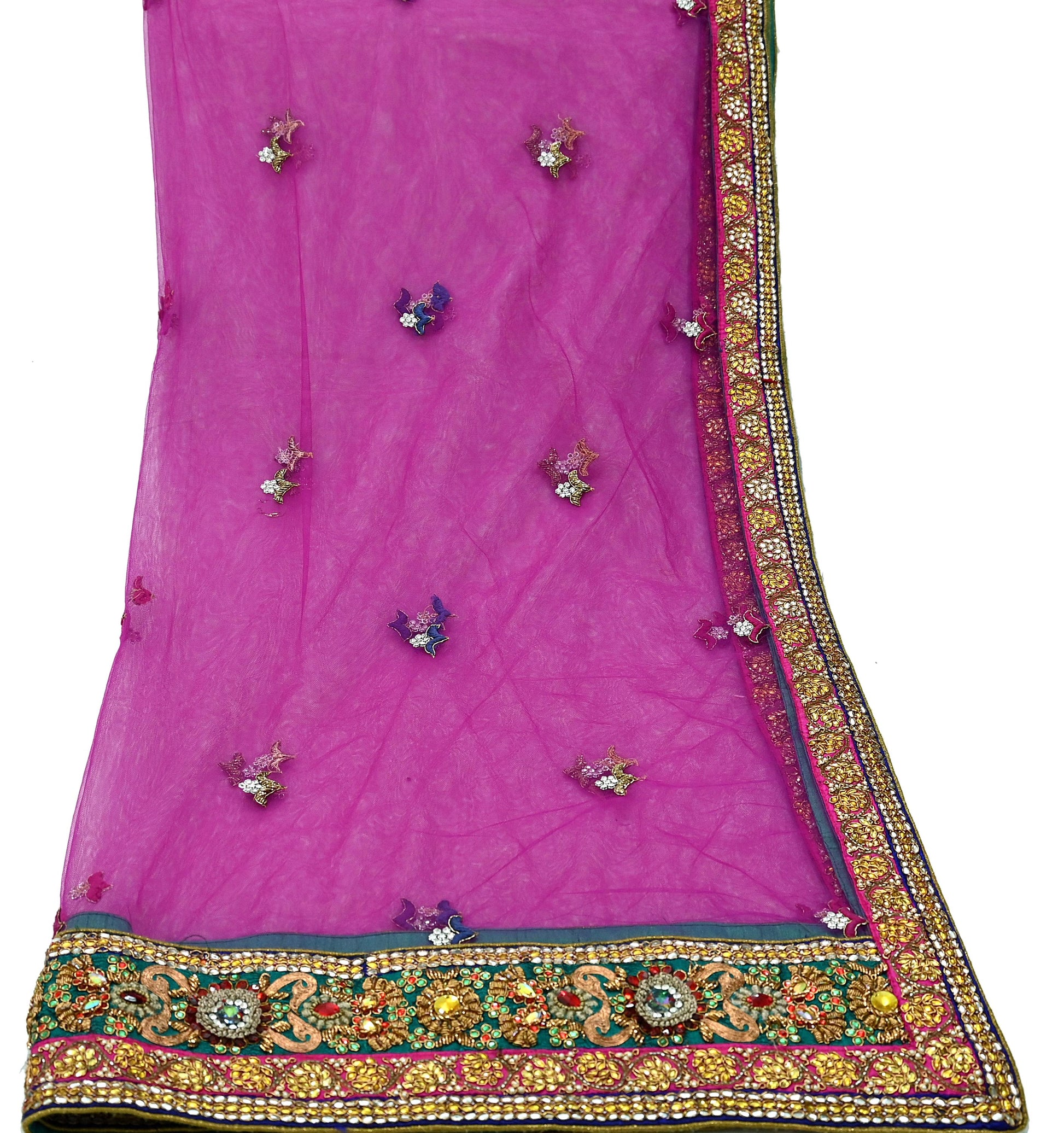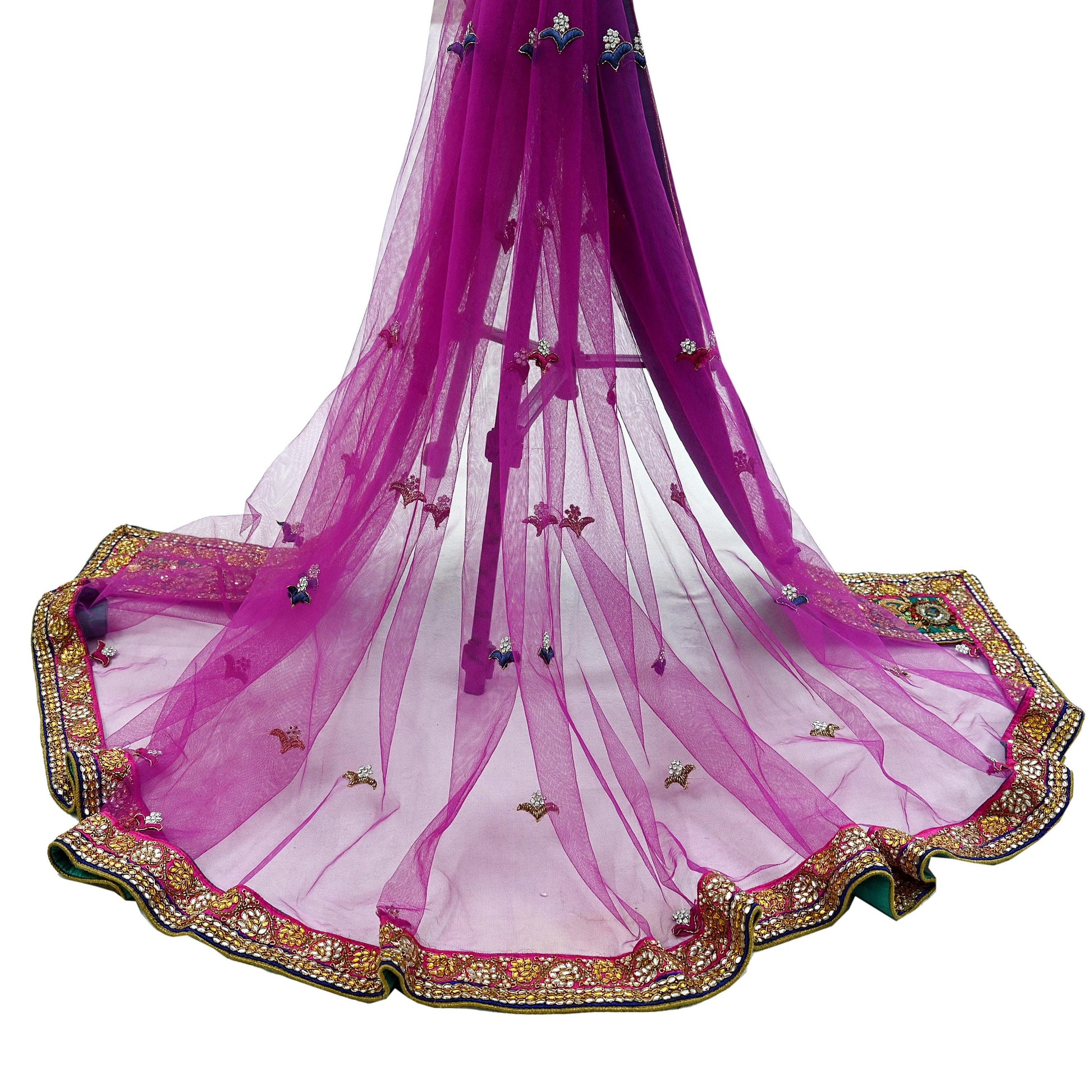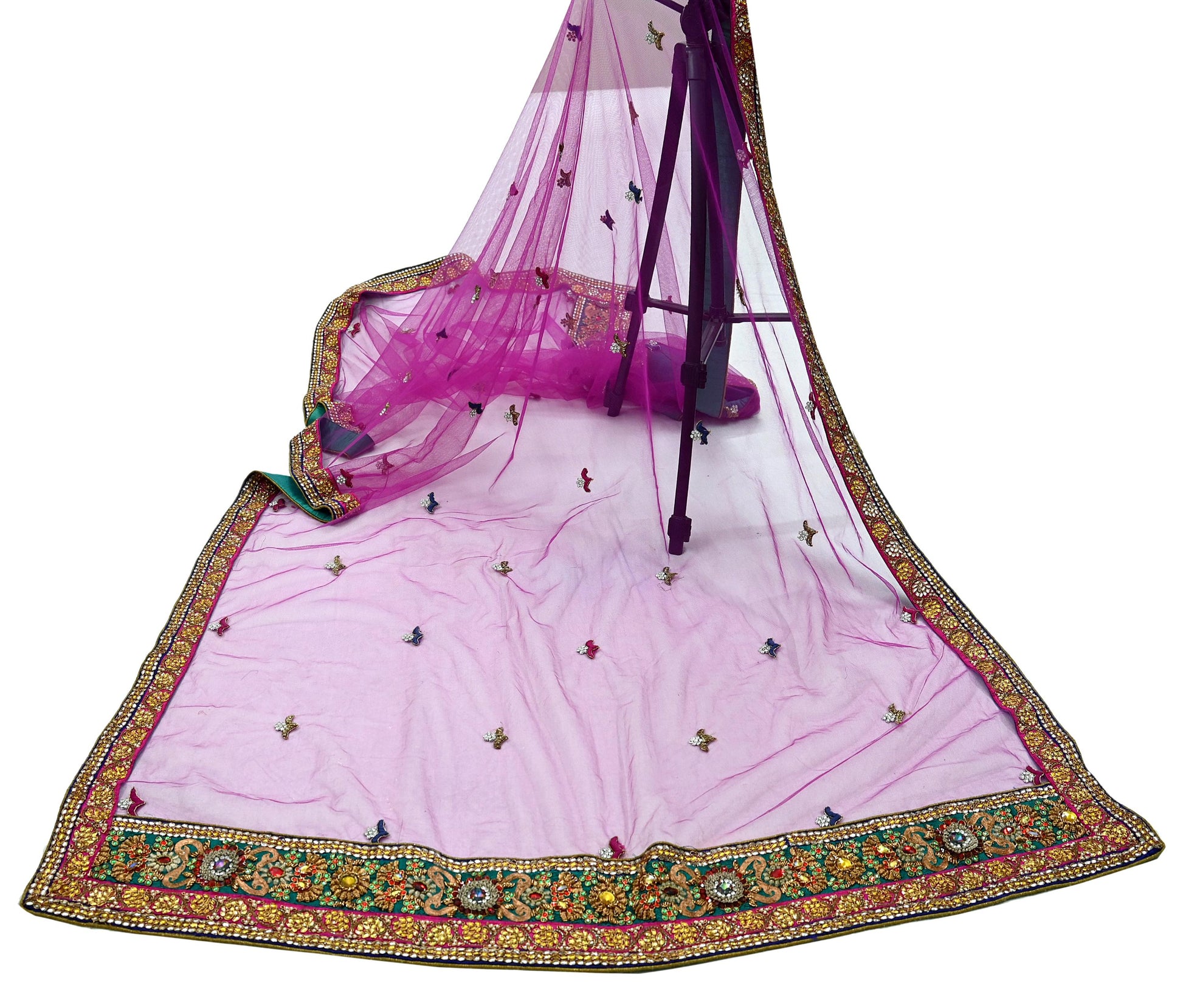 Stunning Beautiful Heavy Dupatta Hand Embroidered Net Dupatta/Stole In Purple Color Fabric. This one of a kind item is difficult to express in words. Border feature is floral & Paisley design embroidered pure metallic Golden zardozi/ Dabka, Zari, White, Red & Green & Yellow stone And Golden Sequins, White Pearl Like Beaded, Golden Glass Beaded work embellished work is the highlight of the dupatta. Also you can see similar Zardozi, Beaded work with floral pattern in center part adds to its beauty. Green & Purple Border work is giving a fabulous look to the dupatta. Awesome one !!!