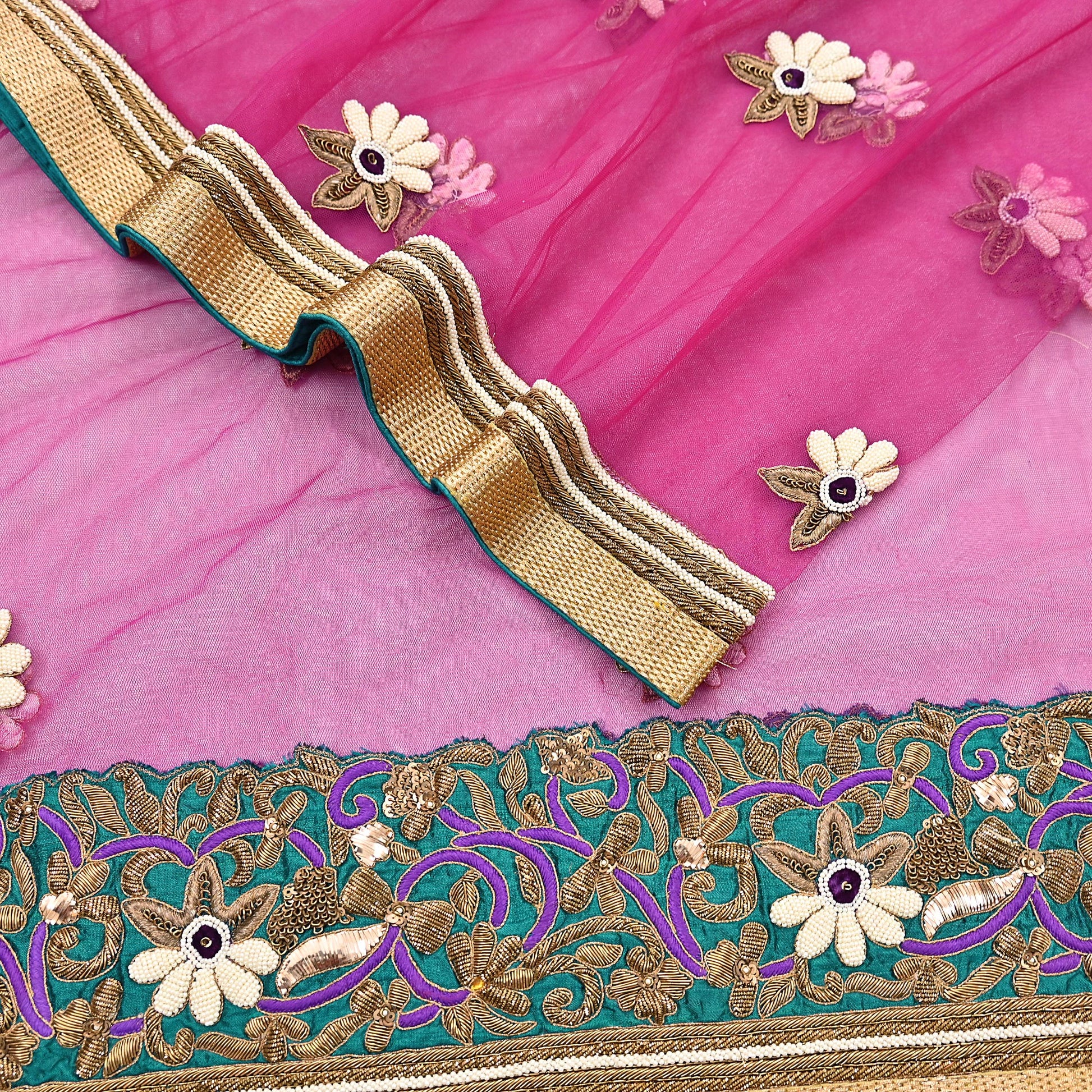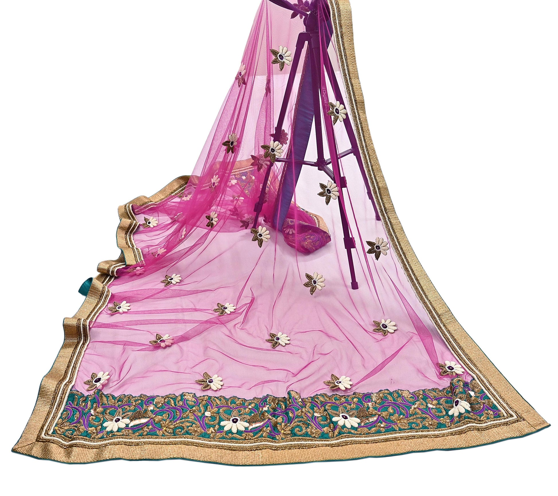 Stunning Beautiful Heavy Dupatta Hand Embroidered Net Dupatta/Stole In Purple Color Fabric. This one of a kind item is difficult to express in words. Border feature is floral & Paisley design embroidered pure metallic Golden zardozi/ Dabka, Zari, Copper Sequins, White Pearl Like Beaded, purple thread, mukesh work embellished work is the highlight of the dupatta. Also you can see similar Zardozi, Beaded work with floral pattern in center part adds to its beauty. purple velvet patches & green silk Border work is giving a fabulous look to the dupatta. Awesome one !!!