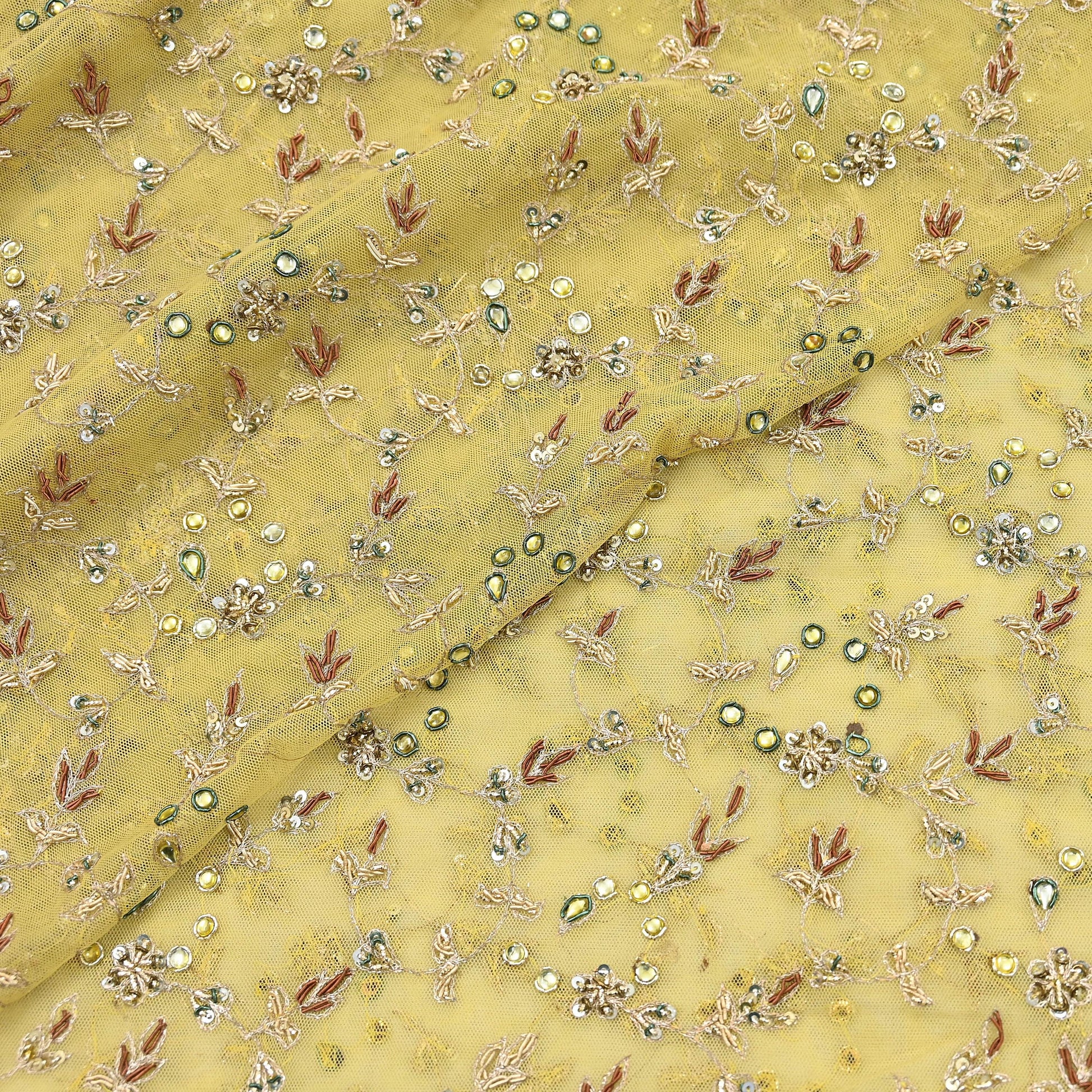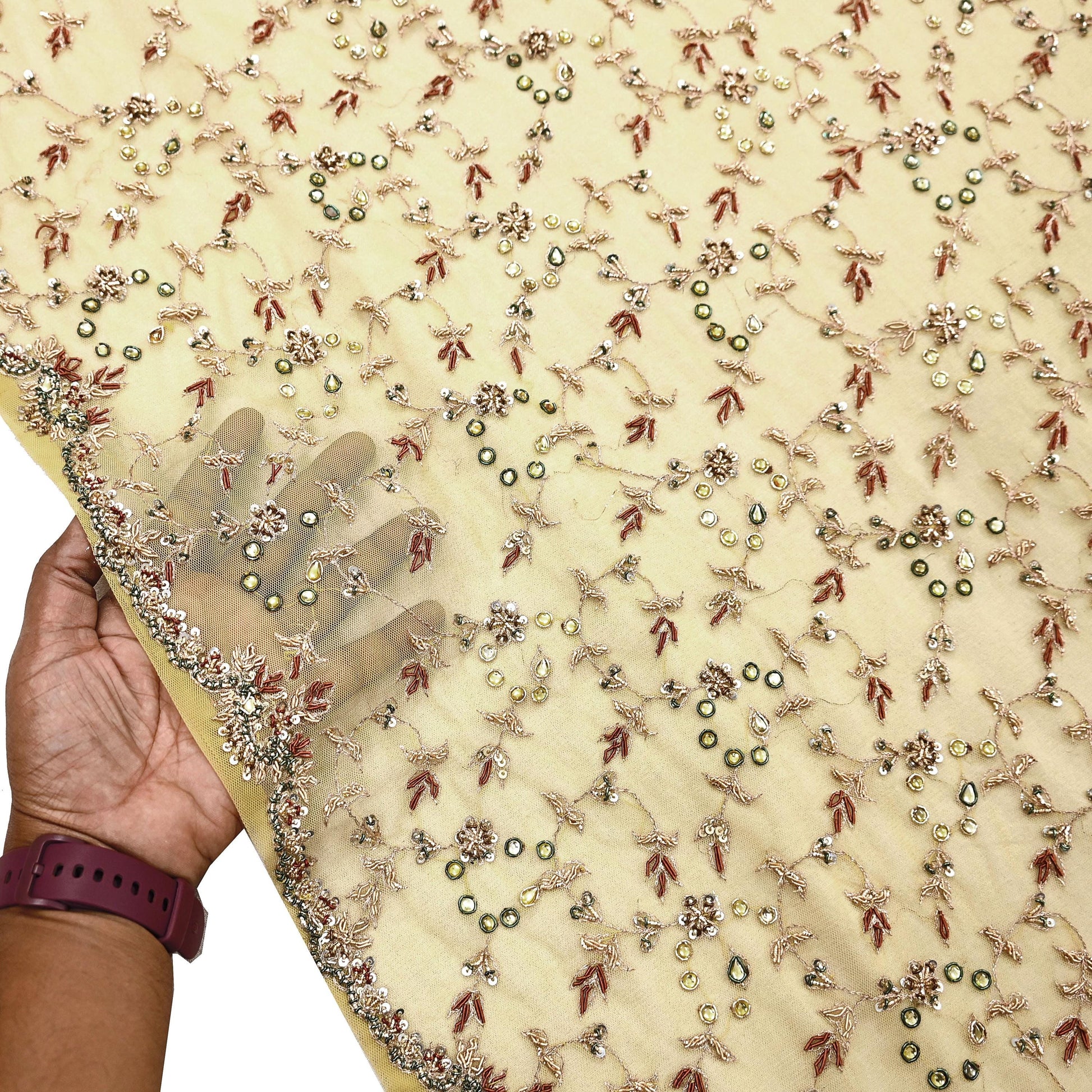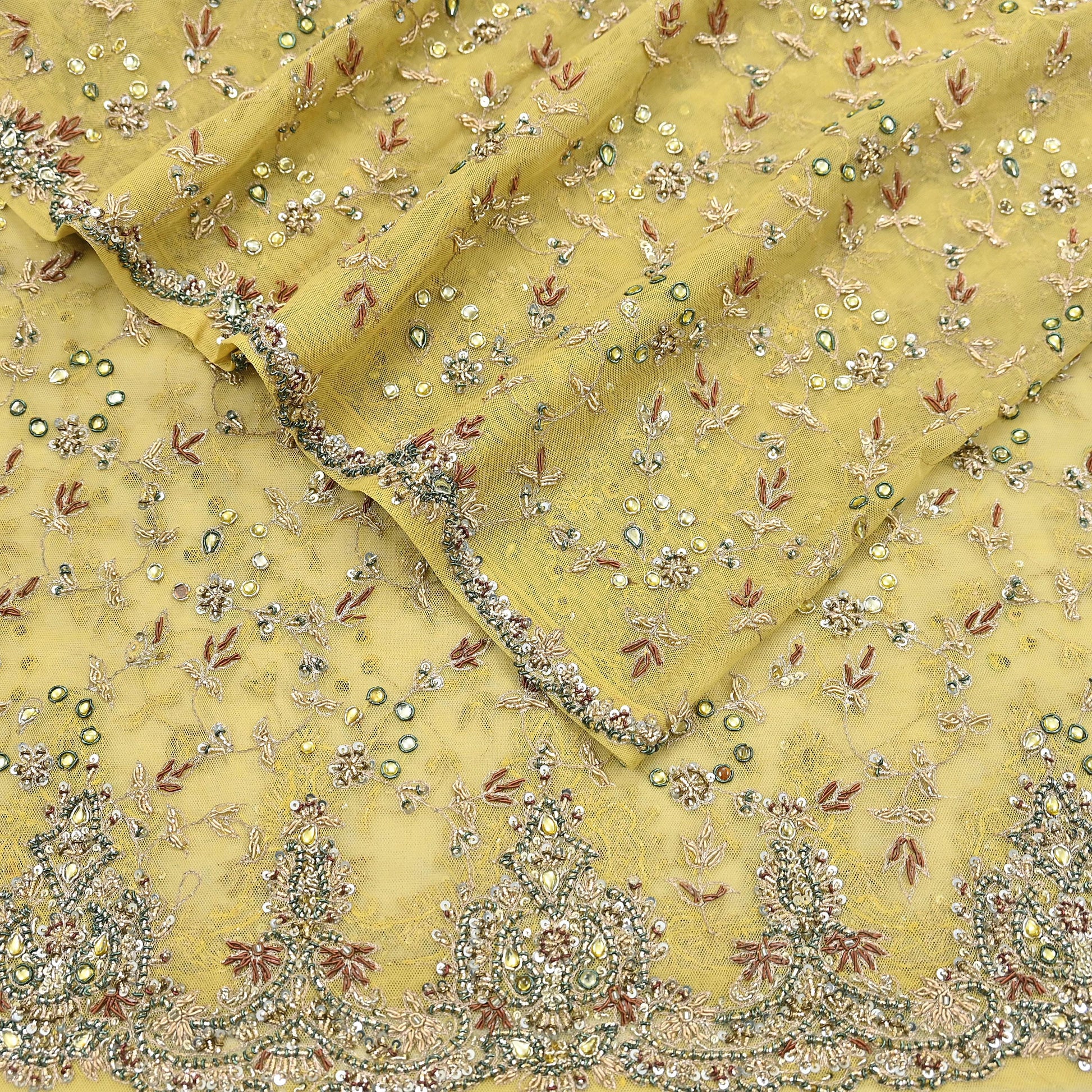 Stunning Beautiful Heavy Dupatta Hand Embroidered Net Dupatta/Stole In Yellow Color Fabric. This one of a kind item is difficult to express in words. Border feature is floral design embroidered pure metallic Golden, maroon & Green zardozi/Zari, Golden & Red Beaded And Golden Glass Beaded,Silver Sequins, Yellow Kundan Beaded work embellished work is the highlight of the dupatta. Also you can see similar Zardozi, Beded, work with floral pattern in center part adds to its beauty. Beautiful Zardozi Border work is giving a fabulous look to the dupatta. Awesome one !!!