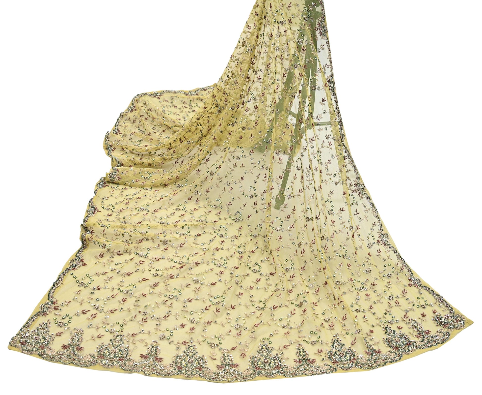 Indian Vintage Heavy Yellow Dupatta Net Mesh Long Stole Hand Embroidered Scarves Golden Zardozi Dabka Zari Stole