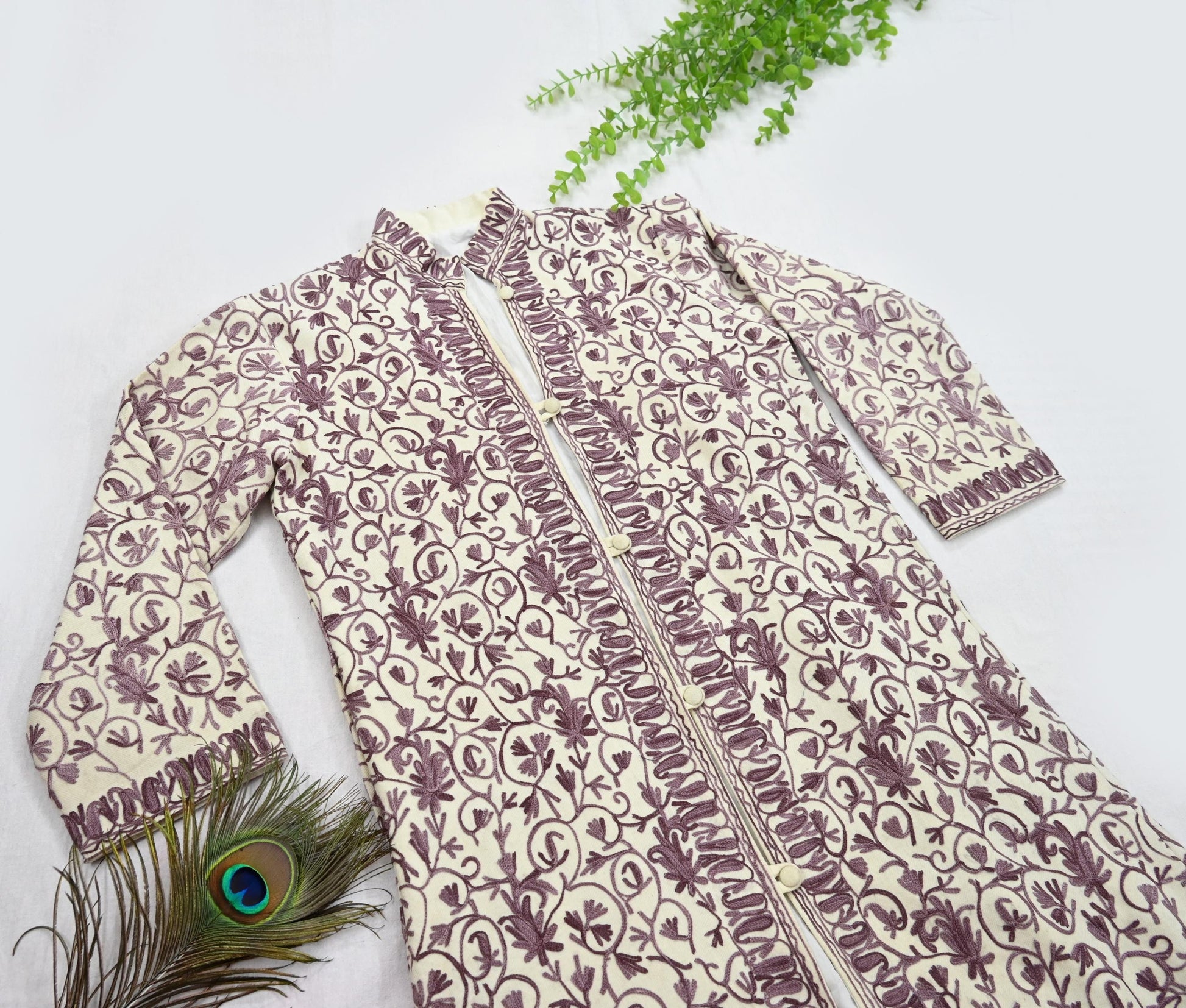Stunning Embroidered Kashmiri Coat – Ivory Pure Wool Fabric