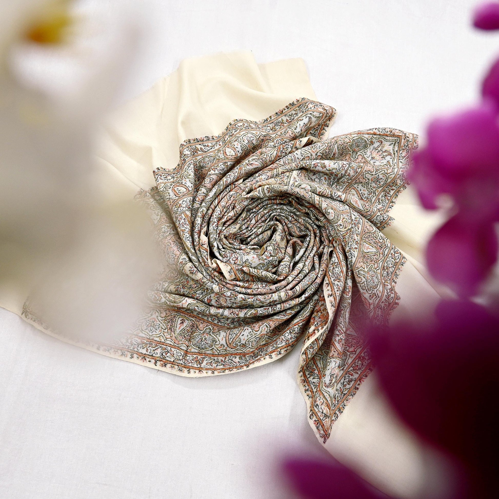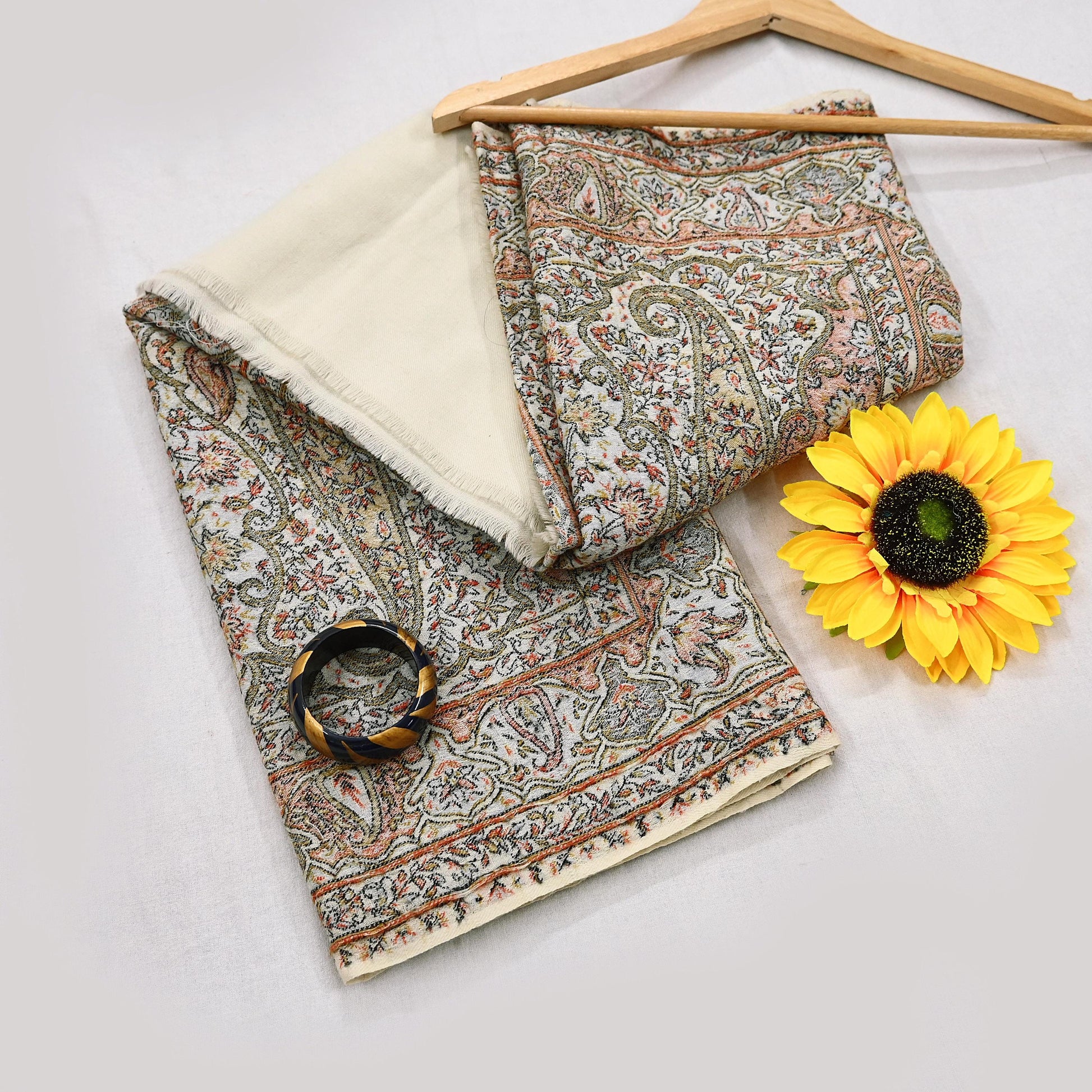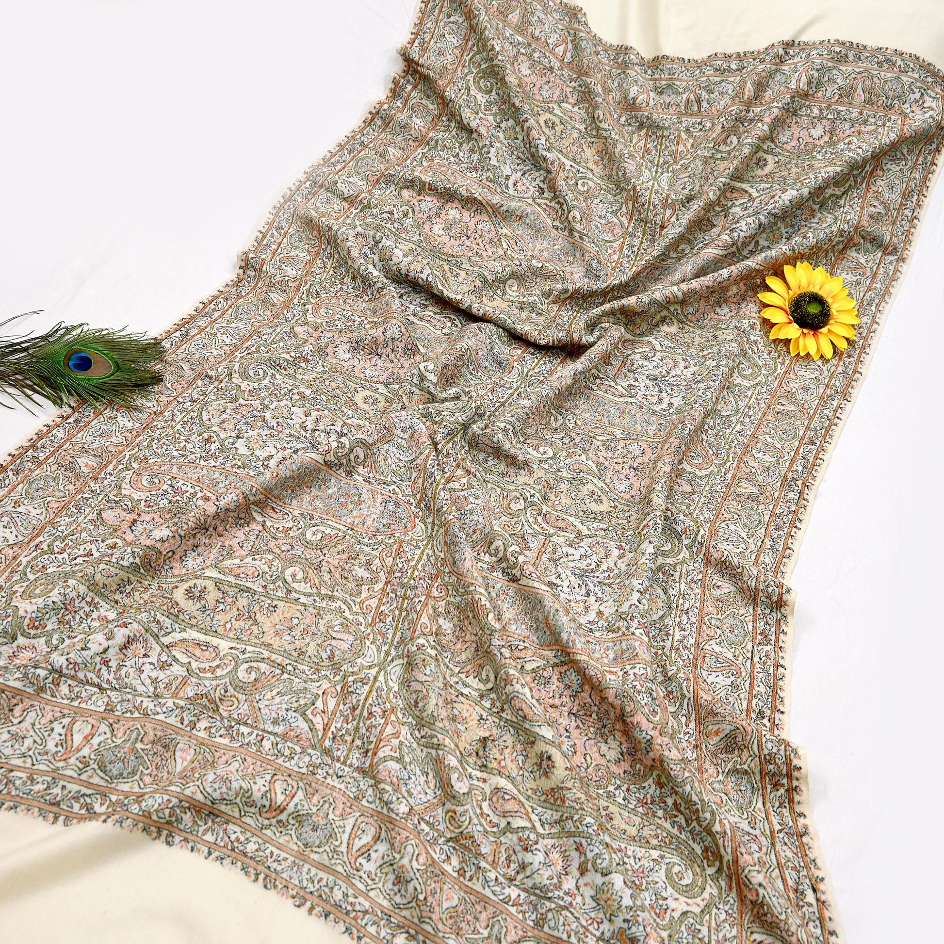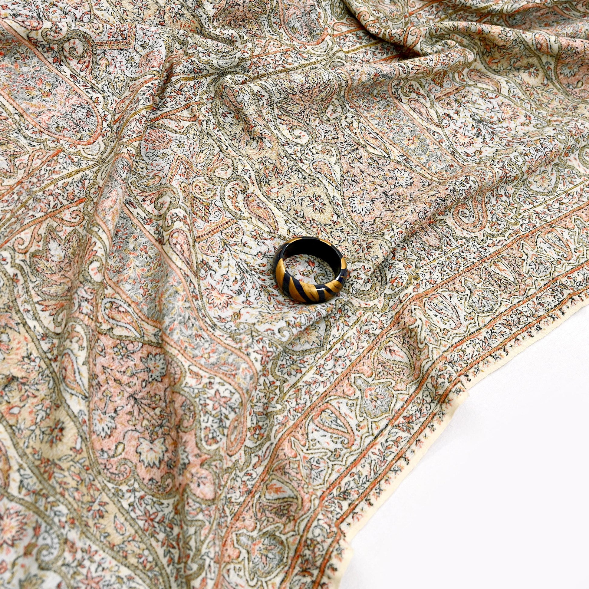 We are pleased to offer this vintage ivory-colored stole/shawl, made from 100% pure wool and adorned with stunning handwoven multicolor Paisley patterns. The woven design gracefully decorates both the center and borders, adding artistic elegance to this timeless piece.