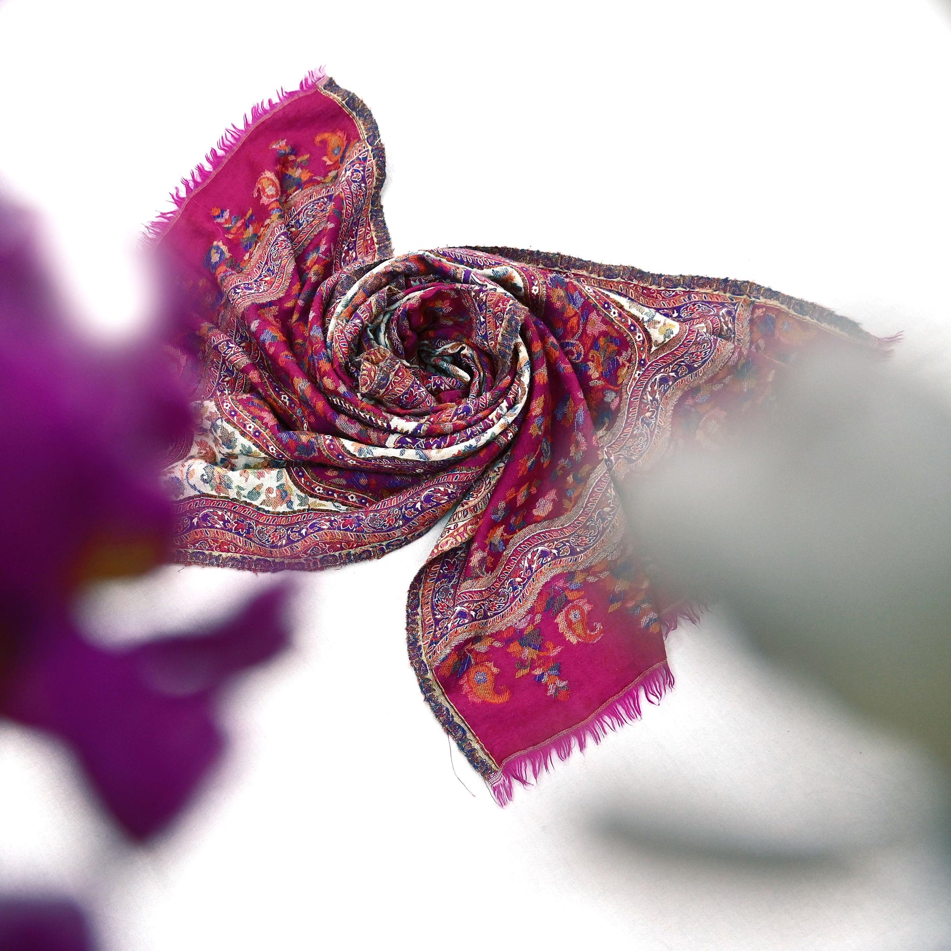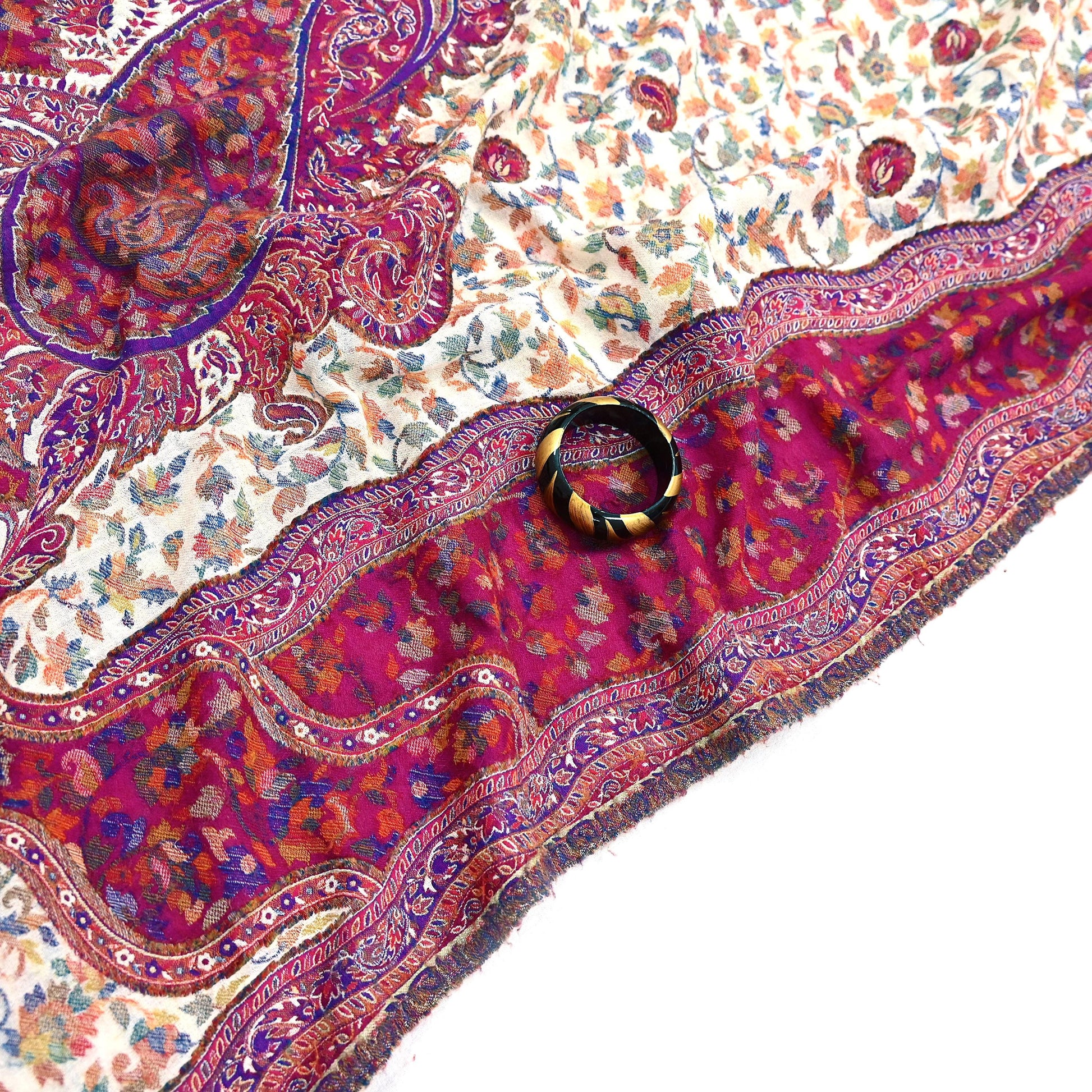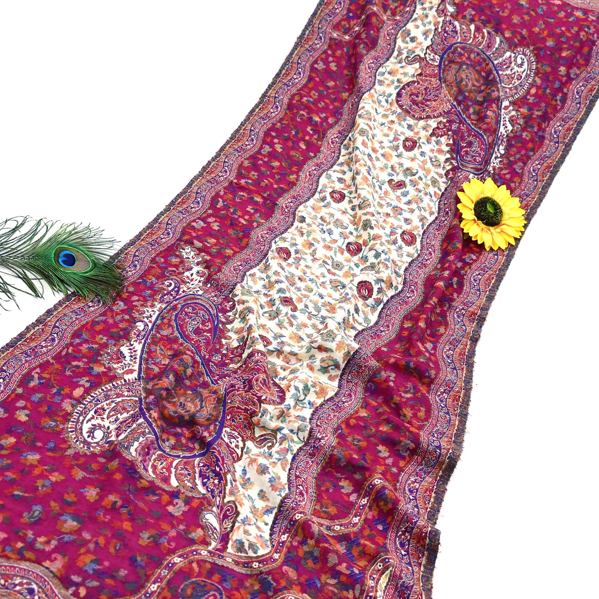 We are pleased to offer this vintage Ivory & Purple -colored stole/shawl, made from 100% pure wool and adorned with stunning handwoven multicolor Paisley patterns. The woven design gracefully decorates both the center and borders, adding artistic elegance to this timeless piece.