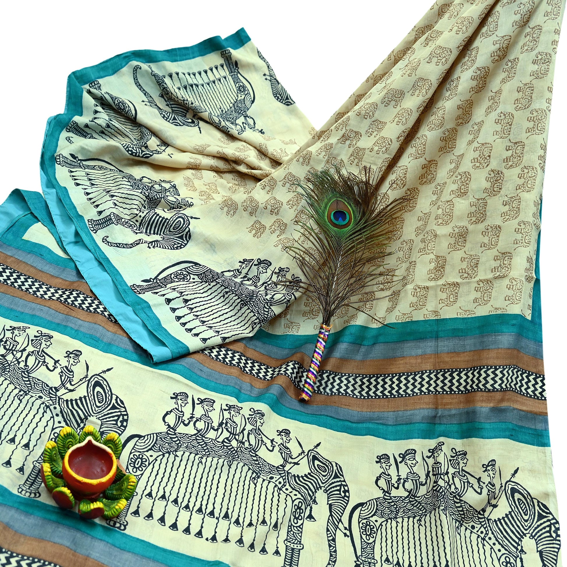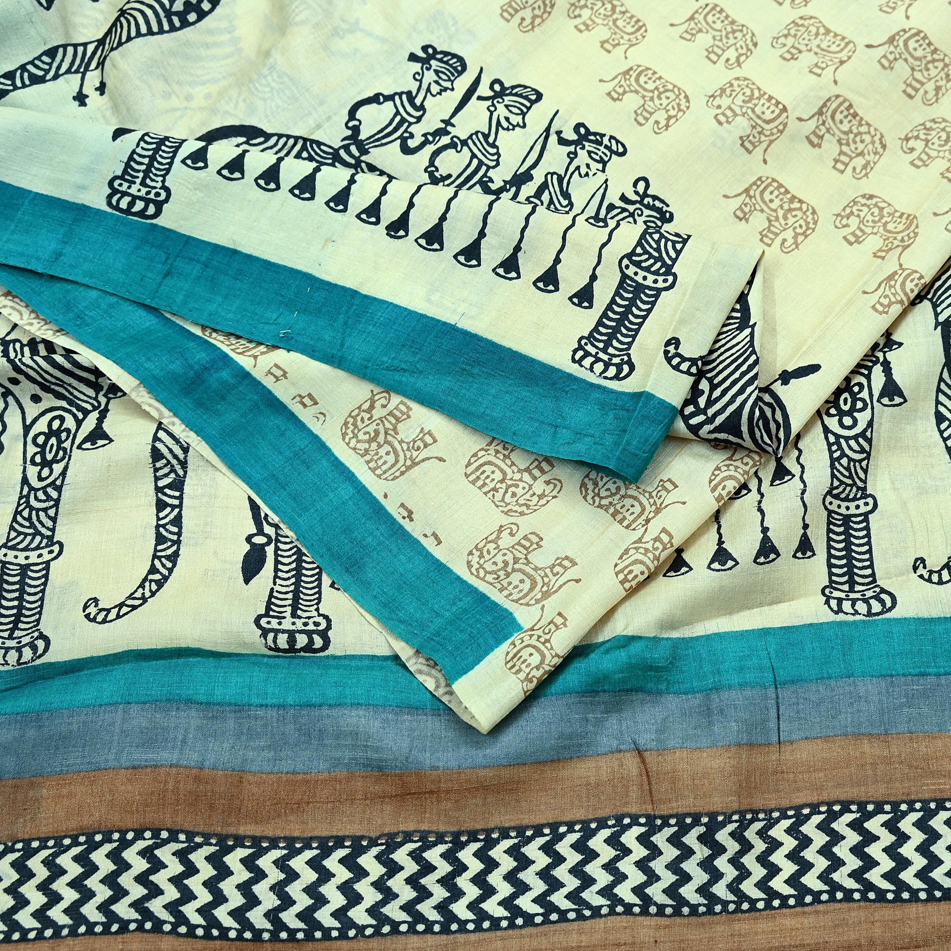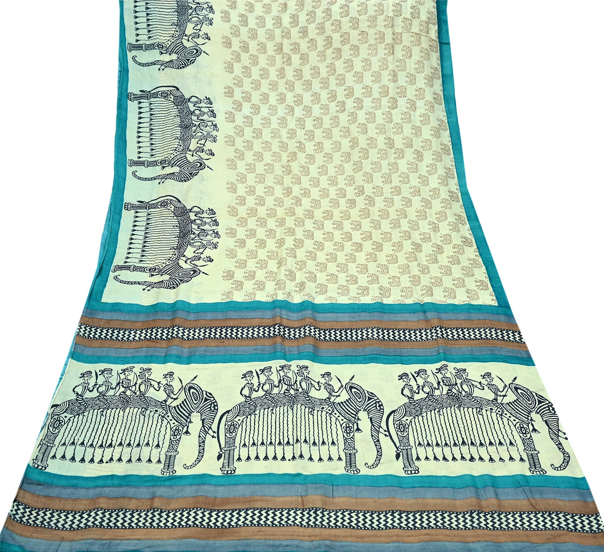 Indian Vintage Ivory Saree Pure Khadi Silk Handloom Printed Sari Fabric 6yd Ethnic Wear Sari Stripes Elephants Designs Dress making Crafting