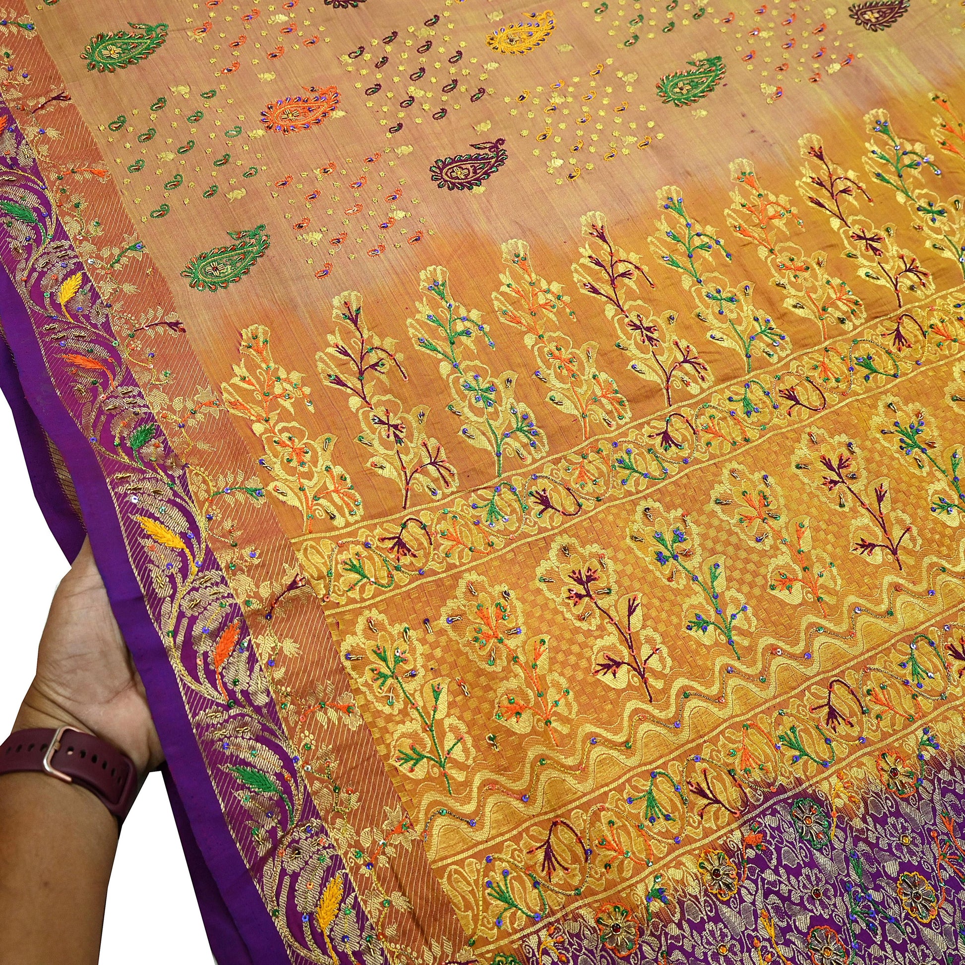 Indian Vintage Kanjivaram Saree | Heavy Hand Embroidered Pure Silk | Purple & Saffron Bridal Fabric | 5 Yards Dress Making Bollywood Sarees