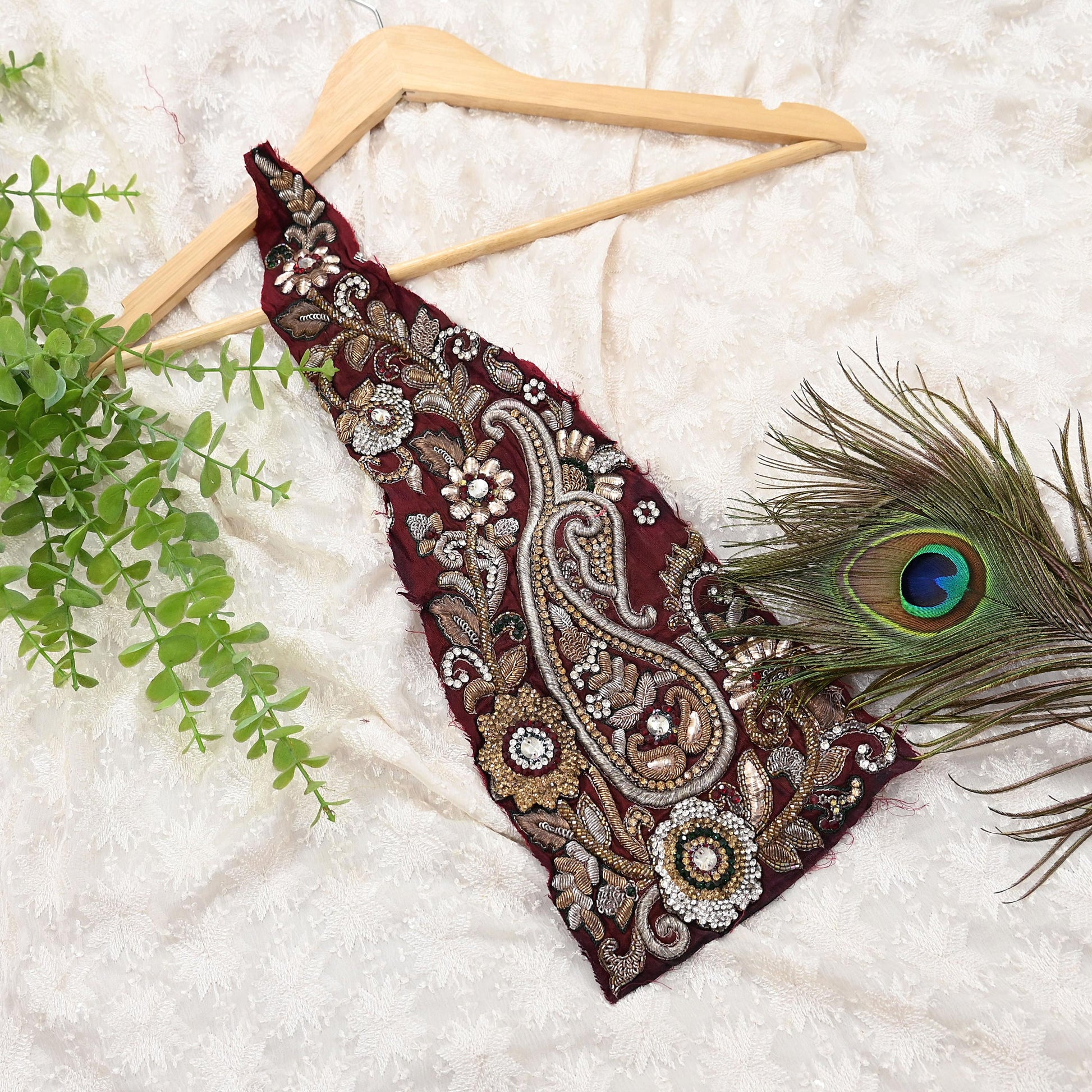 Enhance your craft with this stunning set of 1 hand-embroidered vintage appliques, cut from an elegant Chanderi sari in soft Maroon . These graceful pieces feature floral motifs embellished with golden, Red, Green & White Stones, Blue Stone, White Pearl Like beads, Silver & Golden zardozi/dabka, and zari, Green Thread embroidery, showcasing exquisite traditional Indian craftsmanship.