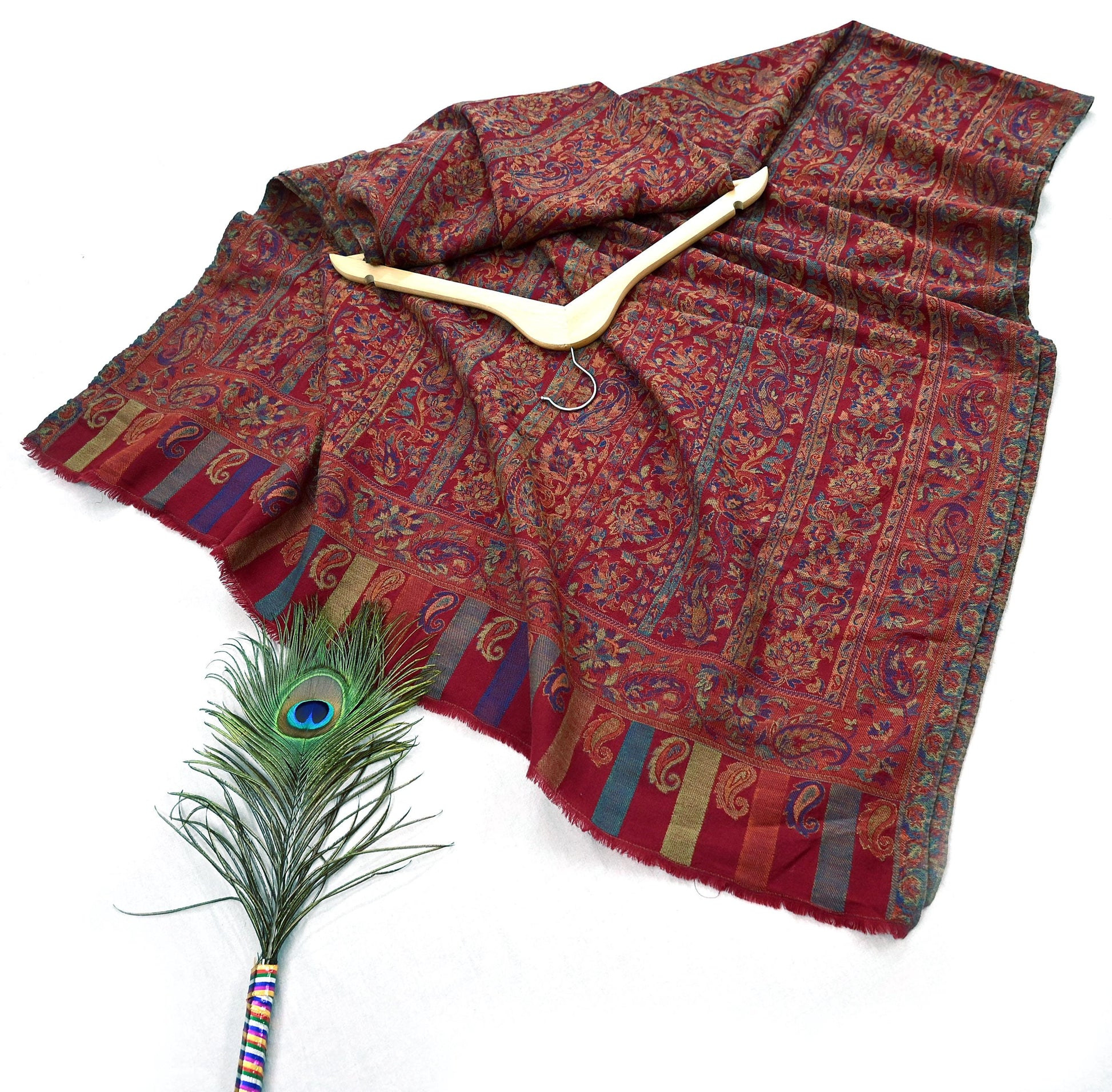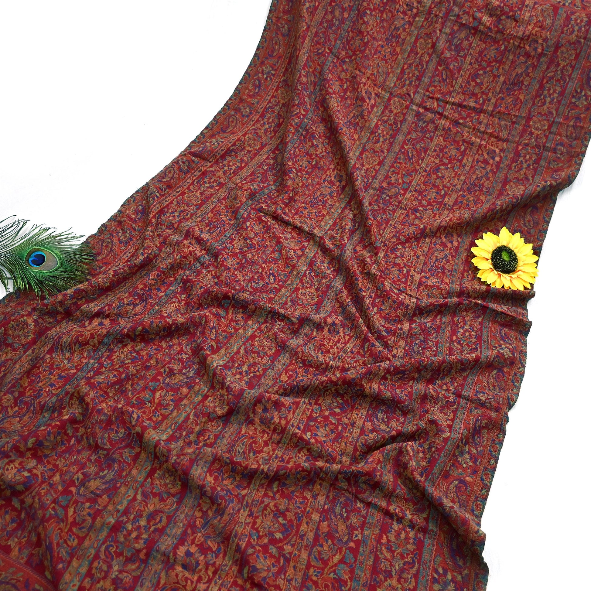Indian Vintage Maroon Pure Woolen Shawl Handmade Woven Jamawar Work Long Throw Stole Warm Paisley Design Soft