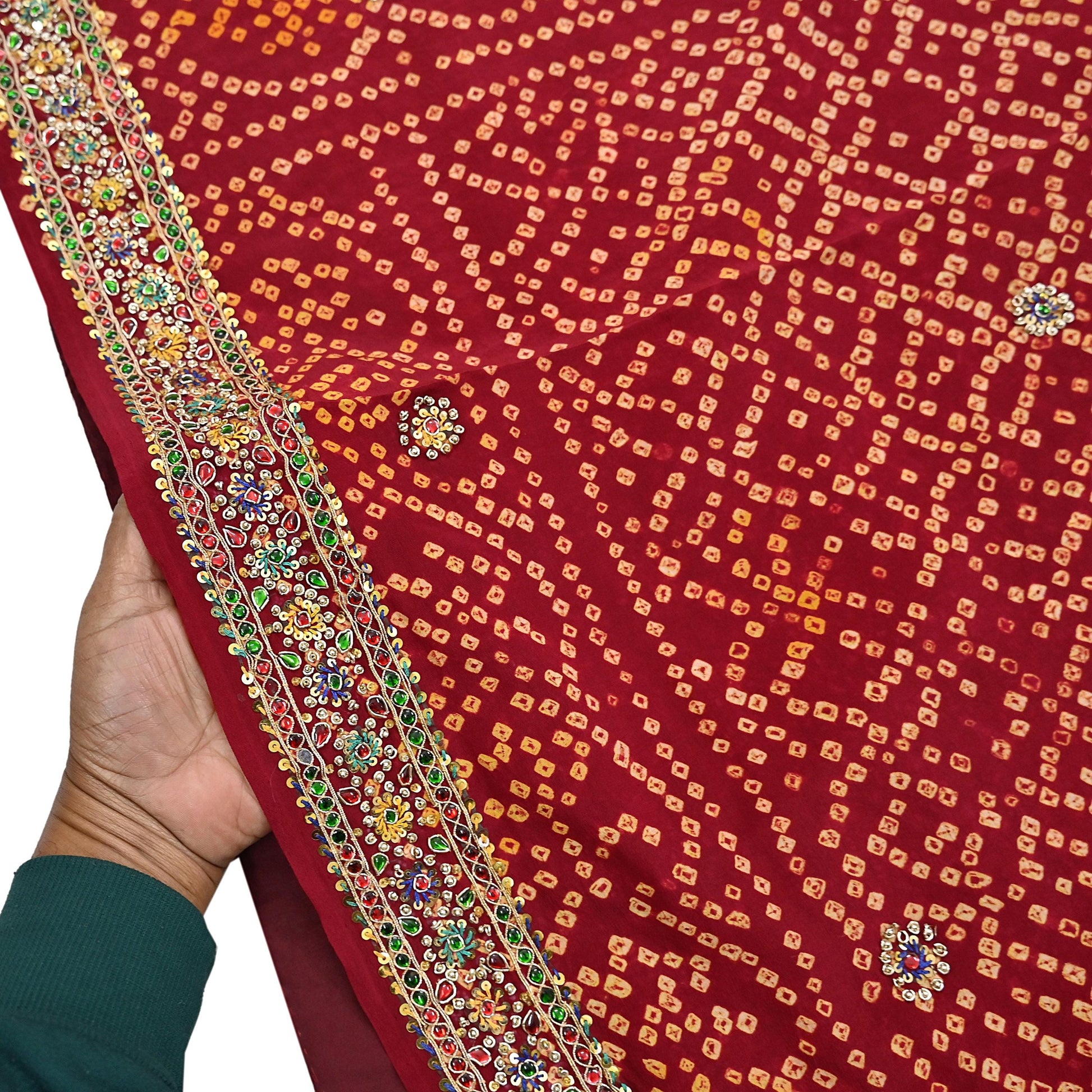 Indian Vintage Maroon Saree Hand Embroidered Bandhani Printed Sari 100% Pure Crepe Silk Indian Sari Fabric 5yard Soft Craft Fabric Beaded