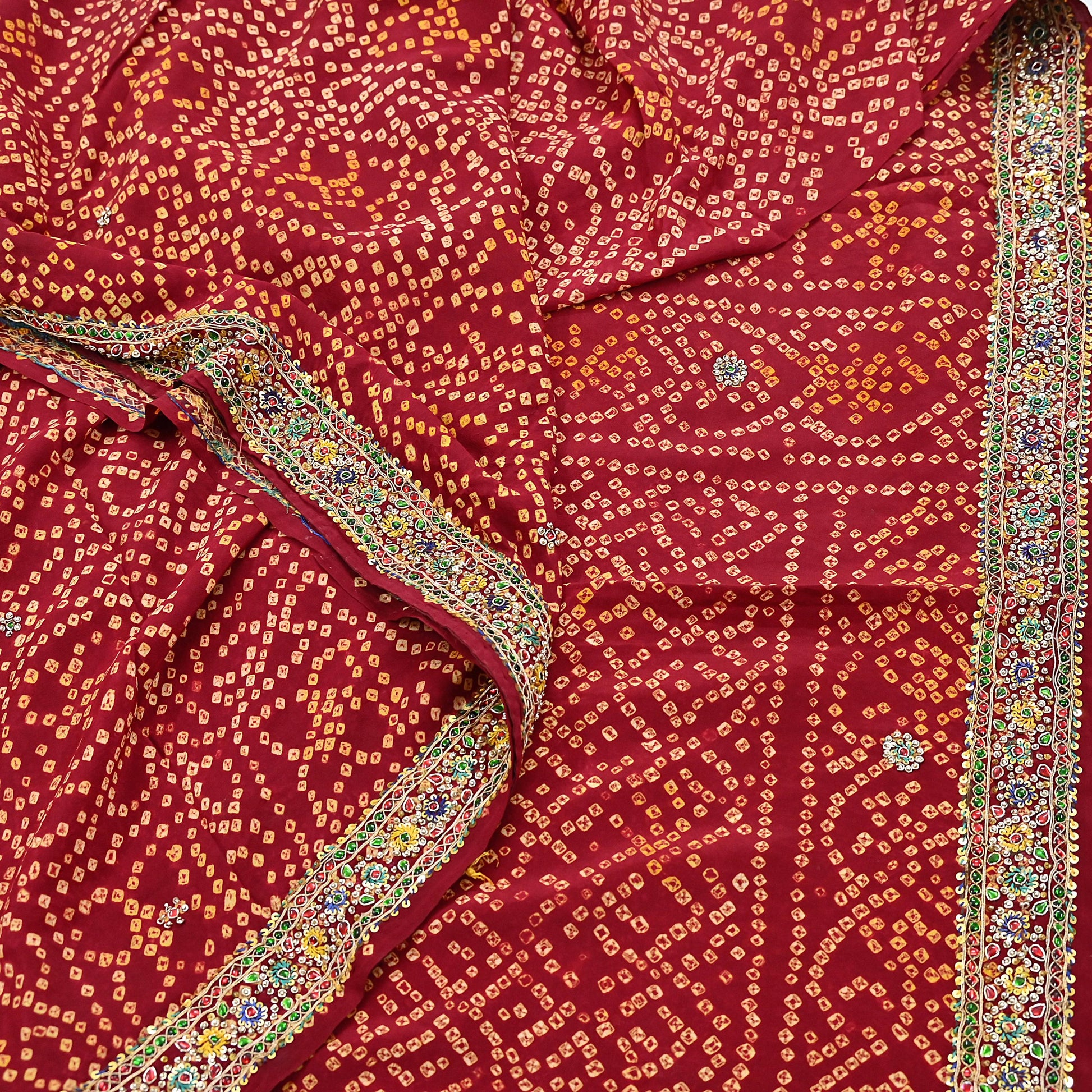 *Beautiful Maroon Colored 100% Pure Crepe Silk Hand Embroidered Bandhani printed work Sari.