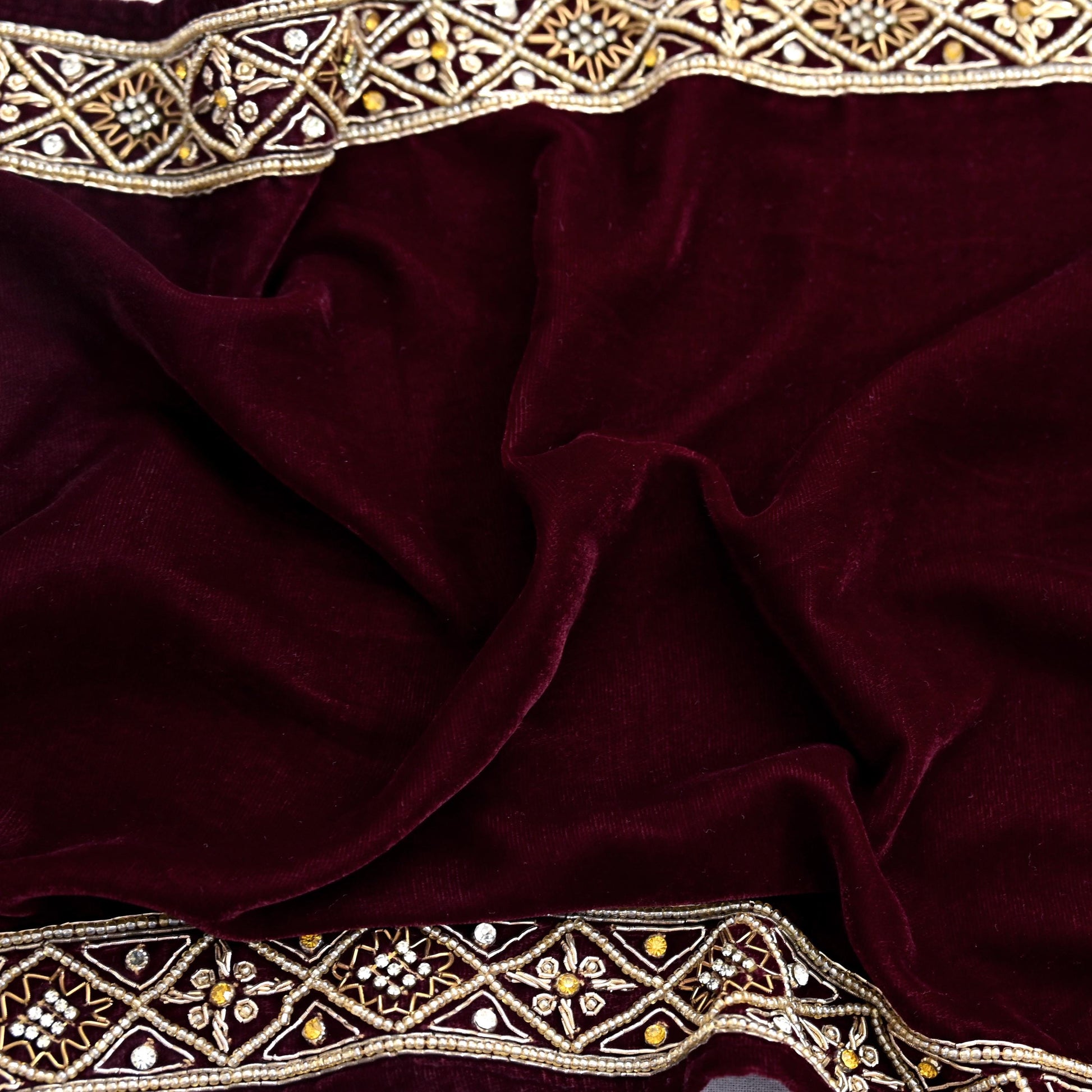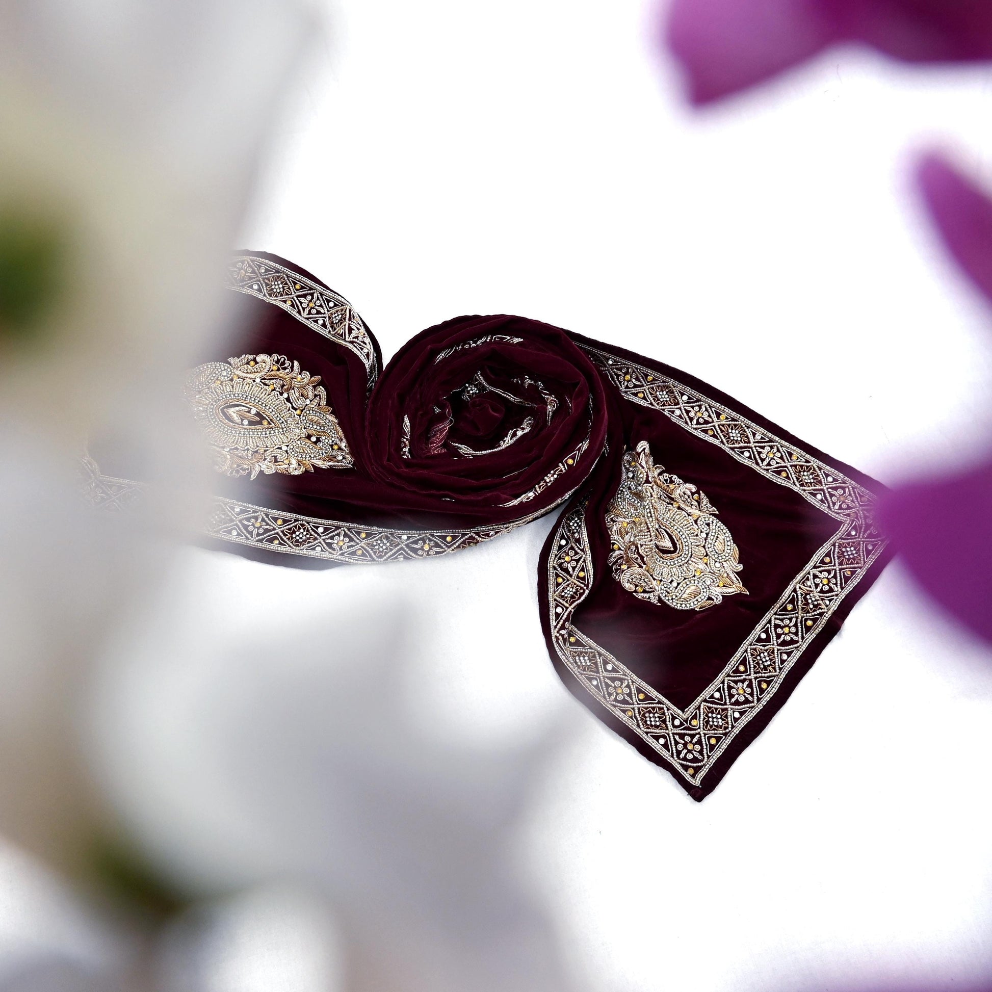 Indian Vintage Maroon Velvet Long Stole Hand Embroidered Scarves Zari Hijab Veil Wrap Bridal Dupatta Paisley