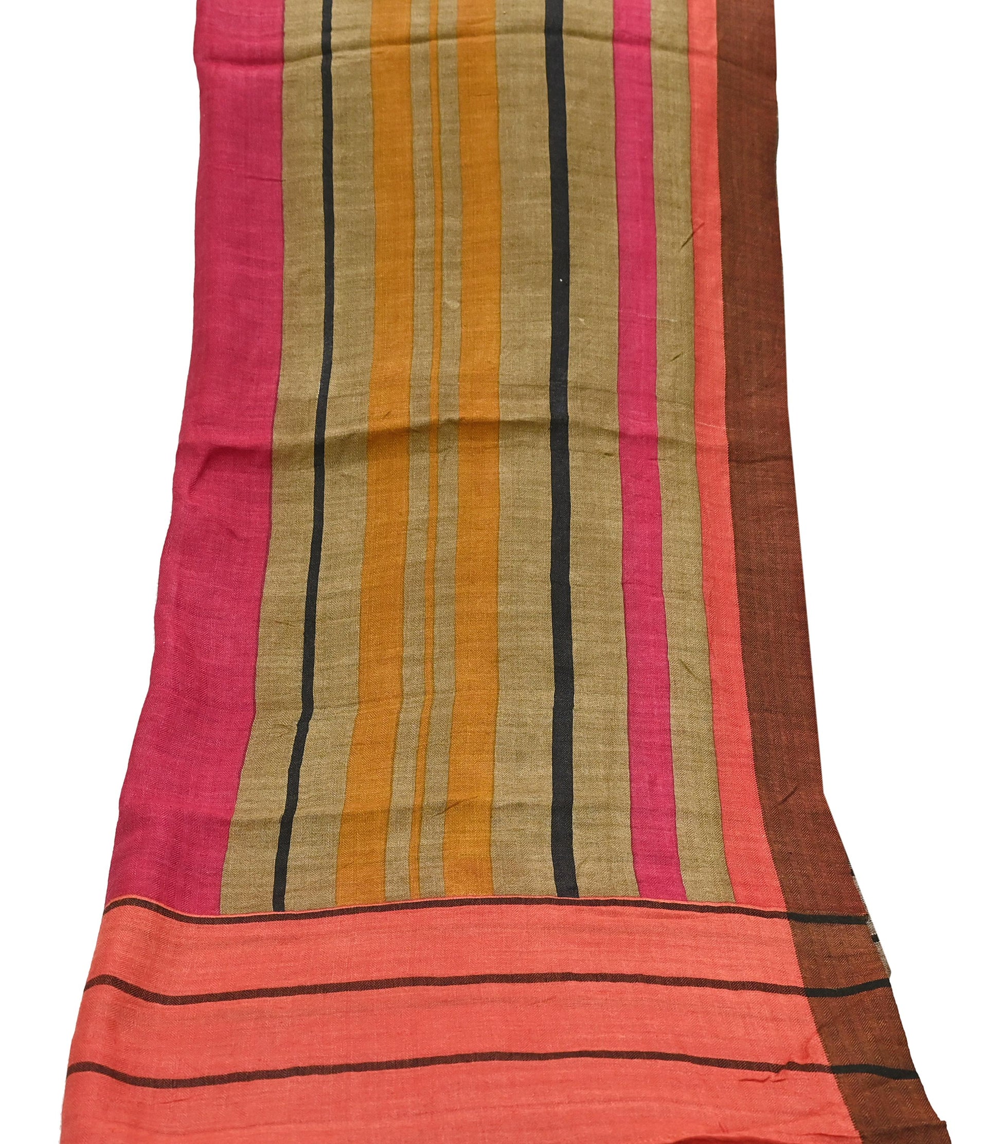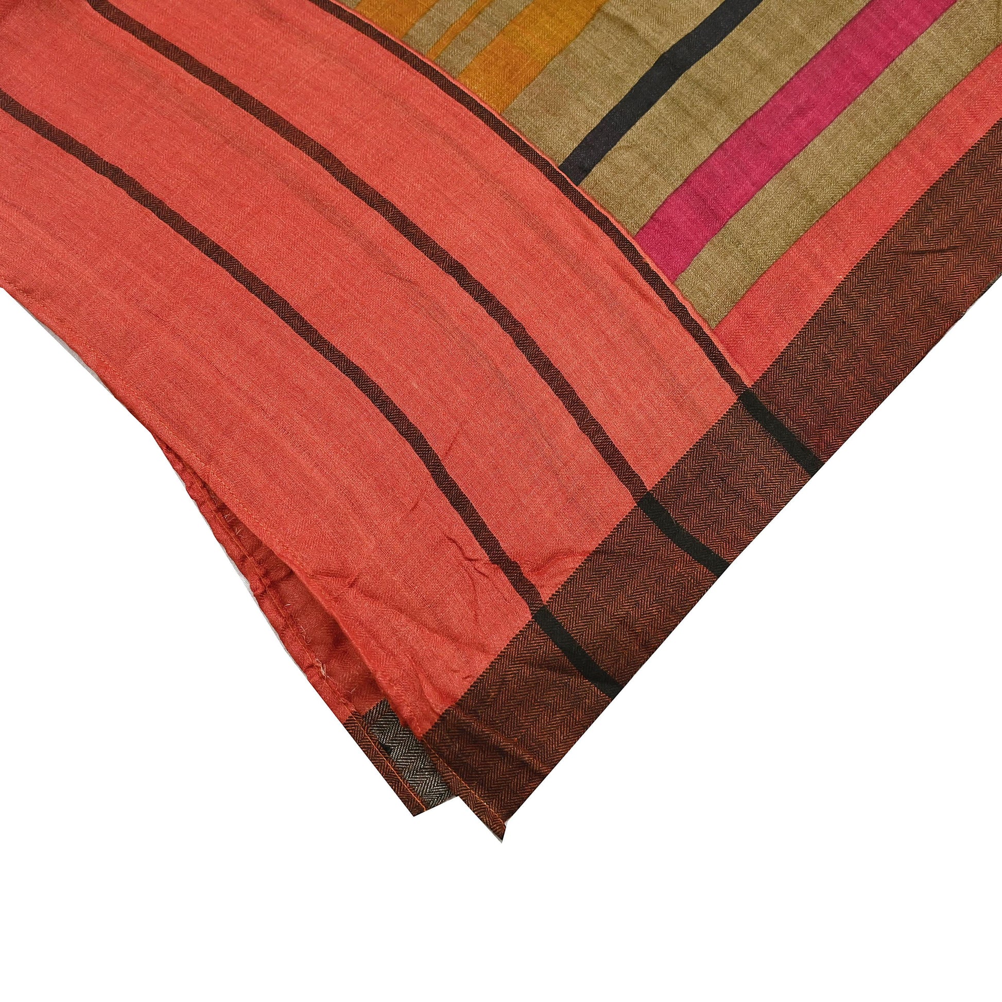 A beautiful vintage pure woolen long scarf/dupatta in Multi with printed Stripes and stripe designs, finished with a classic zigzag woven border. The dupatta is enhanced with matching Peach fringes for a traditional touch.