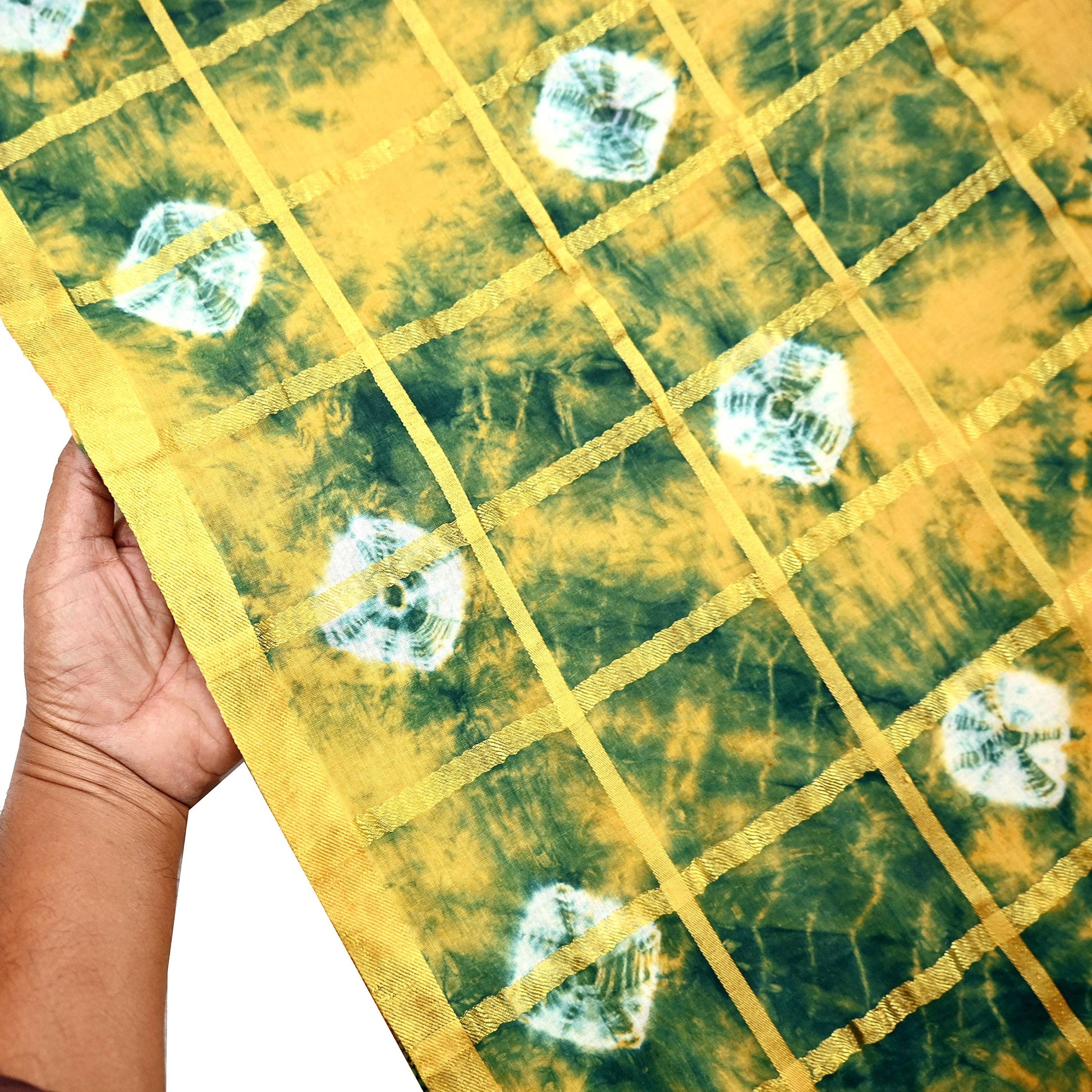*Beautiful Green, Brown & Yellow Colored Bandhani Print Woven Pure Cotton Saree.